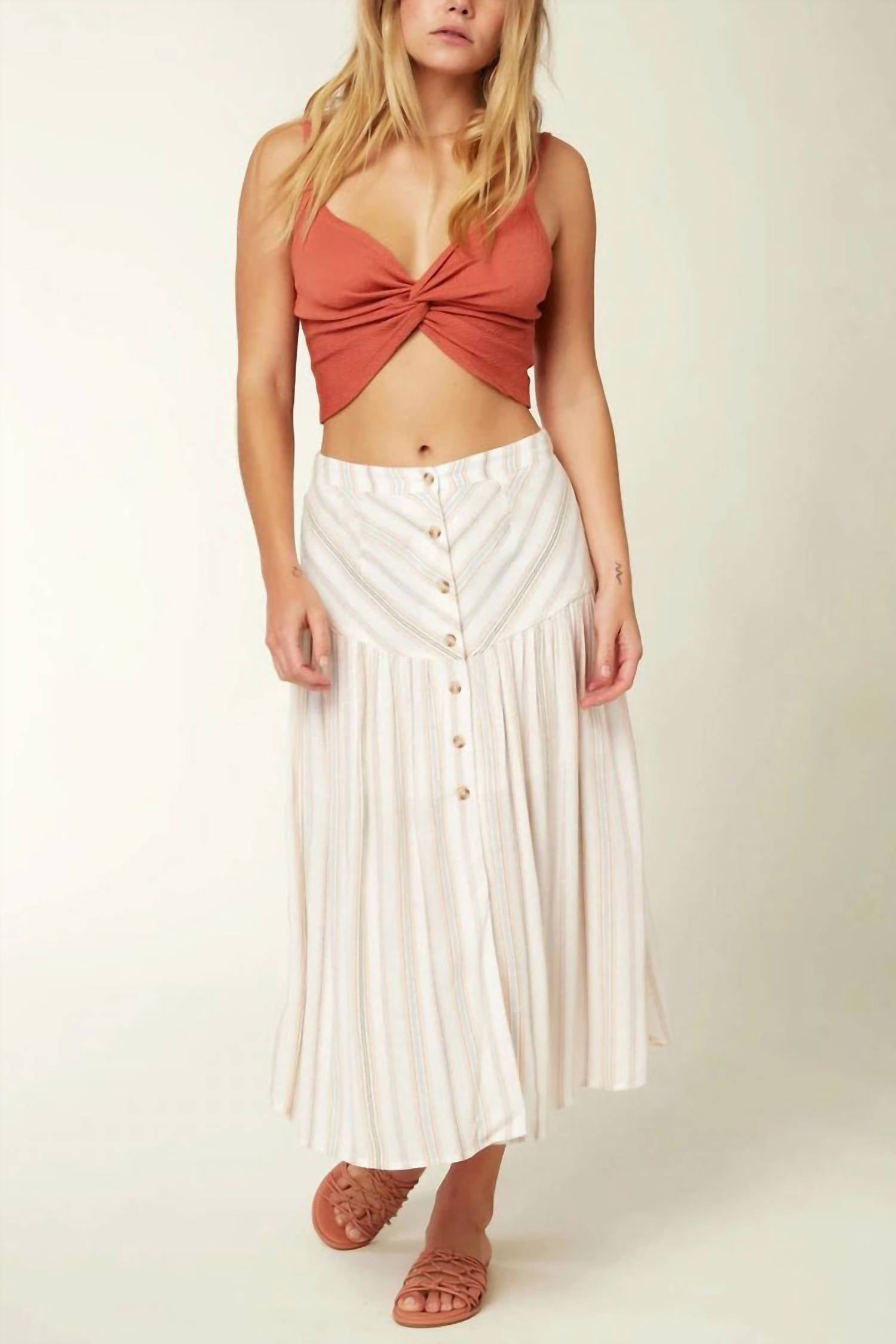 Tuck in your favorite tee for a more casual yet feminine look. The Shane Stripe Skirt by O'NEILL is a chic addition to your wardrobe, perfect for both casual and formal occasions. This woven maxi skirt features a stylish yarn dye stripe in white, with a flowy fit and a length of 30.5 inches. Crafted from a blend of 91% Viscose and 9% Cotton, it includes a front button closure for effortless wear. Care is simple with hand washing recommended.