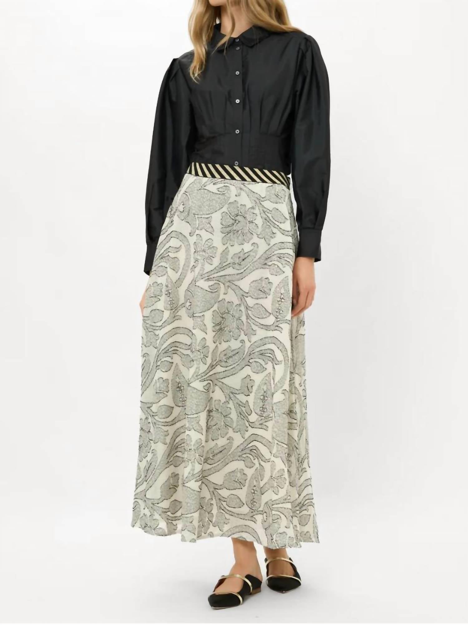 Who doesn't love a good maxi skirt? The Herod Swing Skirt by Oliphant is a captivating choice for summer getaways with its Boho Chic flair and maxi length that exudes elegance. Crafted from luxe cotton voile, this skirt is detailed with an intricate floral jacquard pattern featuring woven metallic Lurex threads, adding enchanting movement with every step. The style includes an elasticized waistband for ease and a discreet side zipper for a seamless look. For easy care, feel free to machine wash and tumble dry.