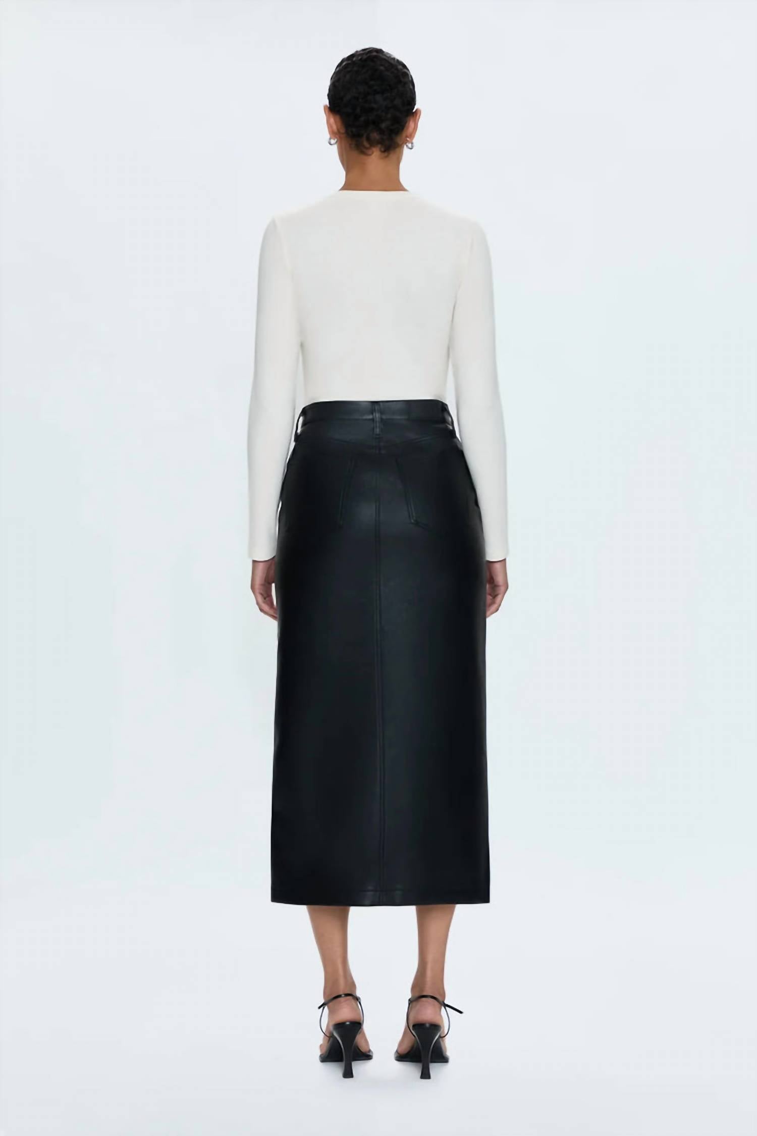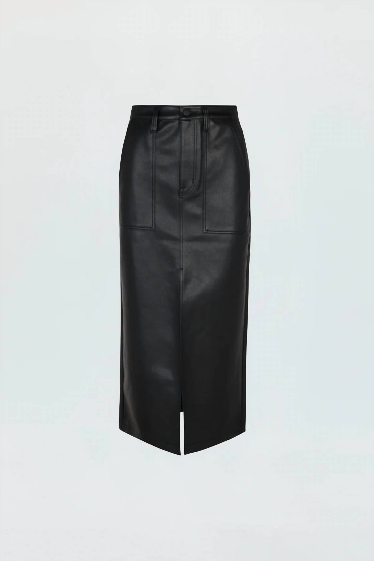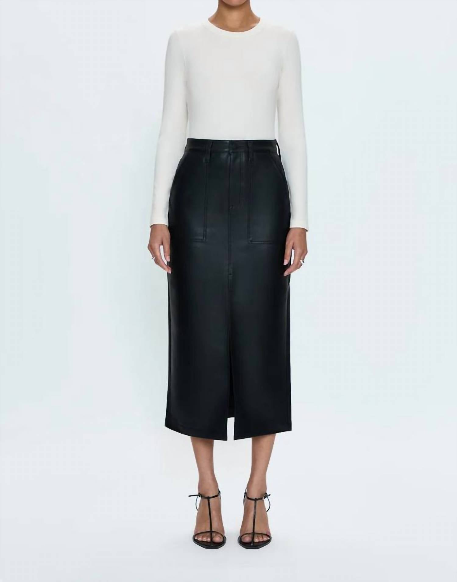 Show off just the right amount of skin in this beautifuly designed midi length skirt. Elevate your monochrome wardrobe with the Alice Utility Skirt by PISTOLA, a sleek and stylish piece in slate black. This women's midi skirt is crafted from 100% polyurethane, offering a luxurious alt leather feel. Designed with practical patch pockets and a chic front slit, it features a button closure for a polished look. For best care, dry clean or hand wash cold for longevity. Imported quality with a focus on contemporary utility.