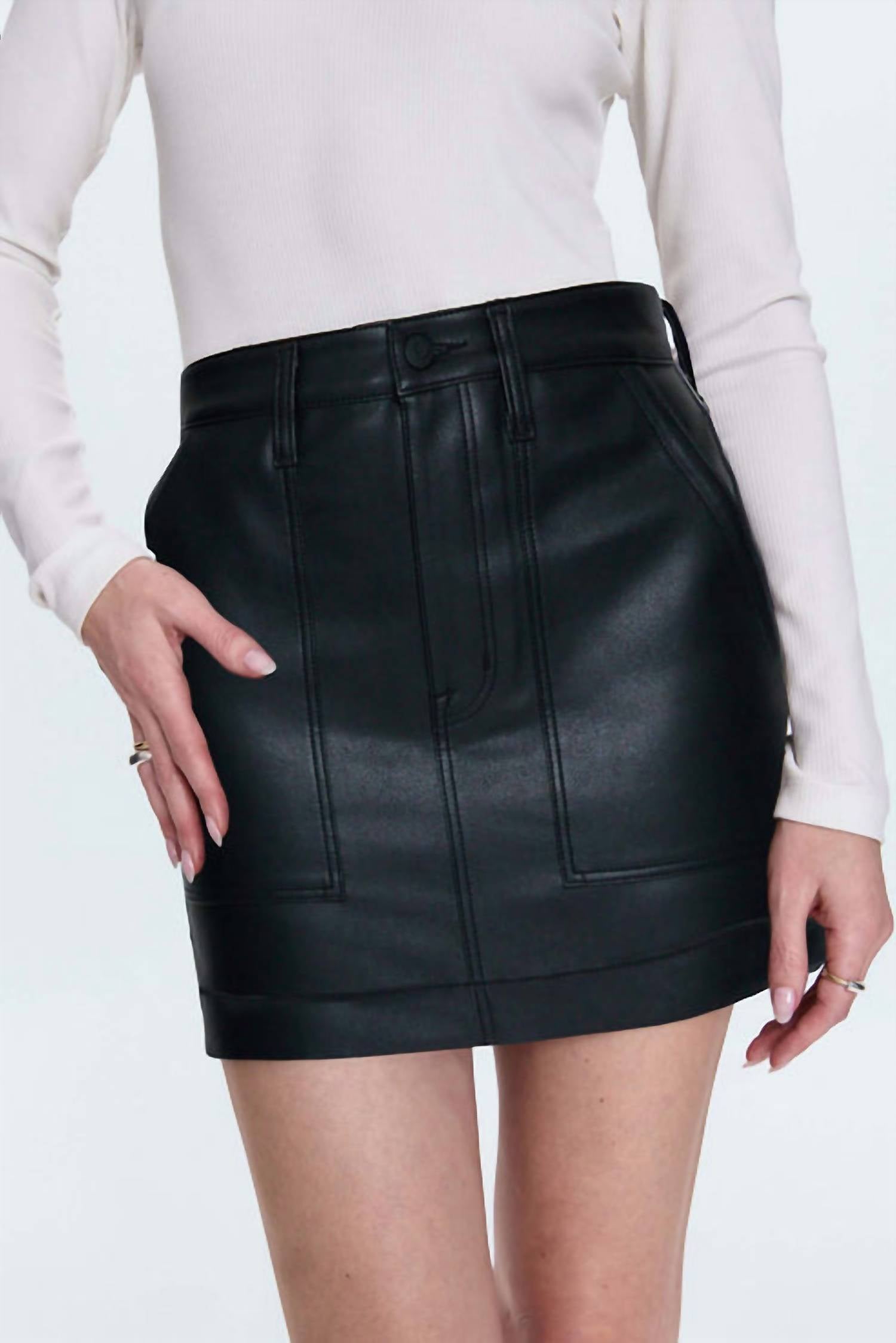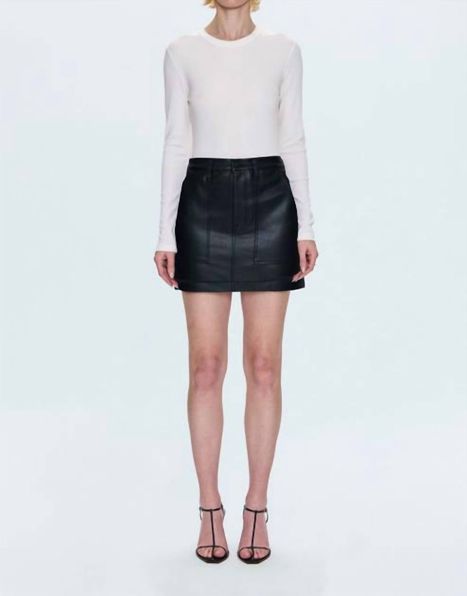 Tuck in your favorite tee for a more laid-back vibe. Elevate your wardrobe with the Skye Utility Mini Skirt by PISTOLA, designed for a chic, utilitarian look in Slate Black. This mini-length skirt features a high-rise fit with a button closure and is crafted from a leather-like finish made of 100% polyurethane and polyester for a structured silhouette. Length: 15". Care: Hand wash and line dry.