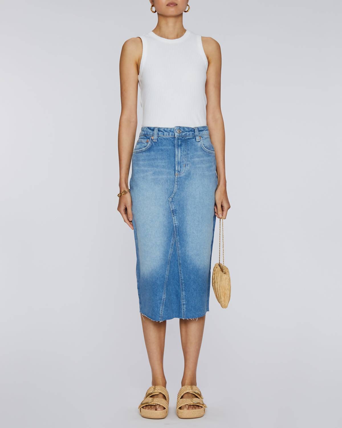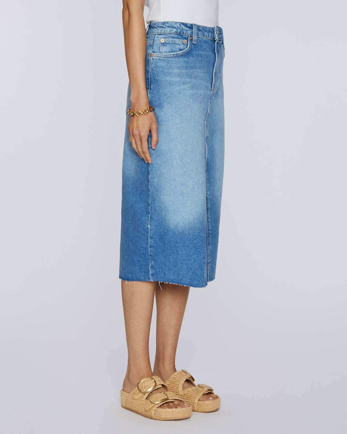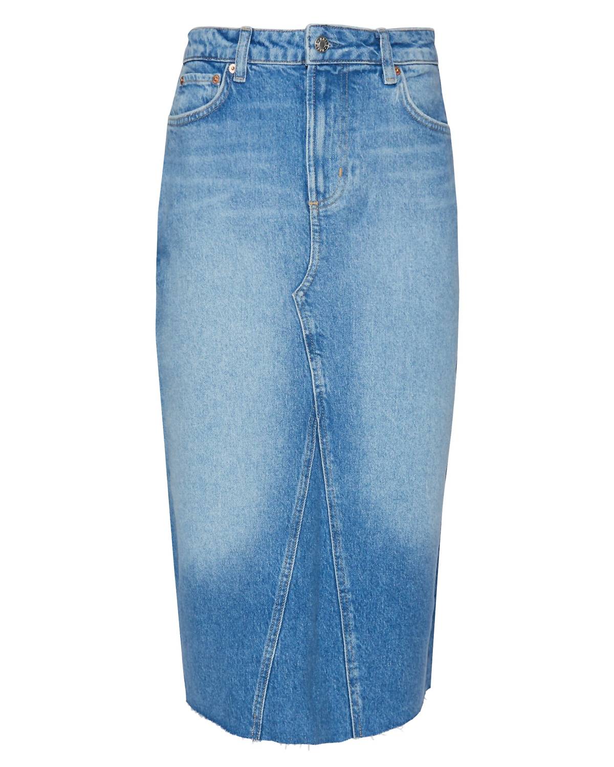 Show off just the right amount of skin in this beautifuly designed midi length skirt. Opt for a sustainable style statement with the Highland Denim Midi Skirt by Rails, presented in a vibrant Baja Blue Raw Hem. This high-waist skirt features a 5-pocket design, raw hem, and zip fly with button closure. Composition: 40% Recycled Cotton, 42% Lyocell, 17% Cotton, 1% Elastane. Care instructions: Machine wash. Embrace summer streetwear and perfect your vacation wardrobe with this solid, cotton blend piece.