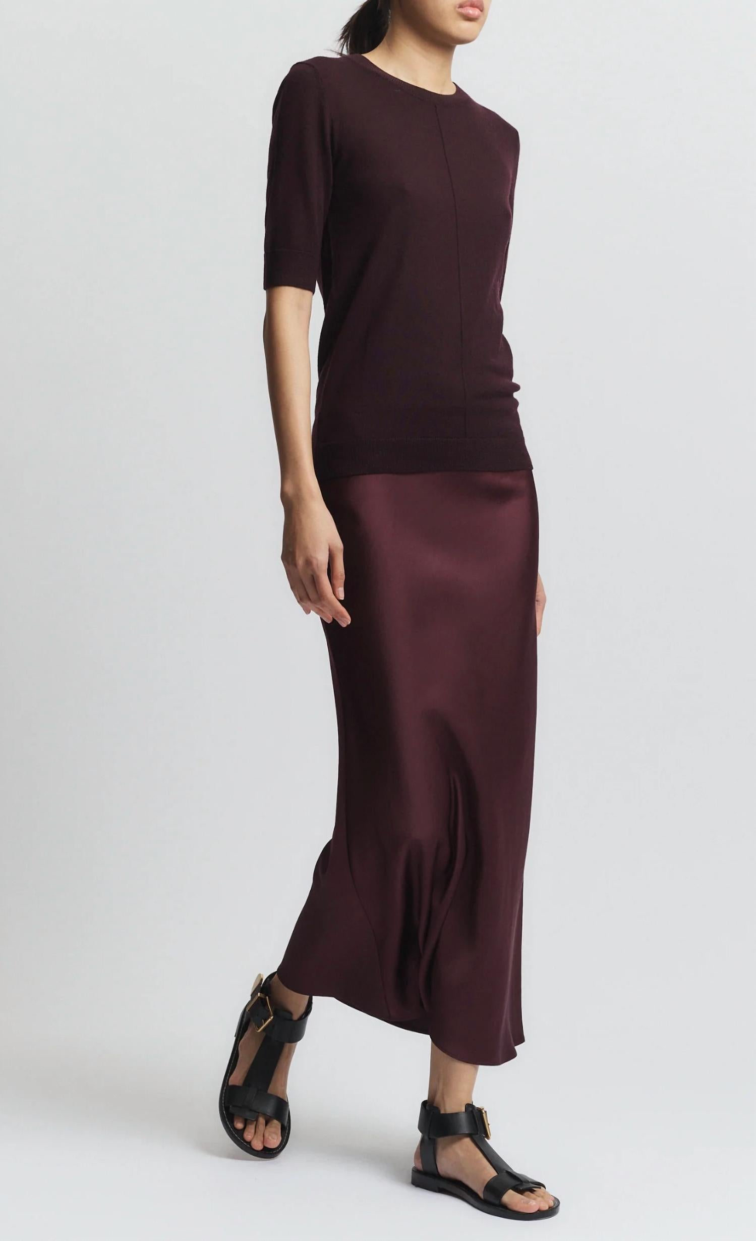 Tuck in your favorite tee for a more casual yet feminine look. Elevate your wardrobe with the Saint Art Talia Charmeuse Maxi Skirt in a sophisticated grape hue. This women's maxi skirt is crafted from a blend of 64% viscose and 36% polyester, featuring a bias cut for a flattering drape and an elastic waistband for comfort. Originating from a design that embraces quiet luxury, this skirt includes a practical zip closure. For care, it's machine washable and best air-dried, maintaining a polished look with minimal effort.