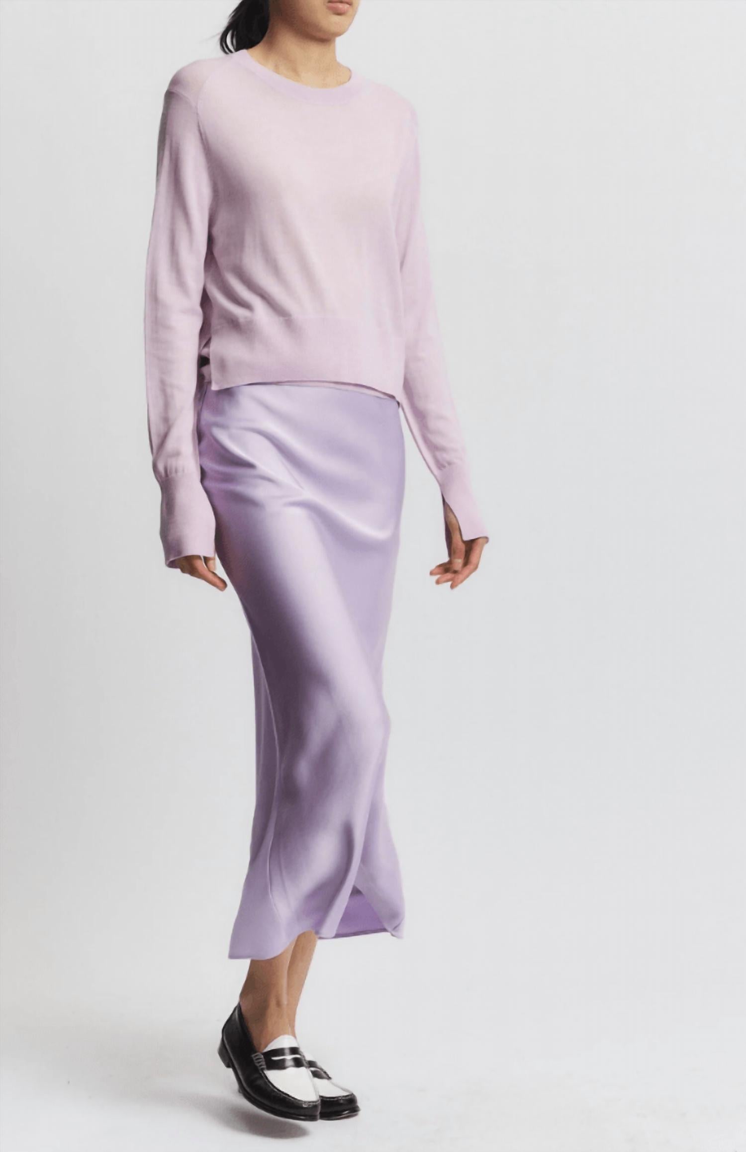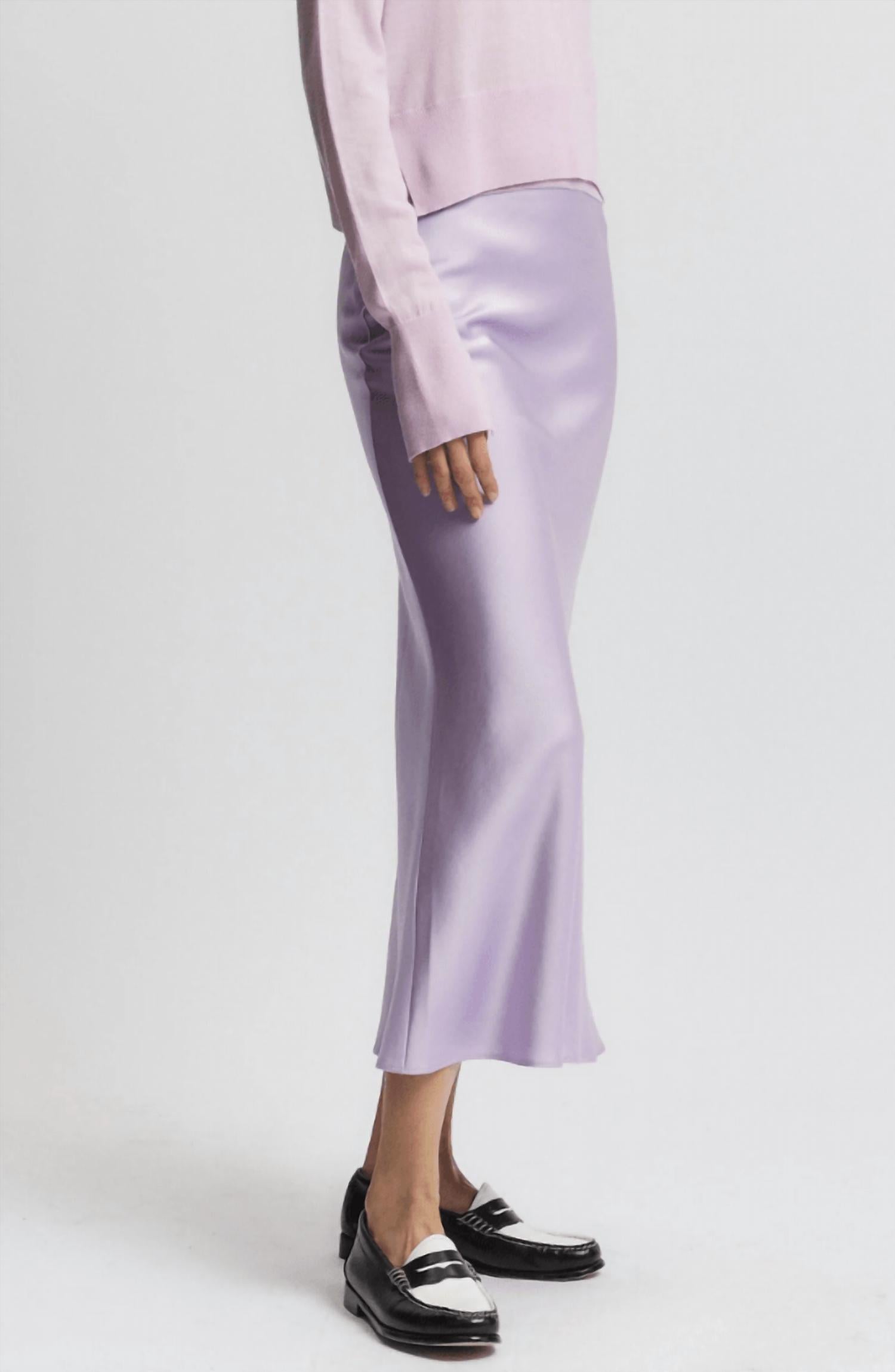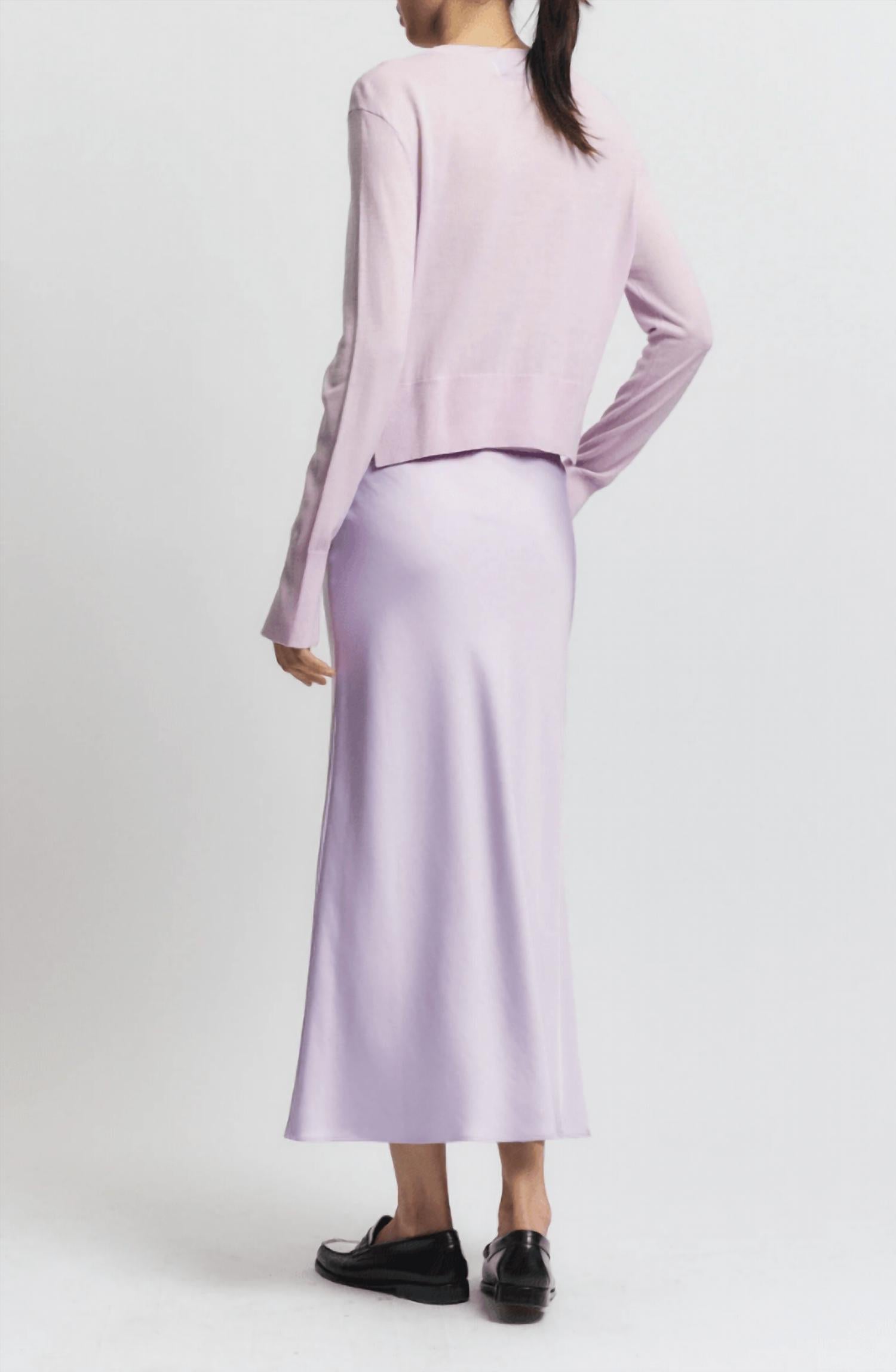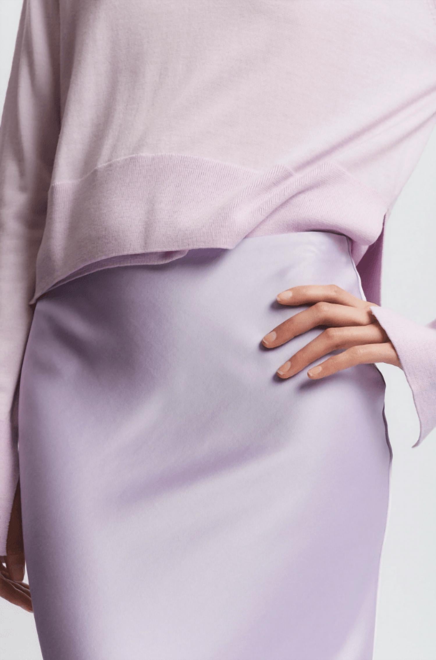 Flowy, comortable and stylish. This maxi skirt is a fan favorite. Step into refined elegance with the Talia Charmeuse Maxi Skirt by Saint Art, available in a sophisticated lilac hue. Crafted from a luxurious heavy weight satin charmeuse, this skirt features a bias cut and midi length for a flattering and graceful drape that follows your silhouette. The elastic waistband ensures a stylish yet comfortable fit, while the pull-on closure adds convenience to your daily dressing. This non-wrinkle skirt is composed of 64% viscose and 36% polyester, and it is machine washable, making it a practical choice for your spring wardrobe. The model is 5’9” and wearing a size small.
