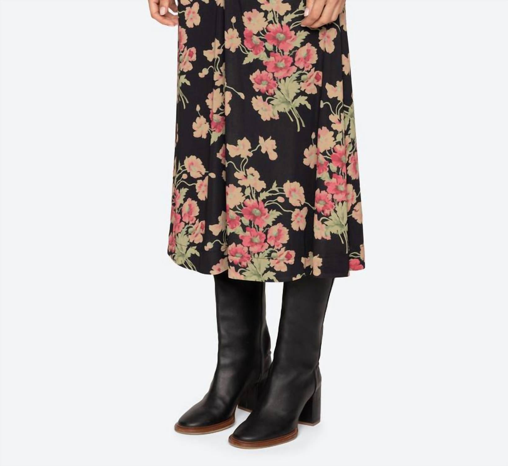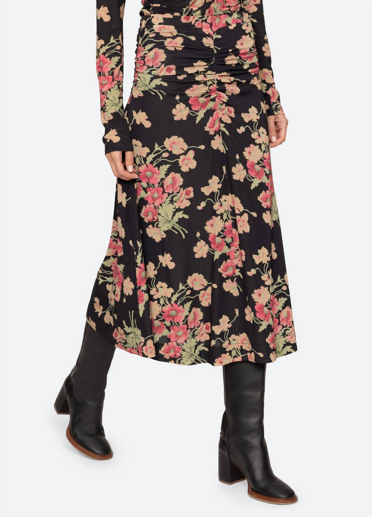 Tuck your favorite tee into this midi length skirt for an effortlessly cool look. Unveil spring sophistication with the Cornelia Print Midi Skirt by SEA, crafted for women who celebrate the Maximalist trend. This midi skirt in Black Multi features a striking floral pattern with a comfortable pull-on elastic waistband, offering a slimmer fit silhouette. Composed of 97% viscose and 3% elastane, with a lining of 93% polyester and 7% elastane, it's perfect for a Mother's Day holiday party. Care for your skirt by hand washing and laying it flat to dry, ensuring longevity in your wardrobe. Model is 5'10" and wearing a size S.