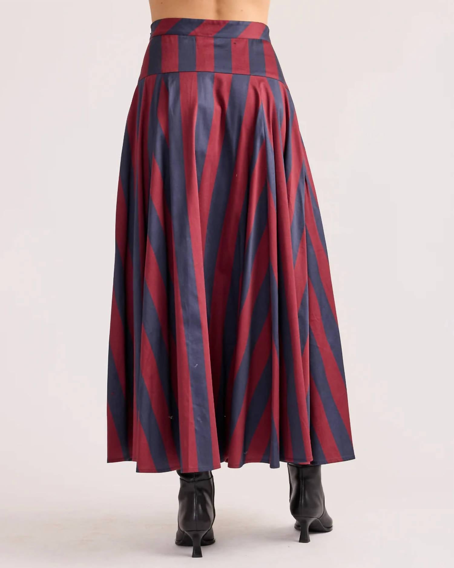 Tuck your favorite tee into this midi length skirt for an effortlessly cool look. Introducing the Edith Skirt by Sedge in charming Vineyard Stripe, a perfect addition for a spring vacation. This midi-length skirt is crafted from a cotton blend consisting of 98% cotton and 2% spandex, ensuring a comfortable fit with its pull-on closure. The stripe pattern evokes a 90s fashion vibe, adding a touch of nostalgia to your wardrobe. Care is a breeze with machine wash cold and tumble dry low instructions, keeping maintenance effortless.