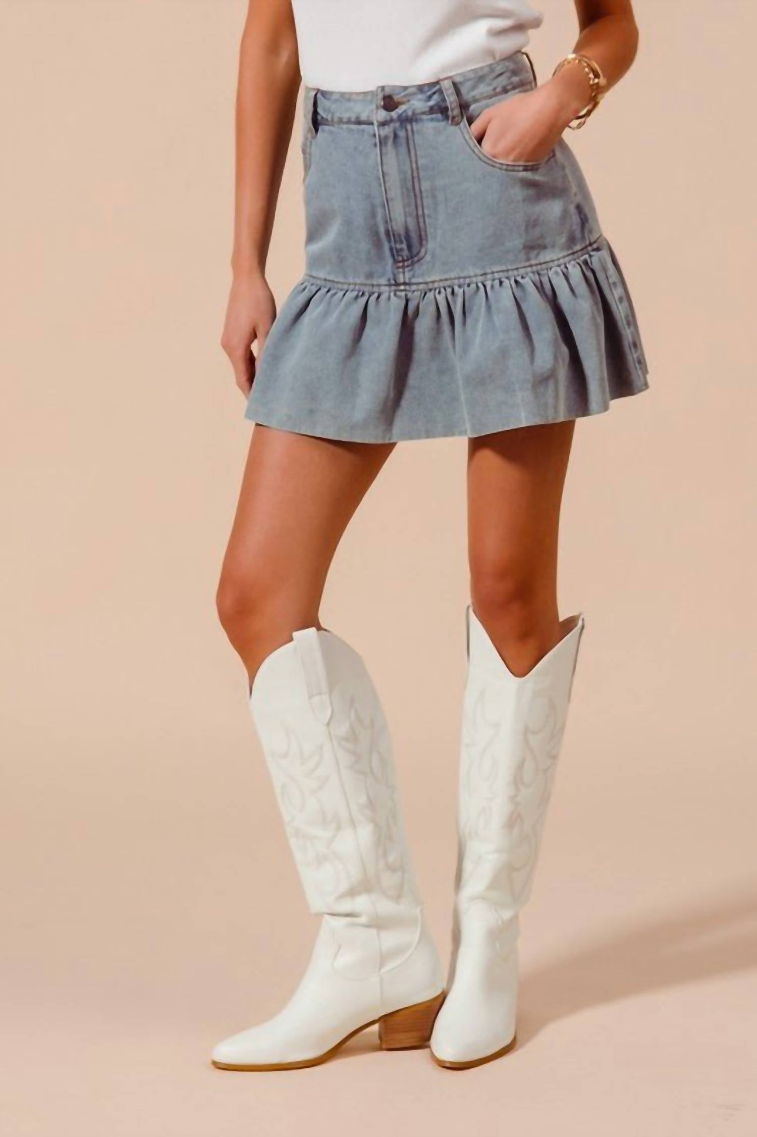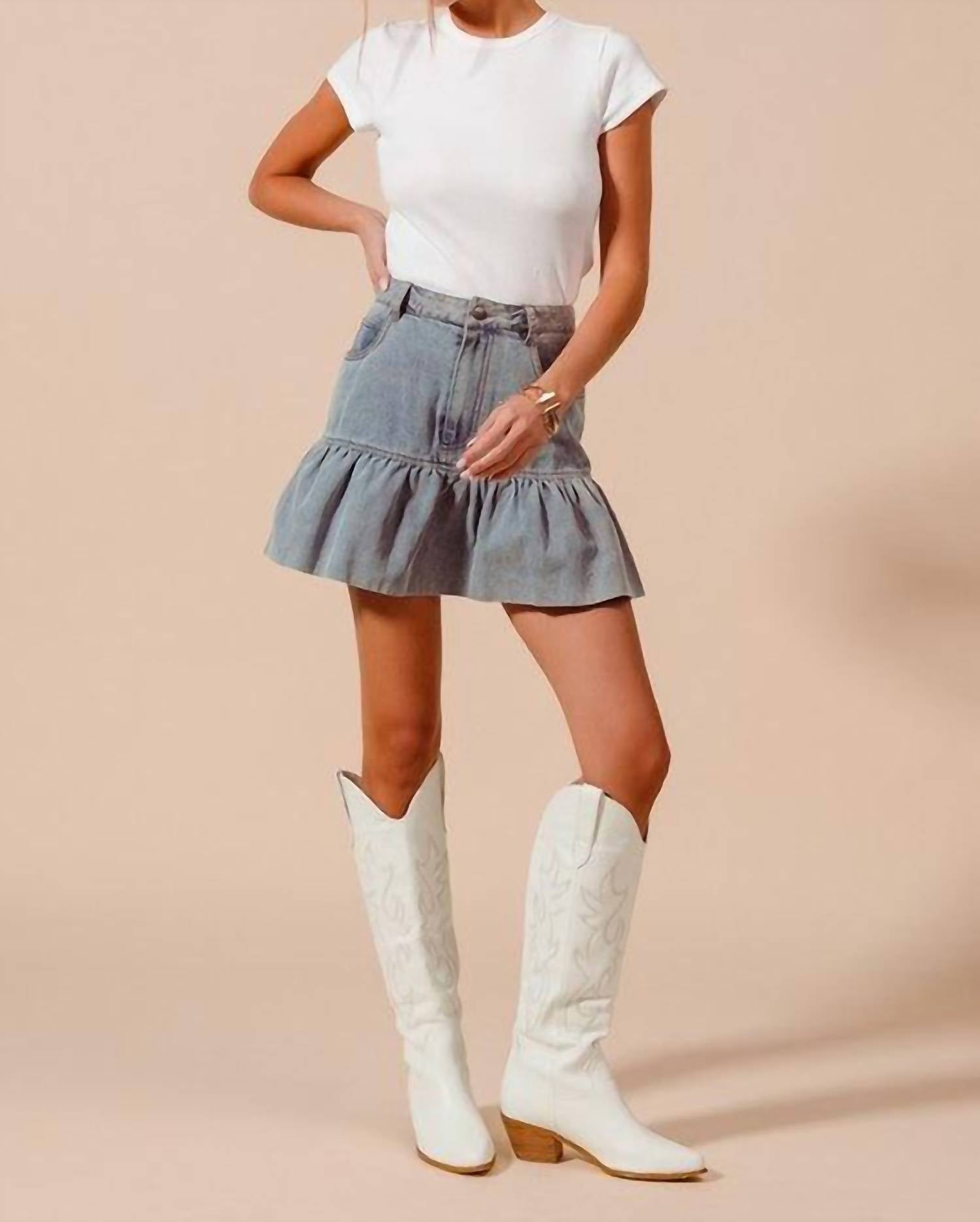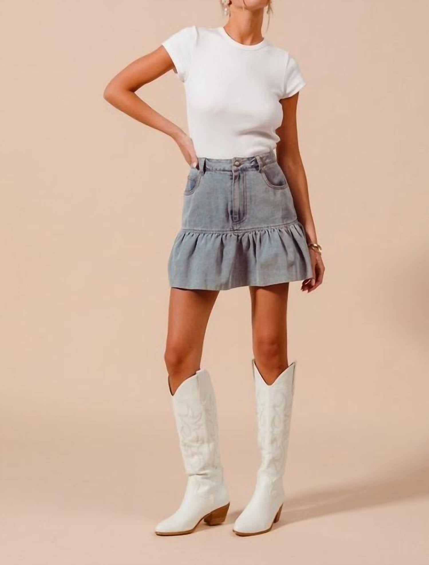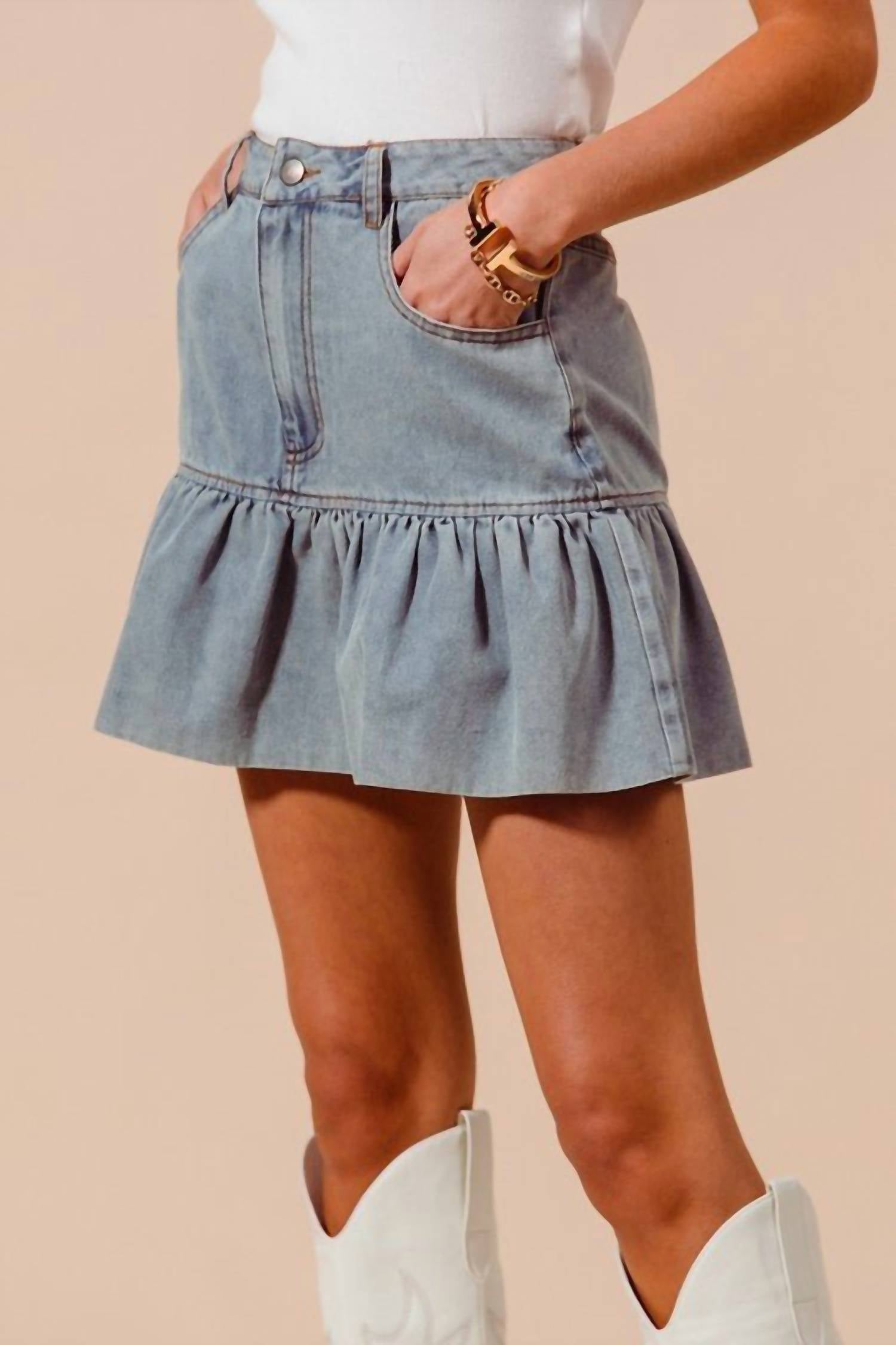 Elevate your wardrobe with the Dallas Ruffled Skirt by So Me, a chic denim piece perfect for any fashion-forward woman. This skirt is crafted from a cotton blend (90% Cotton, 10% Polyester), featuring a playful ruffled hem and practical pockets for added flair. With belt loops and a convenient button zipper closure, it effortlessly combines style and functionality. Care for it easily with machine wash, and enjoy the true-to-size fit available in a range of sizes.