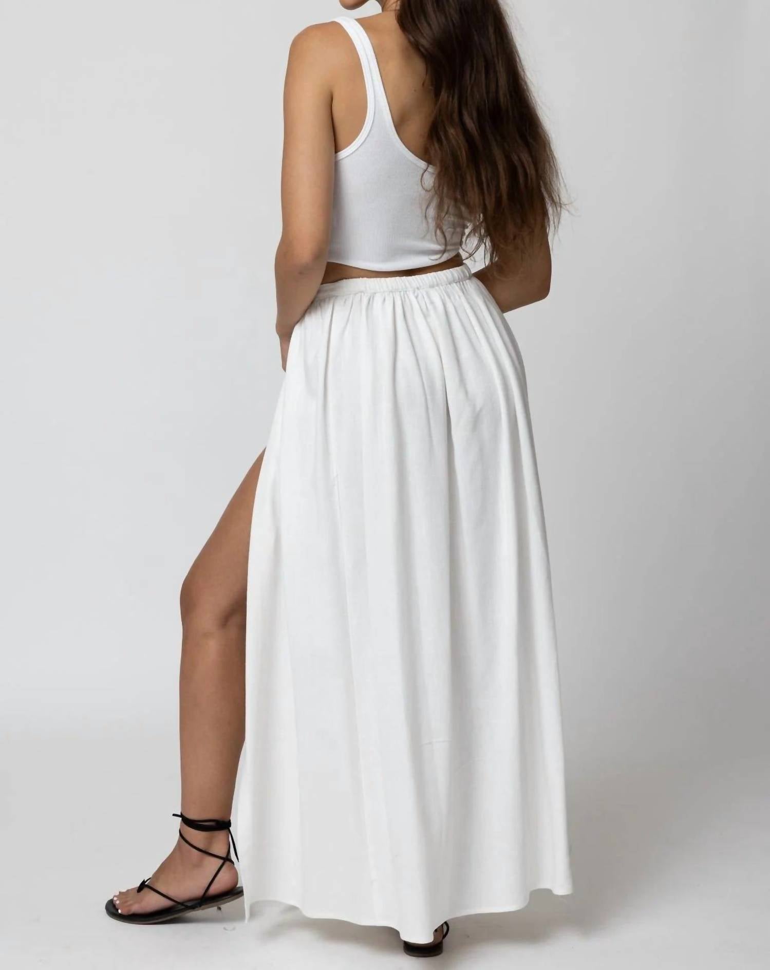 Who doesn't love a good maxi skirt? The Button Wrap Maxi Skirt by Stillwater is a stylish addition to your summer wardrobe, perfect for holiday parties or casual outings. This solid white skirt is crafted from 70% Rayon and 30% Linen, ensuring comfort and breathability. It features an elastic back and narrow waistband for an effortless fit and a wrap front with a three-button closure for versatile styling. Care for this piece by hand washing and line drying.