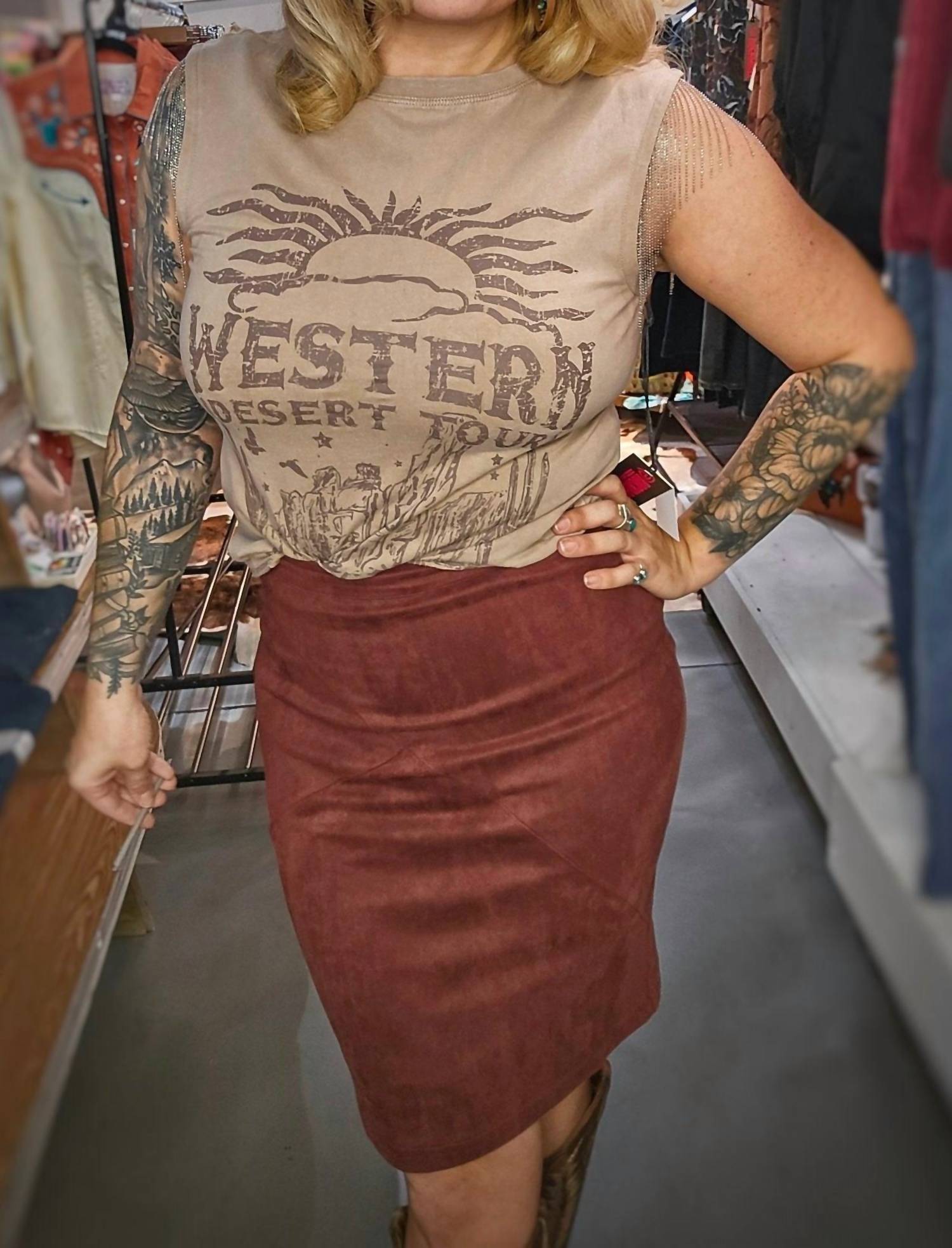 Show just the right amount of leg in this fit flattering mini. Introducing the Women's Suede Skirt by Sugar + Lips, a sophisticated addition to your wardrobe in the elegant Desert Rose hue. This solid-colored, figure-flattering mini skirt is perfect for blending classic and contemporary styles, making it ideal for summer vacations and minimalist trends. Closure: N/A. Care instructions: N/A. This piece effortlessly complements a range of occasions, from office settings to upscale ranch events.