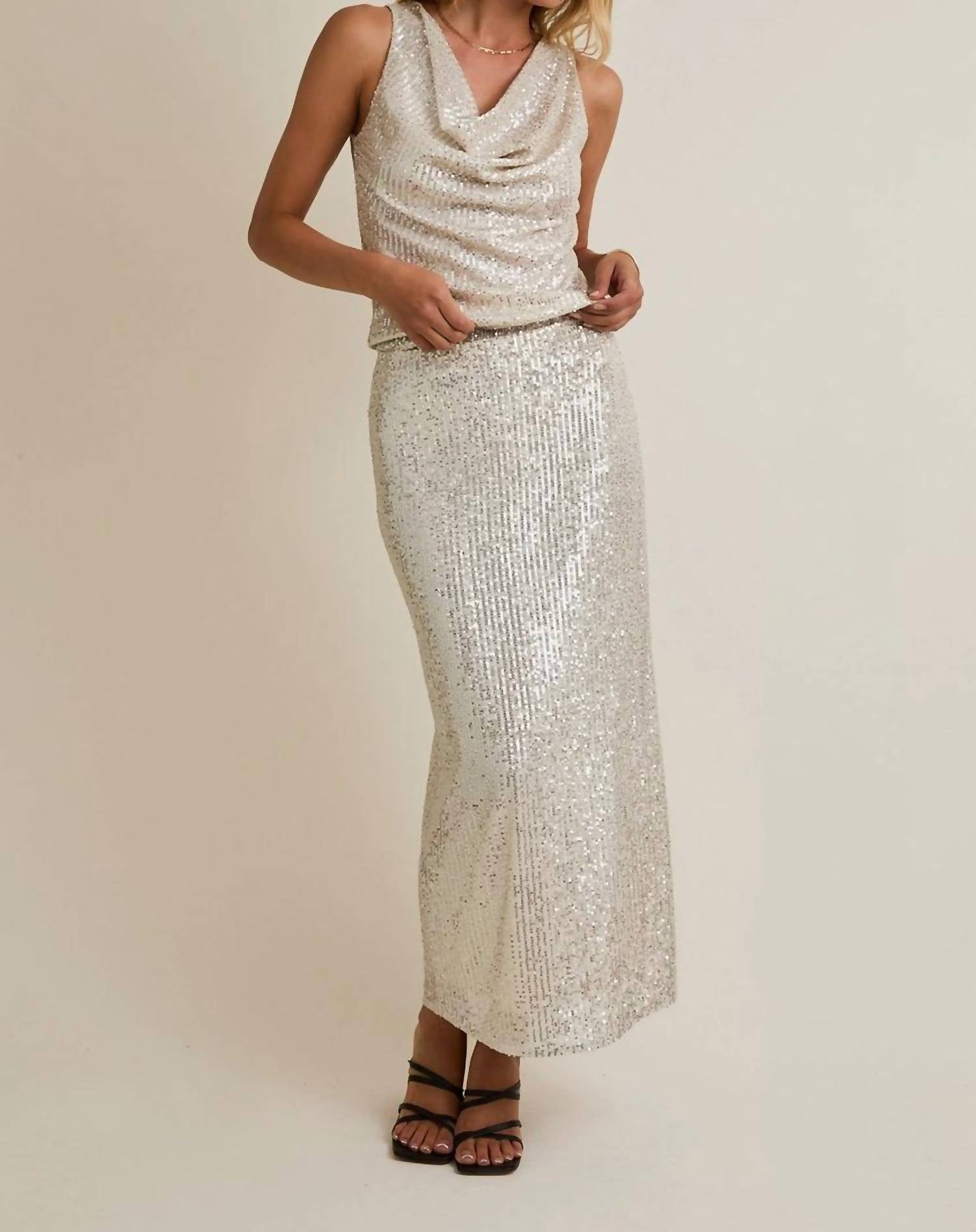Flowy, comortable and stylish. This maxi skirt is a fan favorite. Introducing the Elara Maxi Skirt by Sunday Edition, a chic silver piece designed for effortless elegance. This women's skirt features a streamlined, solid-patterned silhouette with a pull-on closure, offering both style and convenience. Made from 100% Polyester, it is crafted in China and perfectly suited for evening events, embodying the quiet luxury trend. Easy to care for, it requires hand washing and line drying, ensuring it remains a staple in your spring wardrobe.