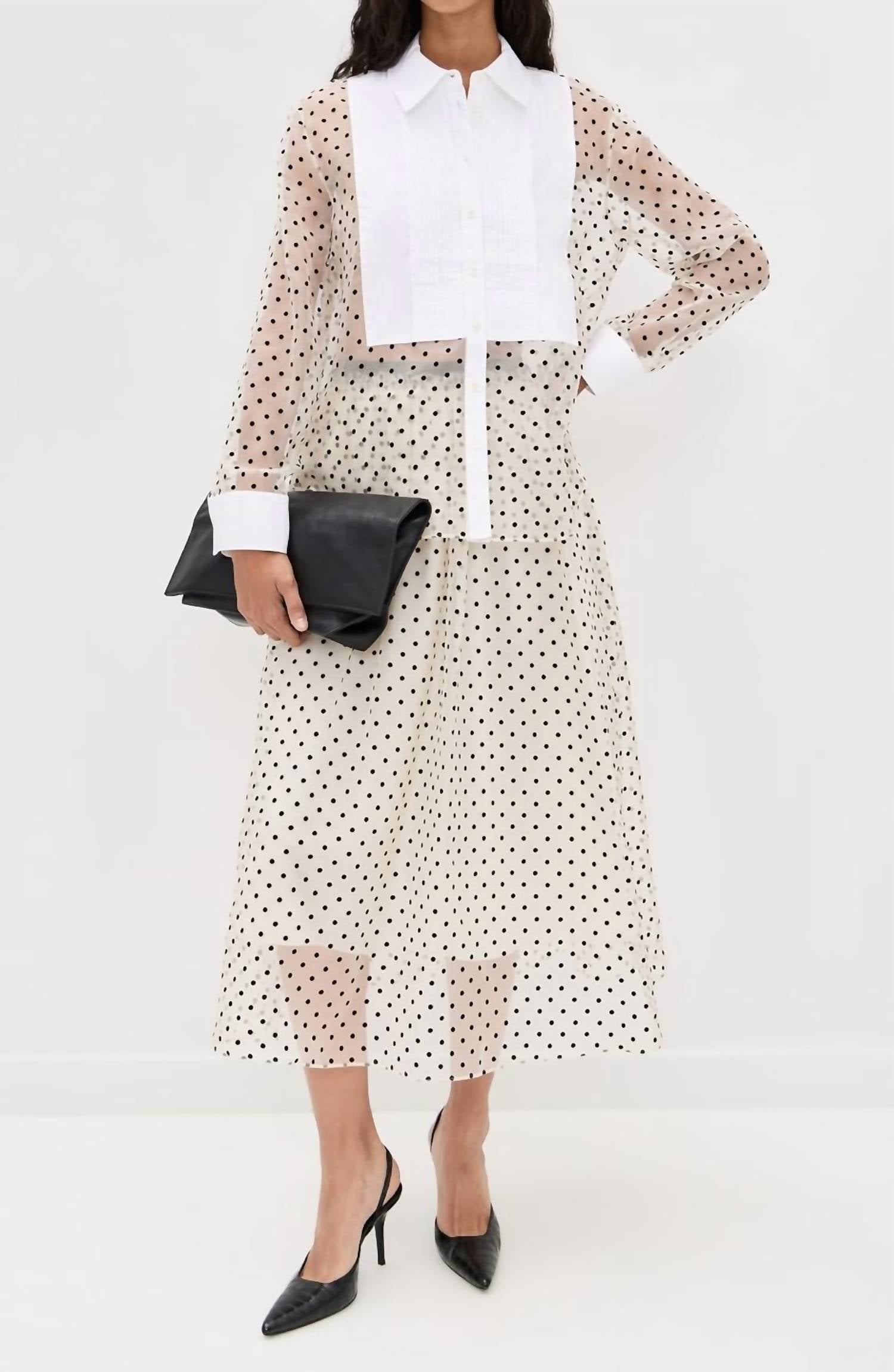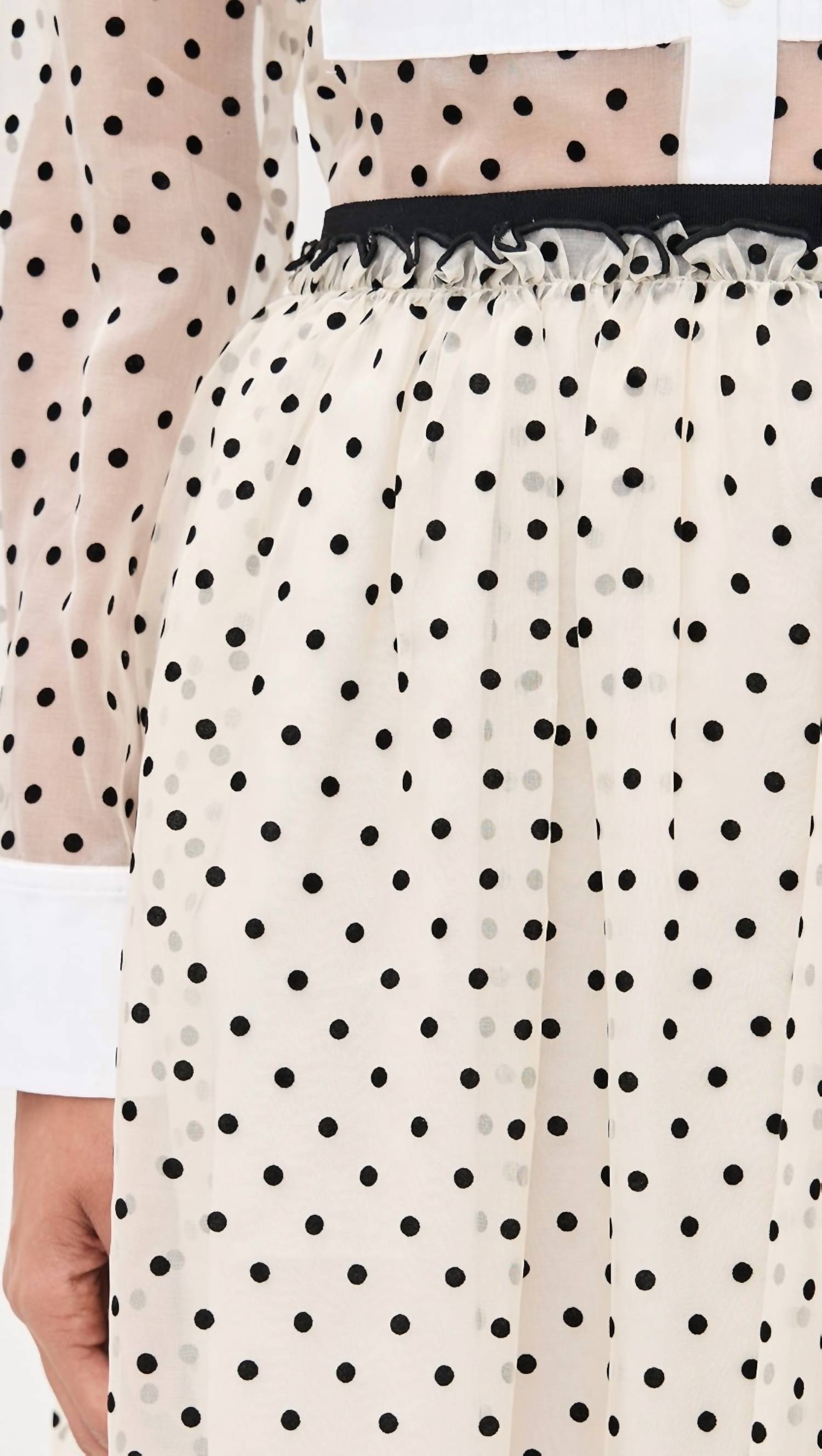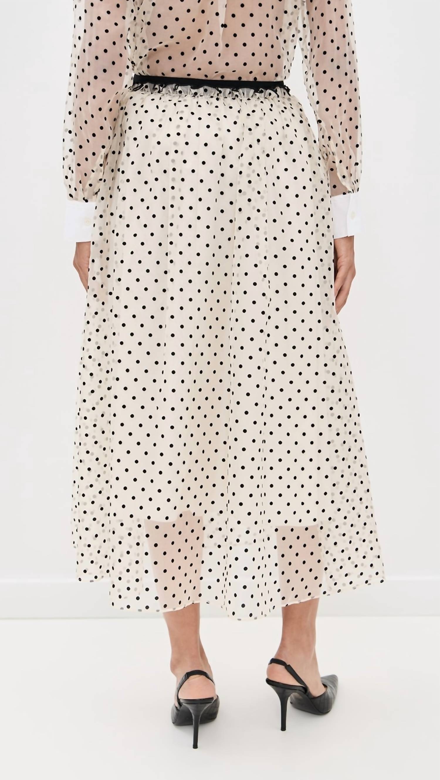 The midi length skirt is here to stay and we especially love this style. The Ainsley Silk Midi Skirt by TANYA TAYLOR is a luxurious addition to your wardrobe with its velveteen polka dot pattern in a sophisticated cream/black multi design. This midi skirt crafted from 100% lightweight, non-stretch silk chiffon features a ruffled trim at the waistband. Closure: Hook-and-eye with a hidden side zip, and practical on-seam side pockets add a functional touch. Care: Dry clean. Imported from China.