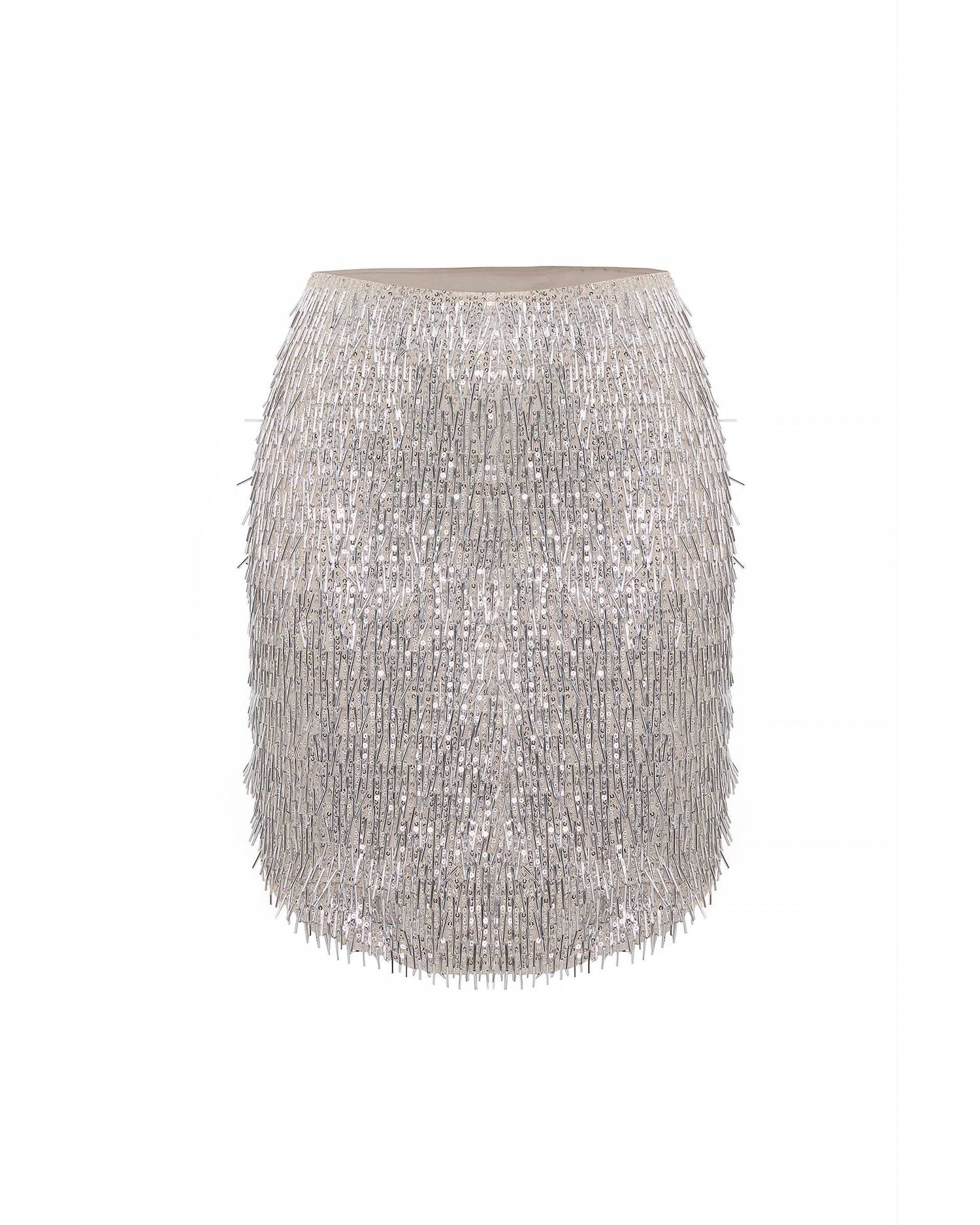 Show just the right amount of leg in this fit flattering mini. Dazzle in the Kleio Sequin Skirt by THEO the Label, a standout piece in a chic sand hue. This textured mini skirt features all-over embroidered sequins that shimmer beautifully from every angle, making it a go-to for cocktail parties and festive occasions. Crafted with a sculpting silhouette and stretch jersey lining, it ensures comfort and ease throughout the night. Perfect for women looking to make a stylish impact this spring.