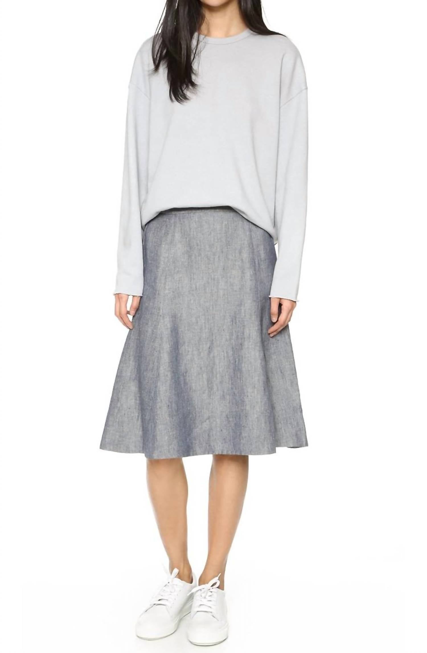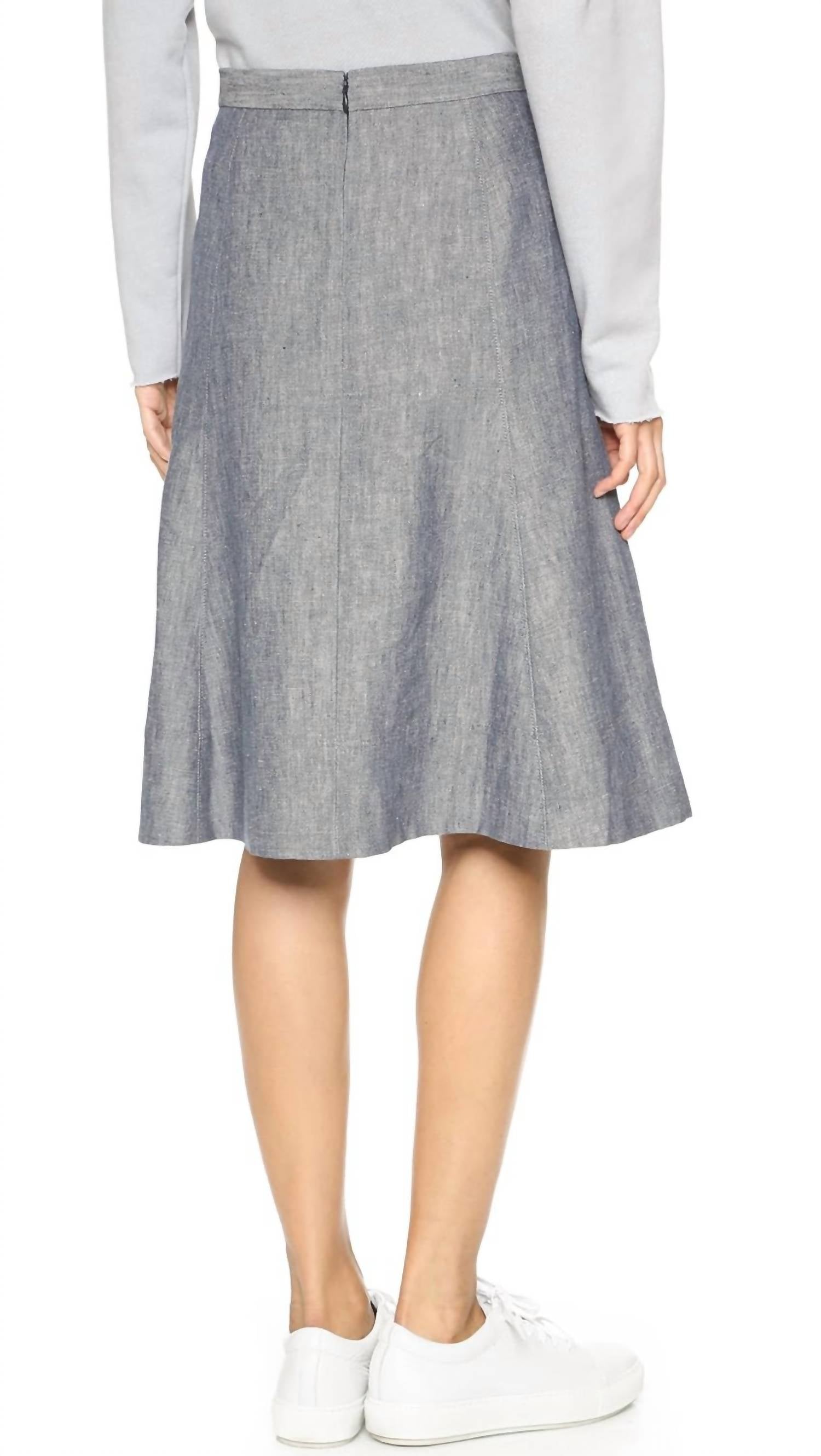 Tuck in your favorite tee for a more laid-back vibe. Experience effortless style with the Saminta Linen Jean Skirt by Theory, crafted in an indigo hue. This knee-length skirt, made from 100% linen with a denim-style texture, features a banded waistband for a flattering fit. Closure: Back zipper. Care: Machine washable. Perfect for business, casual, travel, and party occasions, it's a vintage-inspired staple.