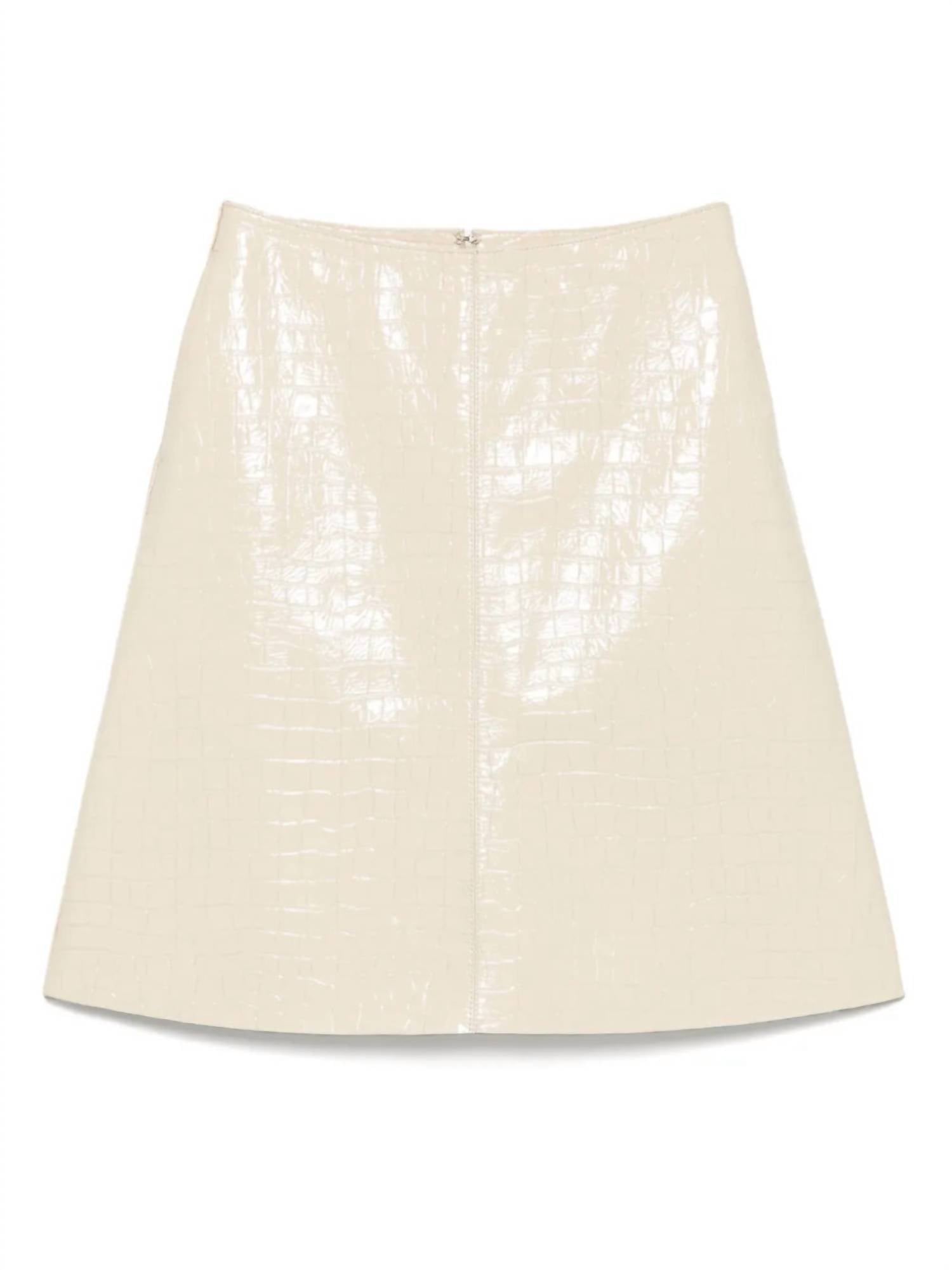 Show just the right amount of leg in this fit flattering mini. The TOTEME Croco-embossed Skirt is a stunning A-line design exuding quiet luxury and crafted from 100% lamb leather with a textured croco pattern. This mini skirt, designed for evening events, falls just over the knee and includes functional side slip pockets and a concealed back zipper for a sleek silhouette. Lined with 100% viscose satin and featured in an elegant oyster color, it is perfect for fall occasions. Care instructions recommend professional dry cleaning to maintain its glossy finish.