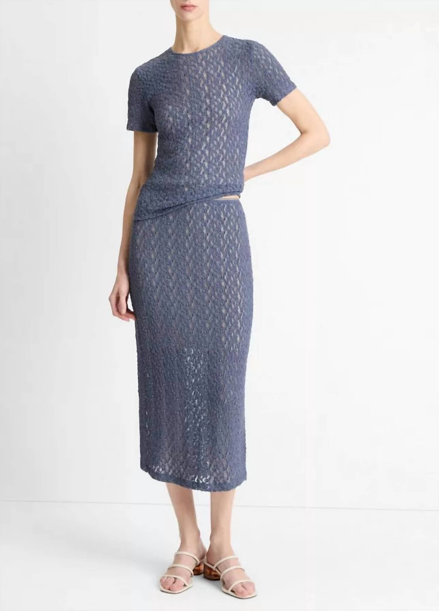 The midi length skirt is here to stay and we especially love this style. Introducing the Vince Floral Smocked Skirt, a stunning mauve thistle midi-length statement piece perfect for your summer wardrobe. Crafted from a 49% Nylon, 48% Cotton, 3% Spandex blend, this boho chic skirt features a sheer and airy floral smocked lace design, offering a subtle peek of leg. The pull-on style ensures comfort and ease, while its 29.5" length captures a gracefully refined look. Care for this piece by hand washing and line drying to maintain its delicate charm.
