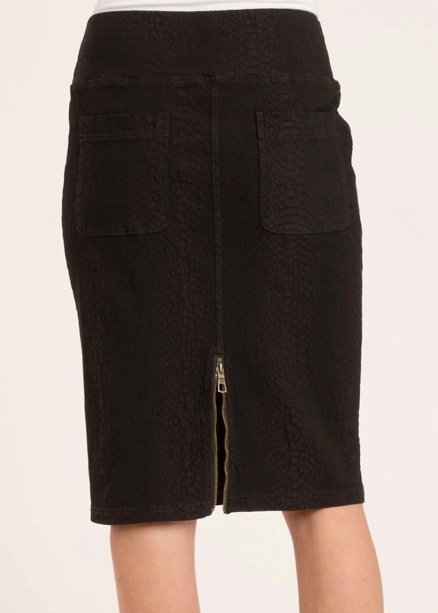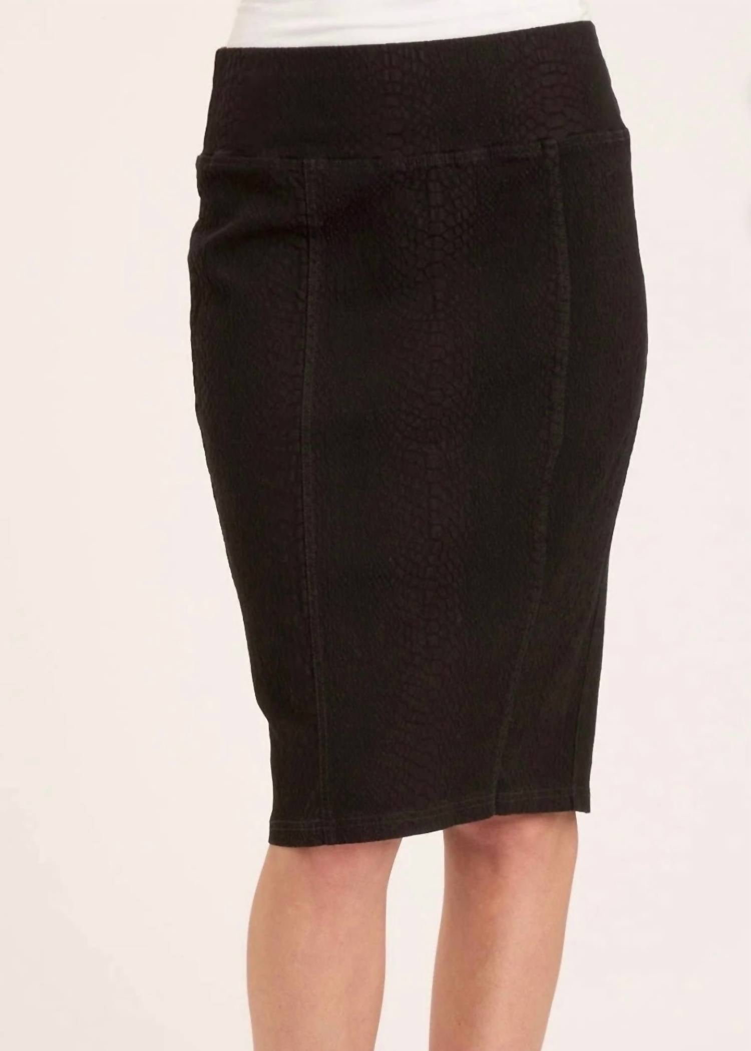 Show off just the right amount of skin in this beautifuly designed midi length skirt. Introducing the Arleigh High Waist Midi Skirt by XCVI, a slender yet stretchy pencil skirt available in a classic midnight black. This skirt is crafted from a blend of 60% Rayon, 35% Nylon, and 5% Spandex, featuring a zip closure for versatile wear. With a center front length of approximately 25 inches and a center back of 25.5 inches, it’s designed for effortless elegance. Preshrunk and machine washable, the Arleigh is perfect for a minimalist look at any holiday party this spring or Thanksgiving. Model Julia is wearing a size small (5'10" height, 34C bust, 26" waist, 36" hip).