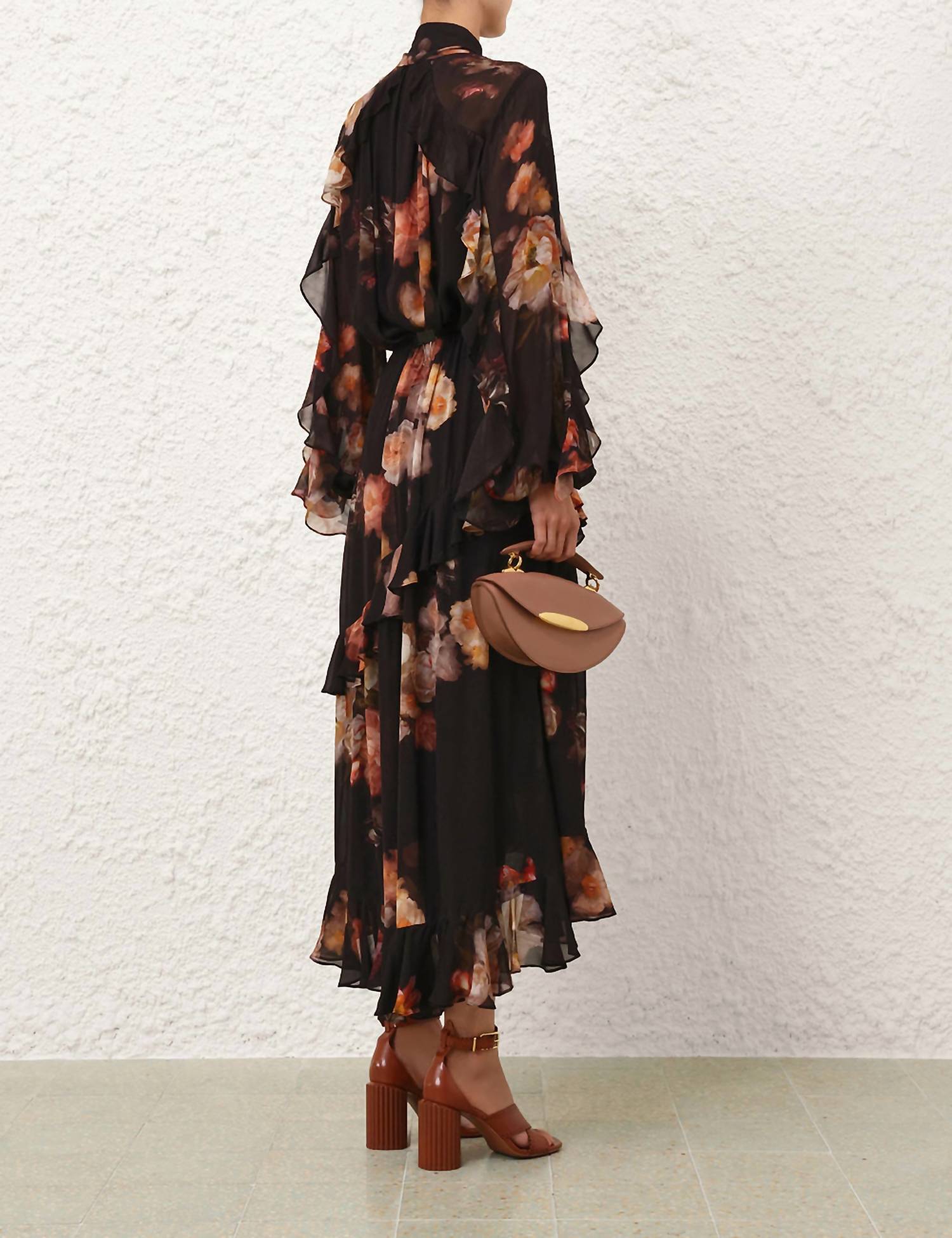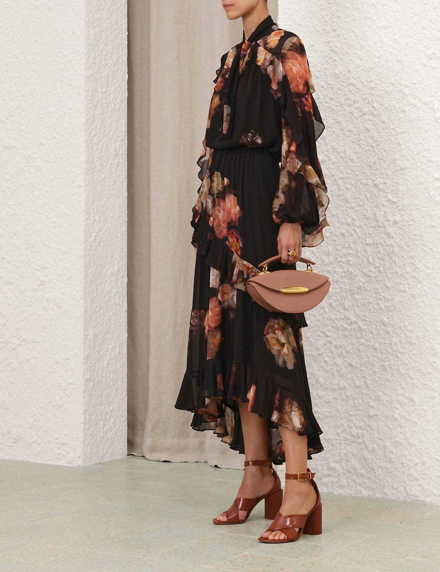 The midi length skirt is here to stay and we especially love this style. The Zimmermann Hypnotic Asymmetric Midi Skirt, in a captivating Russet Floral pattern, elevates any wardrobe with its cascading ruffle detailing and asymmetric layered design. Crafted from 100% viscose and fully lined, it offers a sophisticated boho chic appeal, perfect for summer church occasions. The skirt features an invisible zip closure with a hook and eye on the left side, ensuring a seamless fit. Care for this garment includes dry cleaning (hydrocarbon only) and ironing with a protective cloth; avoid spot cleaning to maintain its delicate design.