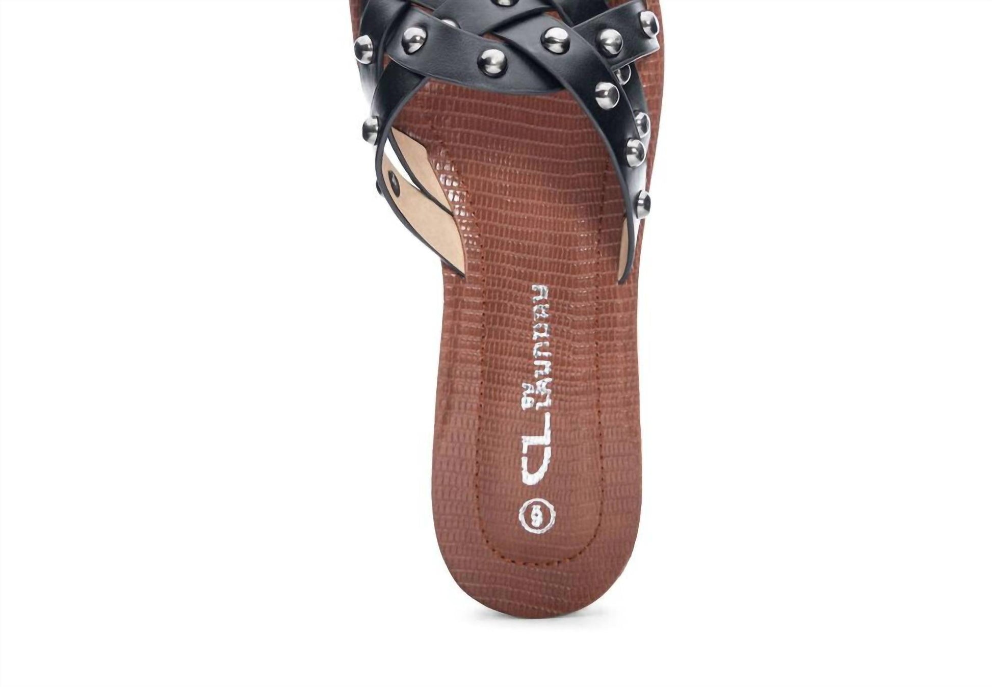 The aspiring slide will add an element of class to any outfit. It features a studded, multi-band upper and stacked wedge heel. Features: 1.25" stacked wedge heel, shoe width- medium, slide-on closure. Polyurethane upper, lining, and outsole. Metal hardware. Care: spot clean.