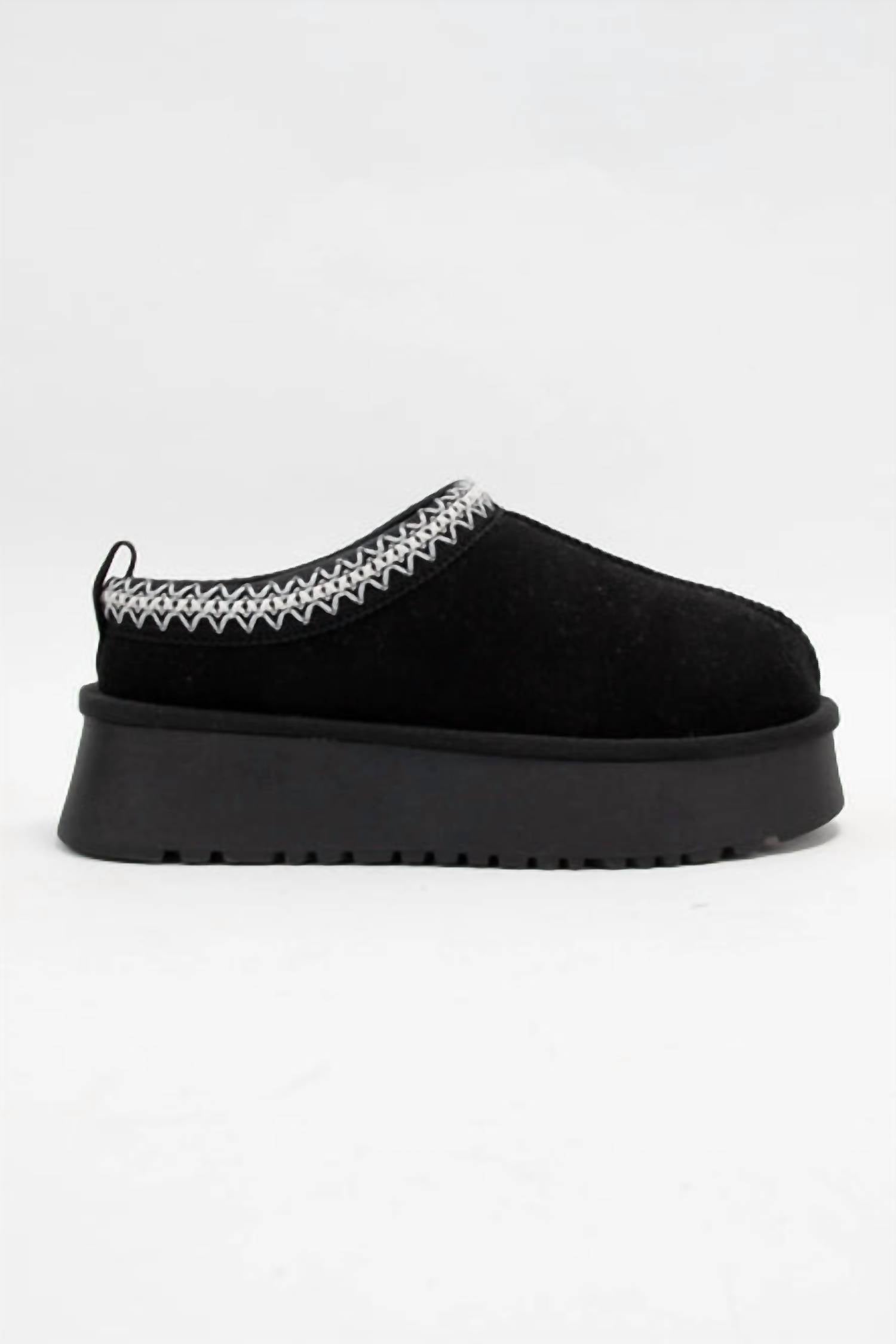 Pair these with a cozy robe and we call this loungewear luxe. Stay cozy and stylish with the Women's Remy Short Ankle Fur-lined Cozy Slipper by CCOCCI. Featuring a plush wool lining and insole for ultimate comfort, these black faux suede slippers boast ultra platform soles and a round toe shape for a trendsetting appeal. The 2" low heel height provides a slight lift while maintaining easy walkability, perfect for streetwear outings or a relaxing vacation. Embrace the winter season with these true-to-size slippers designed for women who value warmth and style.