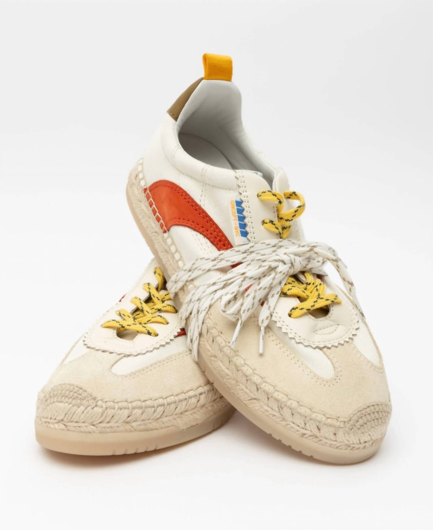 Get your daily steps in with these adorable sneakers. Experience the perfect blend of relaxed style and sophistication with the Women's St Tropez Espadrille Sneaker by Oncept in Ivory Moon. This sneaker features an eco-friendly design with recycled cotton twill and a lower calf leather trim, complemented by a Tencel® pulp-based twill lining for optimal comfort. The innovative bio-density molded footbed and recycled rubber bottoms offer a comfortable fit, ideal for both beach outings and city explorations, while the refined groove design enhances flexibility. Care: Outsole can be cleaned with a soft cloth and water; upper should be protected with waterproof spray; not machine washable. Designed with a flat heel and round toe, perfect for springtime festivals or laid-back holidays like the 4th of July.