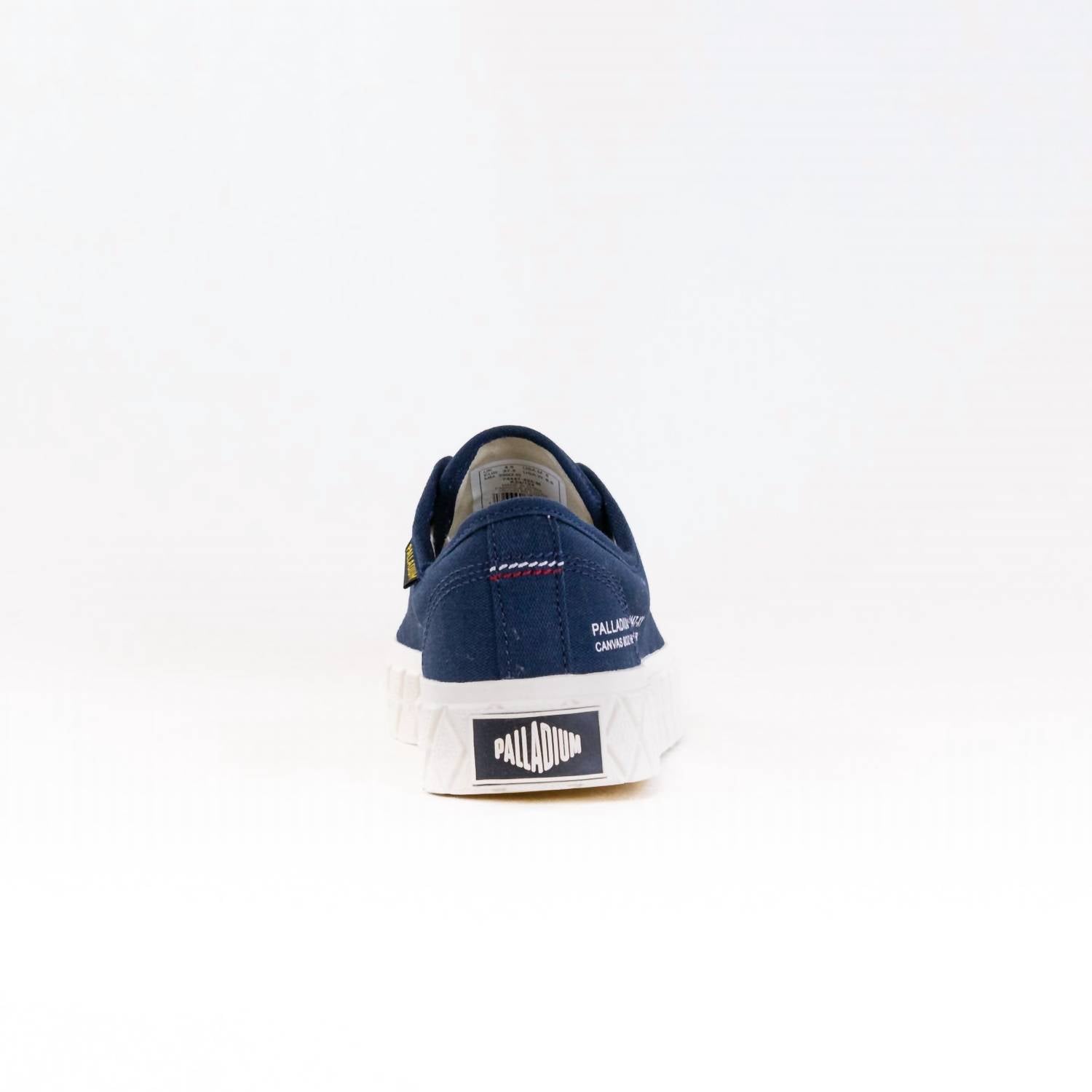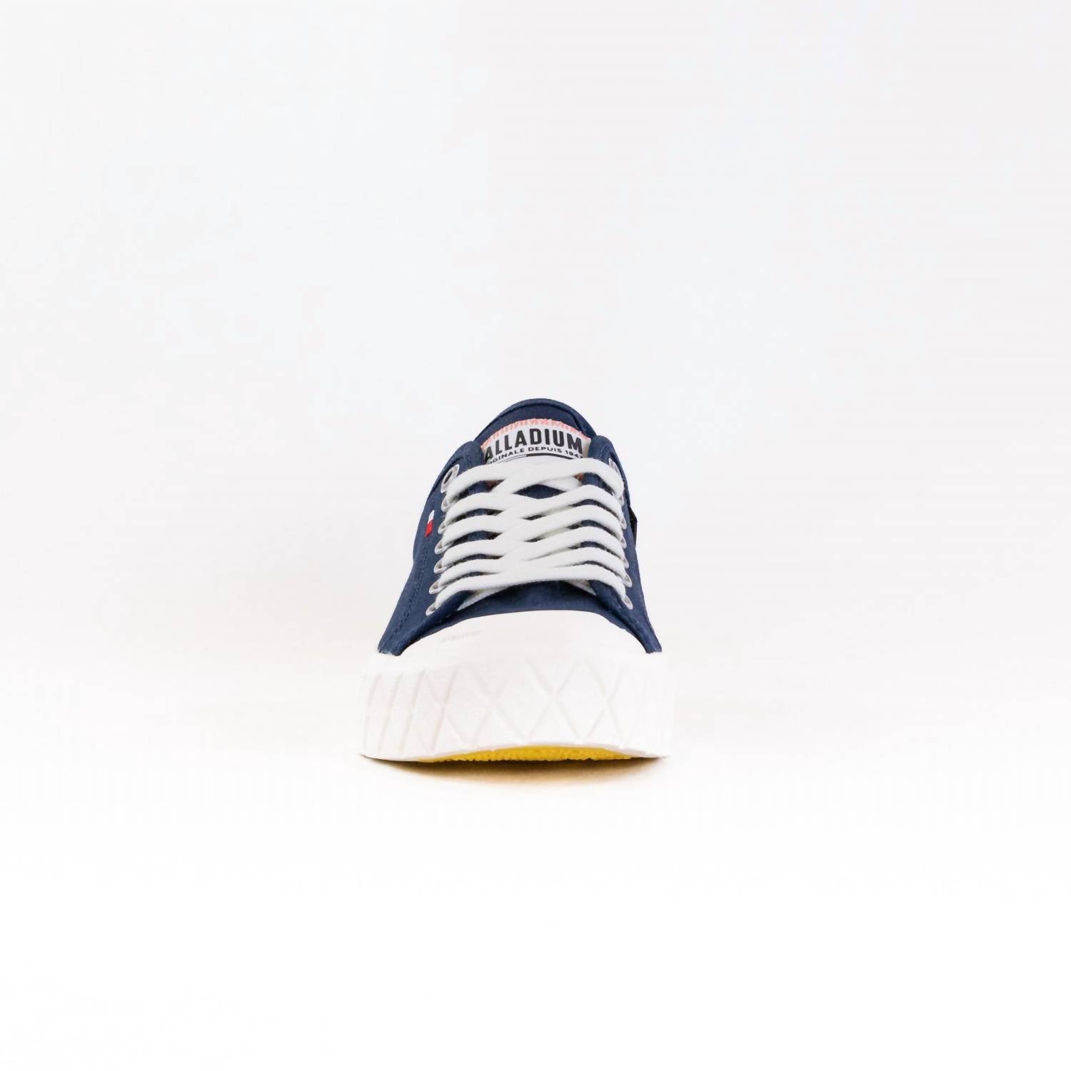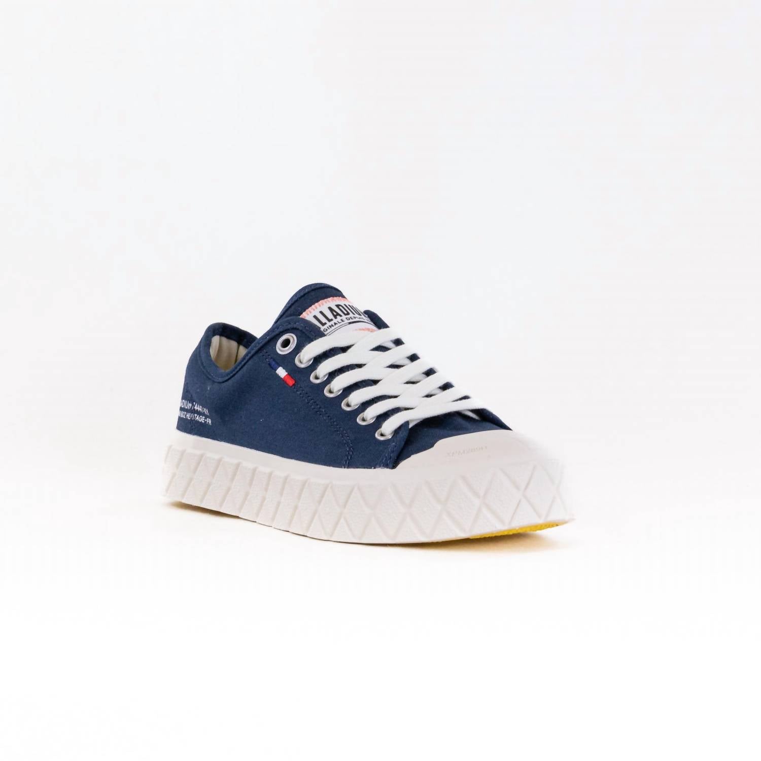 Cute, functional, and comfortable. These sneakers check all the boxes. Celebrate the blend of tradition and modern values with the Women's Palla Ace Canvas Organic Sneakers by Palladium, crafted in rich Mood Indigo. Featuring a low-cut design, these sneakers are made from 100% organic cotton, ensuring breathable comfort with a 100% cotton lining and insock. The durable outsole, composed of 100% rubber, is inspired by the iconic diamond band of the Pampa boots, and a protective rubber toecap enhances everyday ease. Closure: Lace. Heel Height: 25mm. Plus, these vegan sneakers feature stylish French branding elements like a tricolore flag and are perfect for stepping out with confidence.