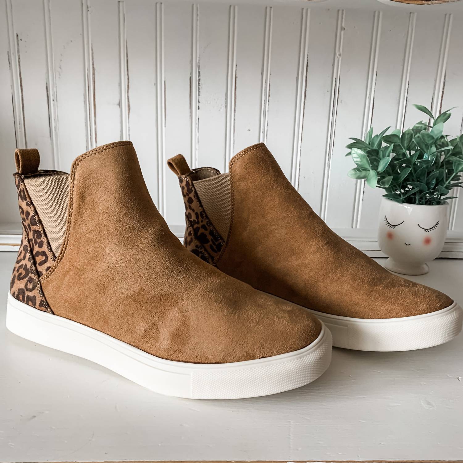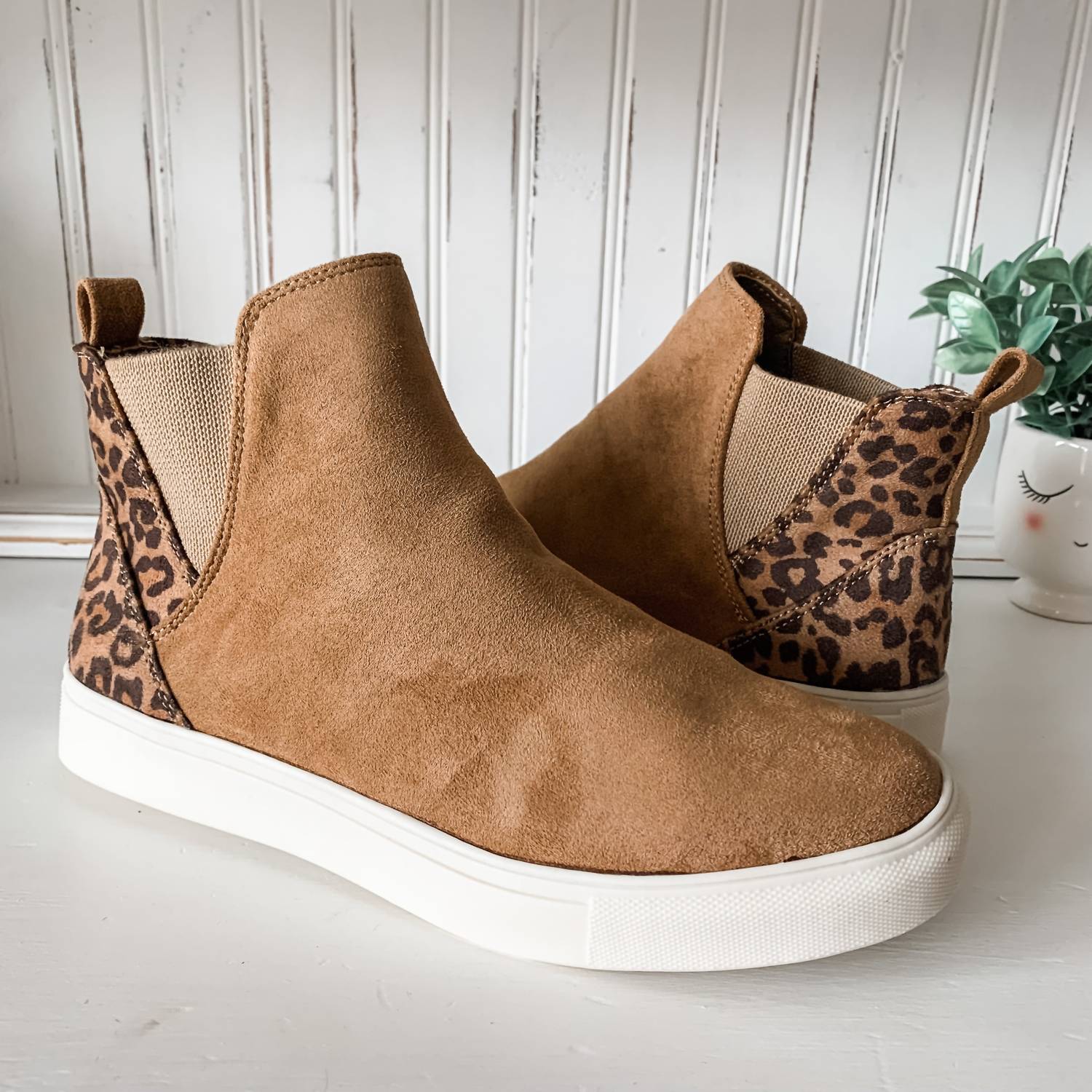 When fashion and function come together seamlessly. Step into style with the Women's Dembra Sneaker by Very G in a chic tan color. This sneaker boasts a synthetic upper with a unique back leopard detail and a comfortable 1" rubber platform heel for a bit of lift. The round toe design, combined with a V-cut side and elastic, ensures easy on and off wear. Made from durable polyurethane, it features a lightly cushioned footbed for added comfort. Note: It runs snug, so sizing up by half a size and using a shoe horn is recommended for the perfect fit.