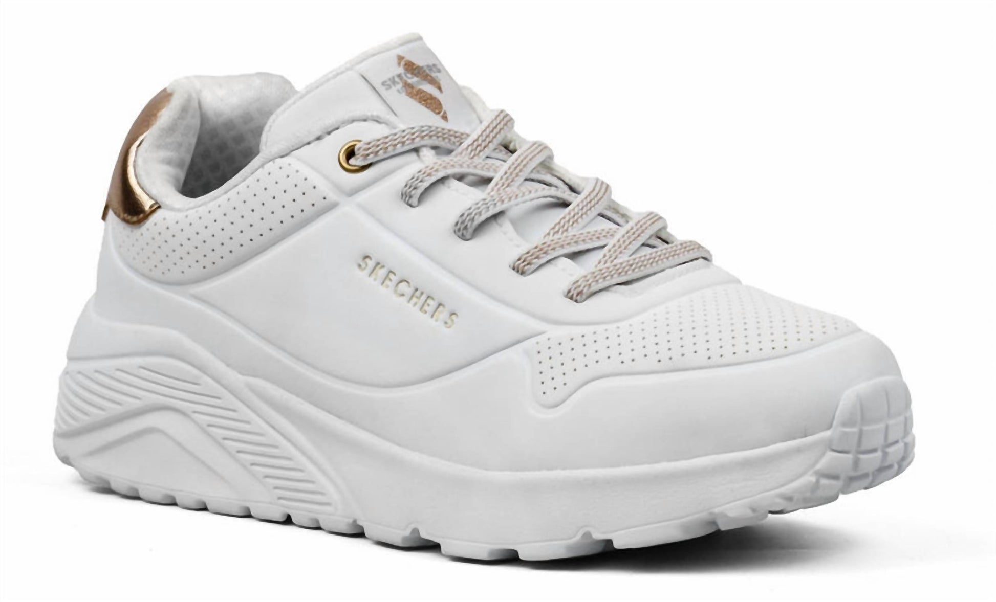 Cute, functional, and comfortable. These sneakers check all the boxes. Step up your streetwear game with the Women's Uno Lite Sneakers by Skechers, perfect for teens and featuring a comfortable wedge heel. These white sneakers with a medium shoe width and round toe shape are designed for spring and effortlessly suit birthday celebrations or Thanksgiving gatherings. The cushioned rubber composition ensures a soft, comfortable stride. Ideal for the stylish, versatile look you desire.