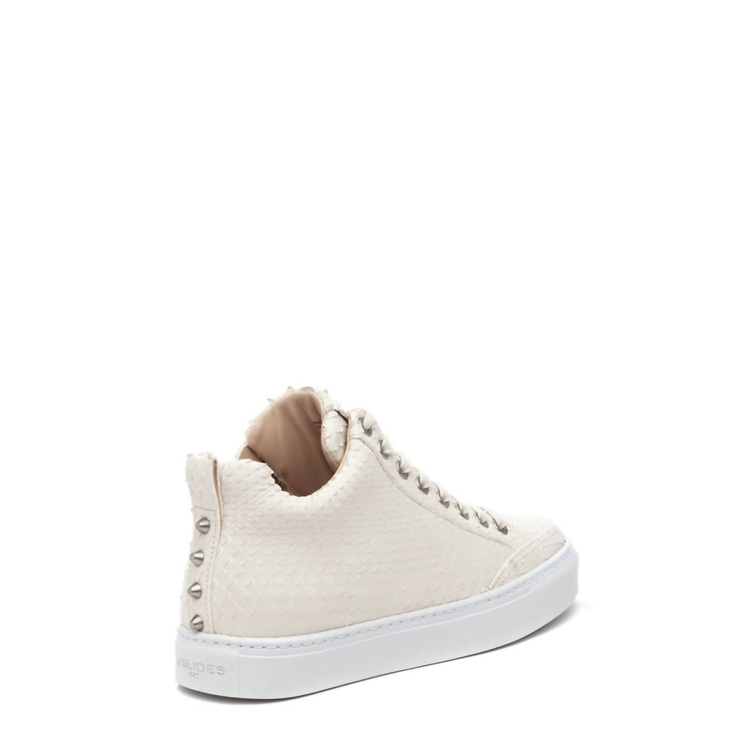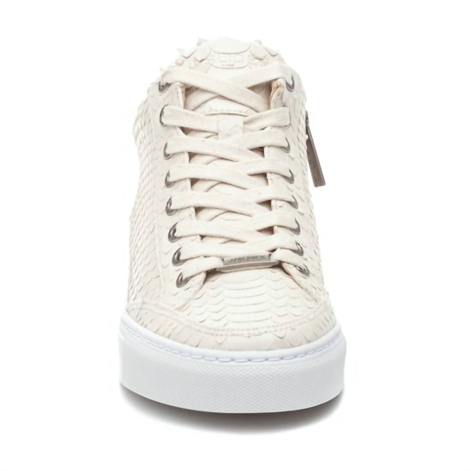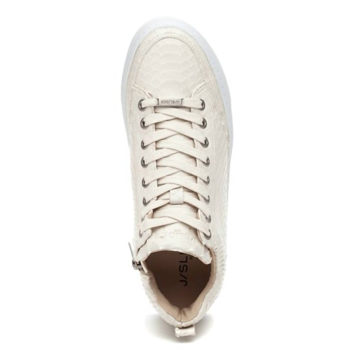 Discover the Women's Leesa Cut Embossed Sneakers by J/SLIDES, an elegant addition to your casual footwear collection. Crafted from breathable leather, these sneakers offer a secure fit with a side-zip closure and a lace-up vamp. Enjoy the comfort of a cushioned footbed complemented by a removable gel insole. Signature logo accents at the tongue and heel bumper complete this stylish design. Color: Off white embossed.