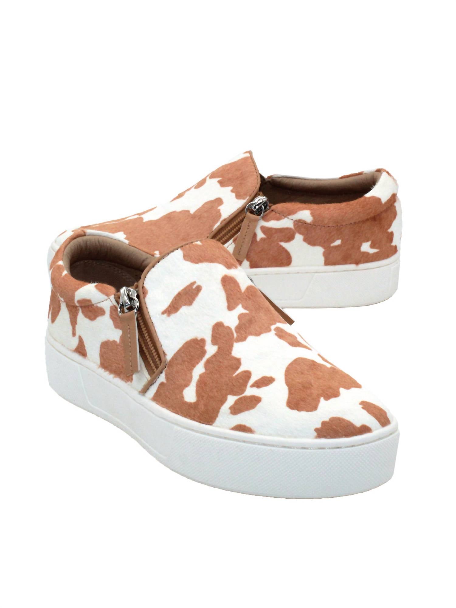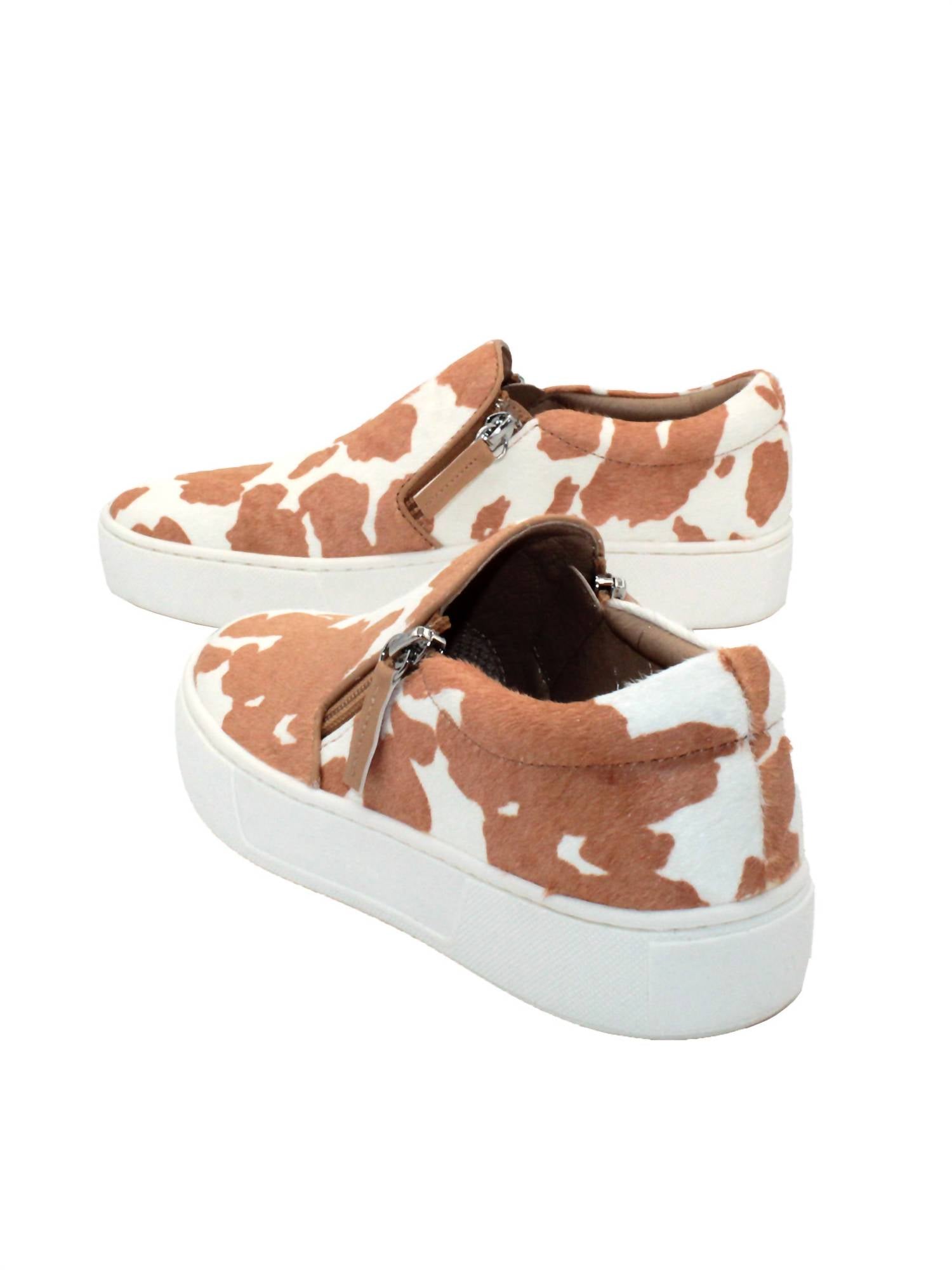 Get your daily steps in with these adorable sneakers. Upgrade your footwear collection with the Women's Normande Slip-on Sneaker by Very Volatile, featuring a tan white cow print in genuine hair calf. This stylish sneaker combines studded faux leather and sparkling textile for an eye-catching upper, with convenient double zipper closures for easy wear. The flat heel measures 1 inch, perfect for comfortable, all-day support, complemented by a padded sock on a textured rubber bottom. Designed with a chic round toe, this versatile sneaker seamlessly pairs with both casual and dressy outfits.