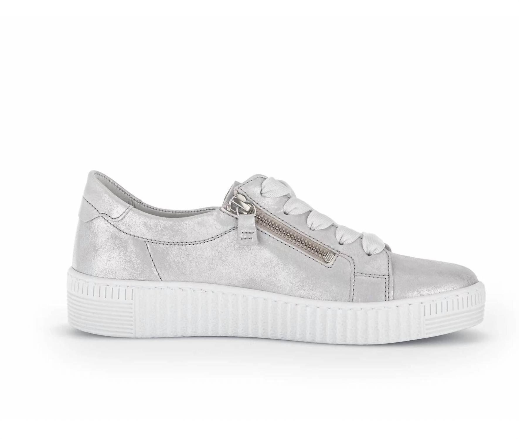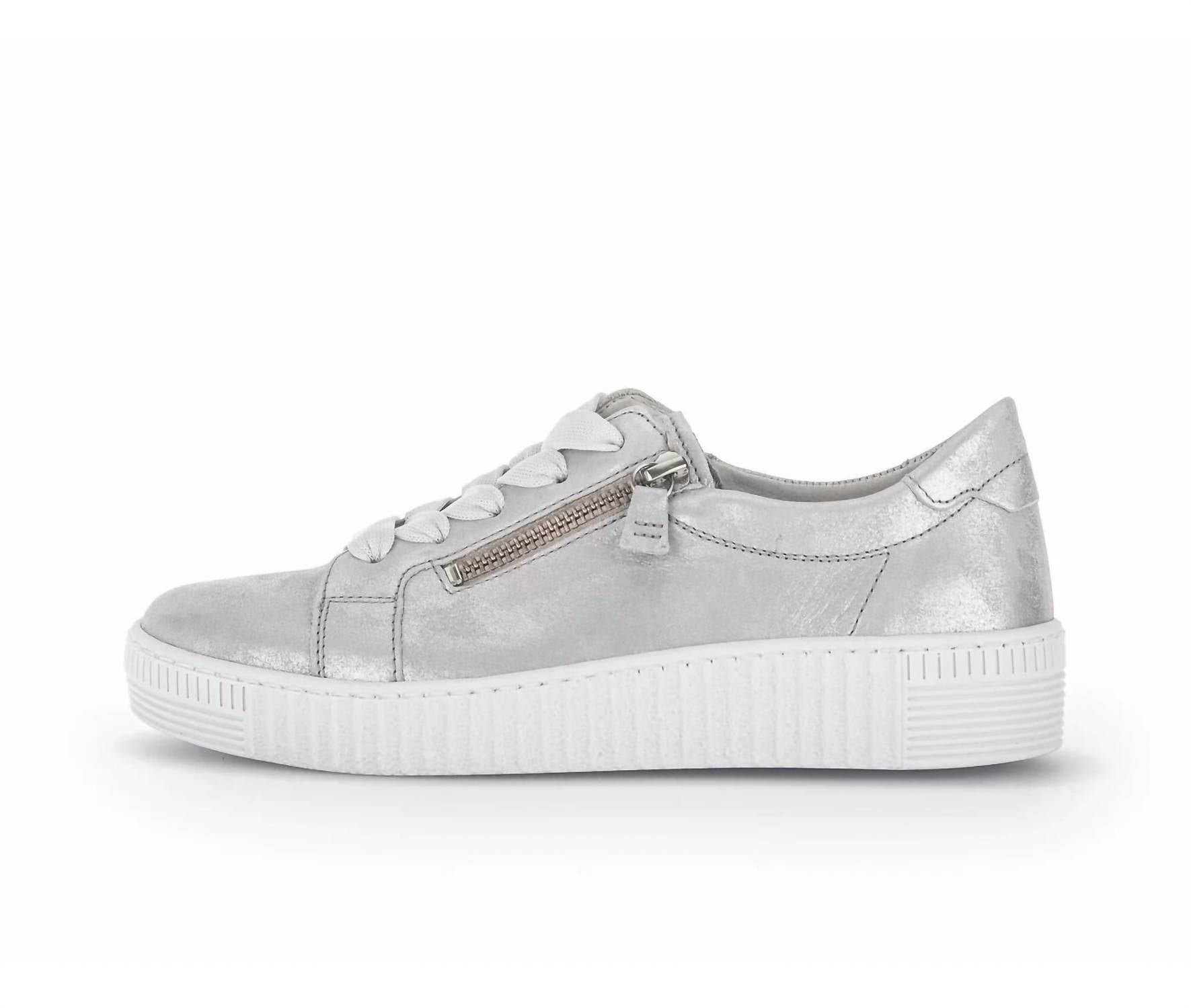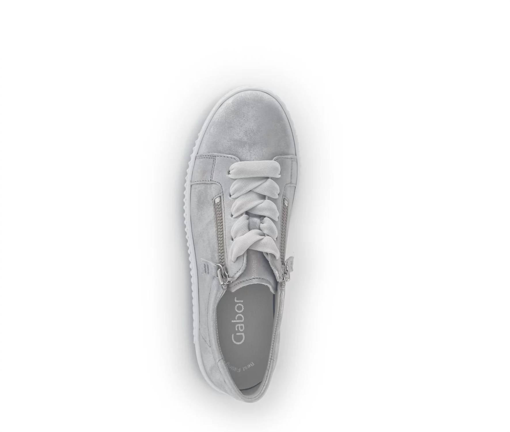 Get your daily steps in with these adorable sneakers. Step into sophistication with the Gabor Women's 23.334.61 Light Grey Ice Round Toe Shoes, perfect for a minimalist dinner party look. Crafted with a flat heel height of 3.5 cm, these sneakers feature an elegant leather lining and a stylish effect leather upper. Designed in Europe, they offer a comfortable fit with a round shoe tip and a zipper closure.