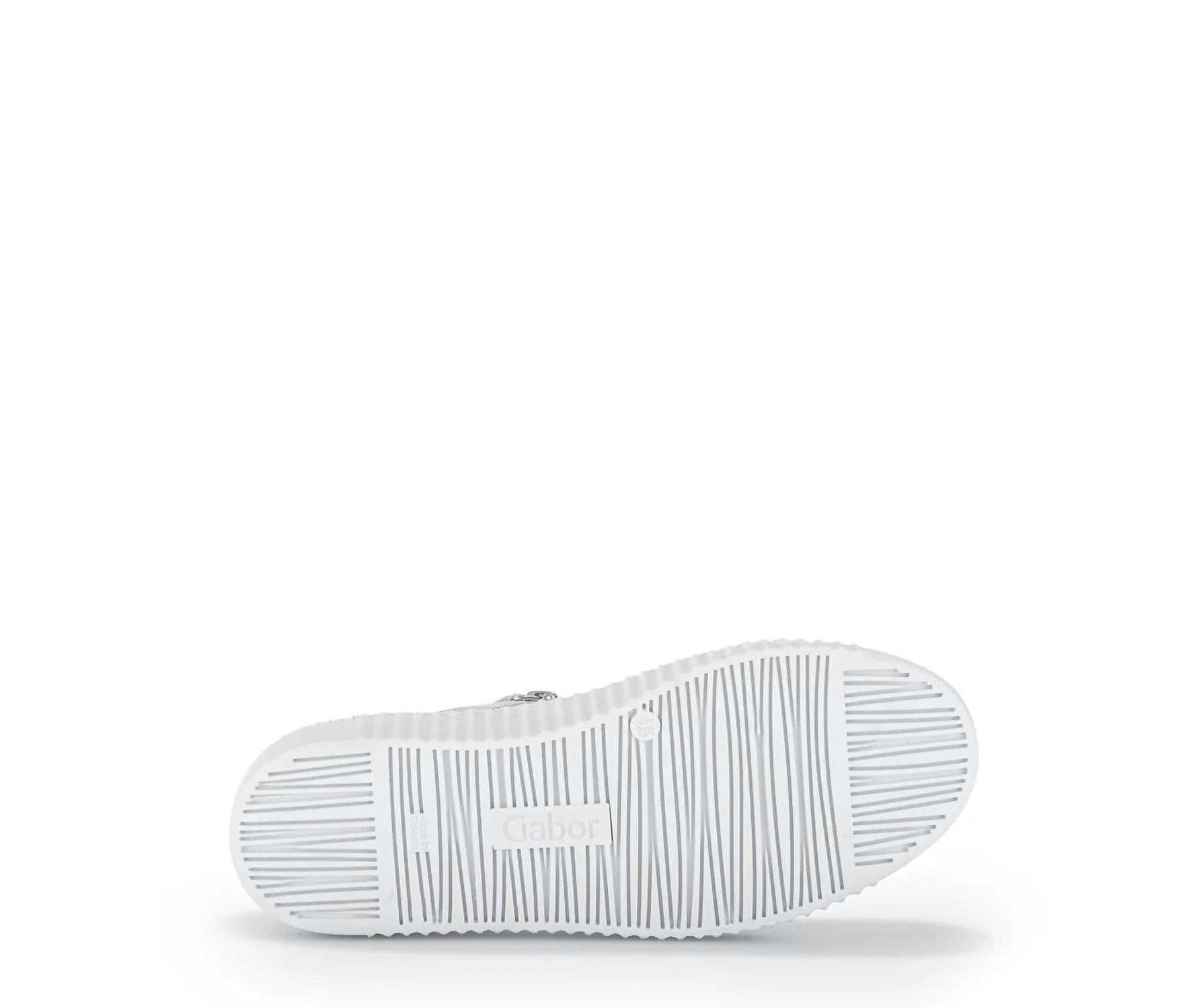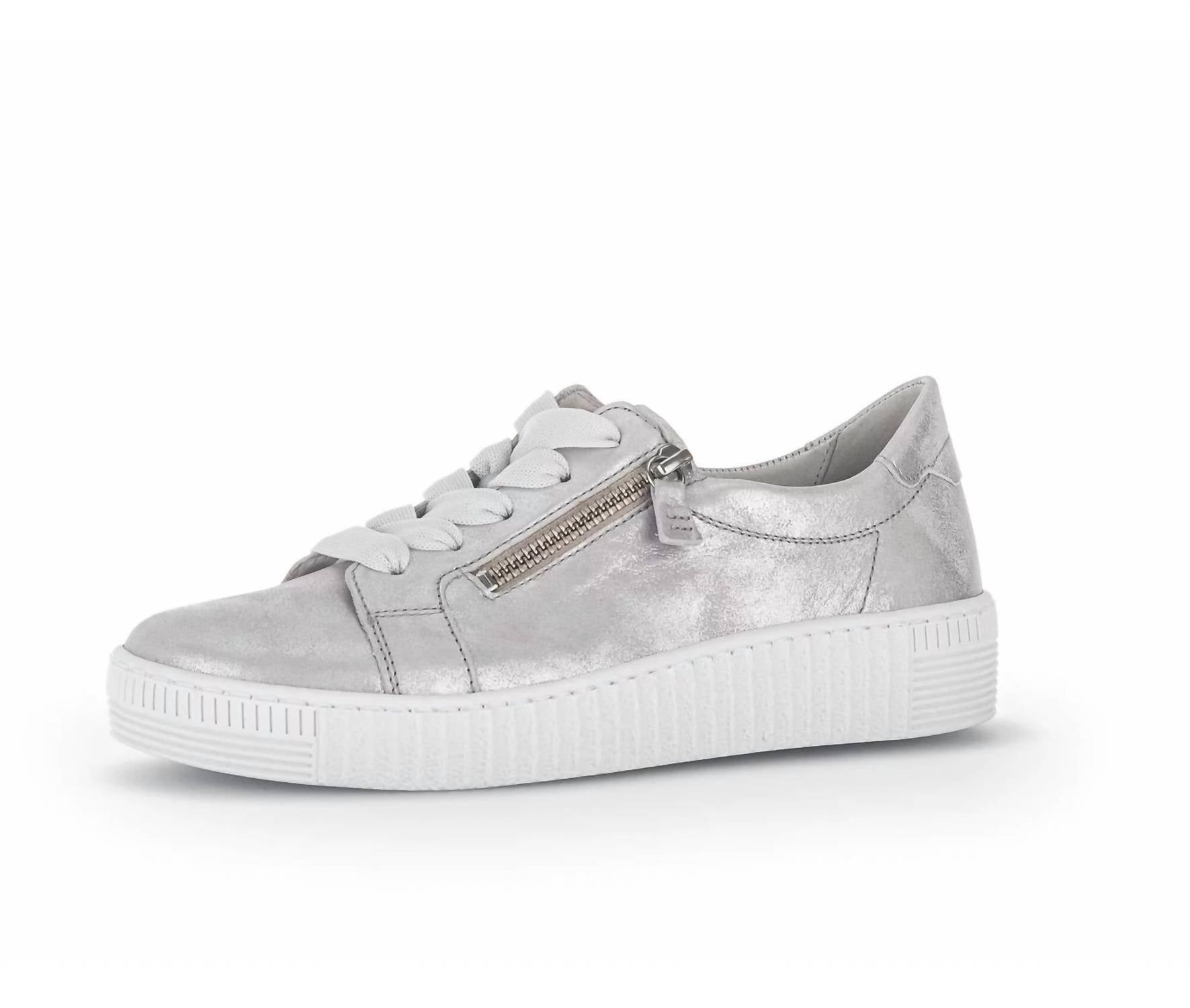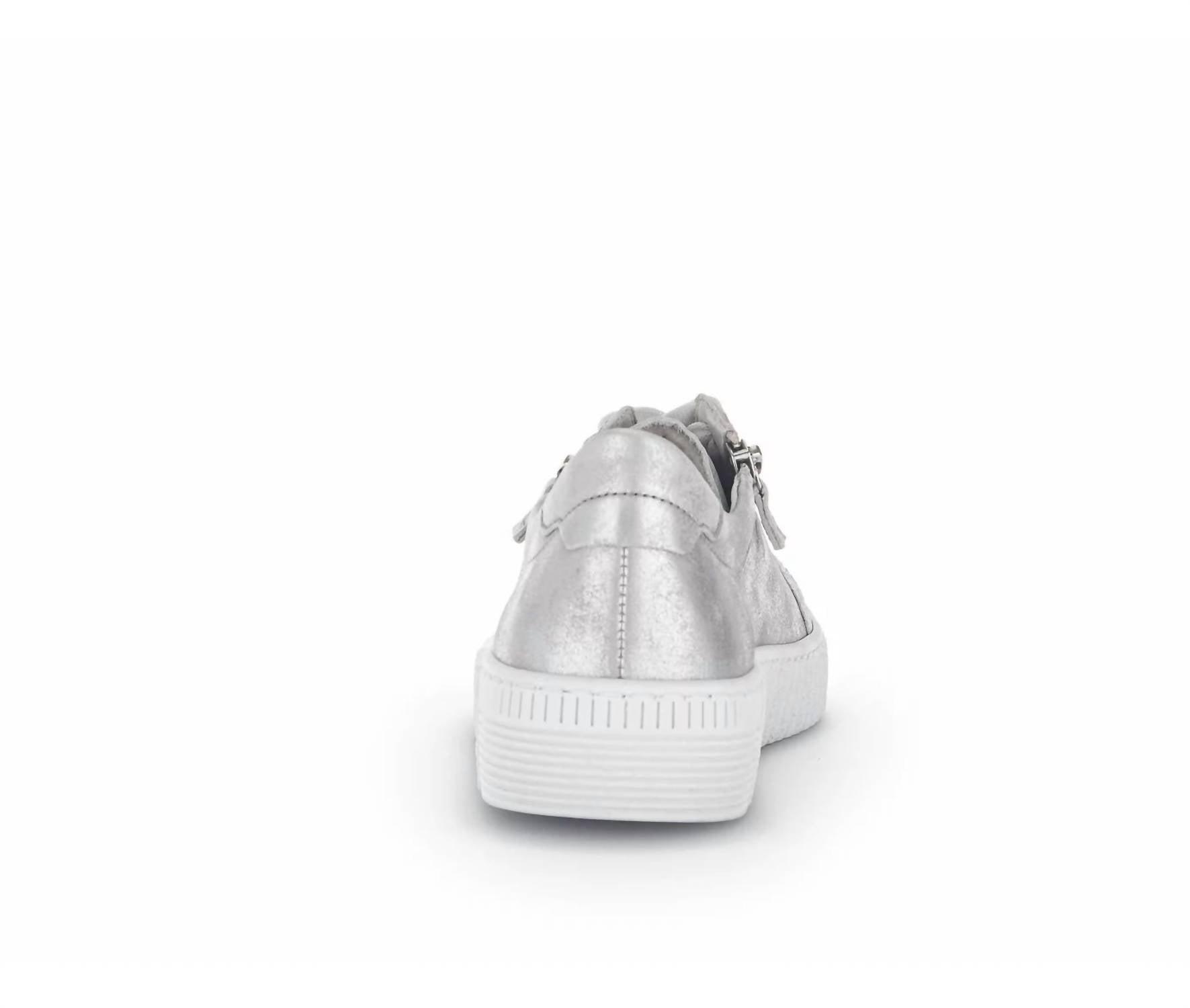 Get your daily steps in with these adorable sneakers. Step into sophistication with the Gabor Women's 23.334.61 Light Grey Ice Round Toe Shoes, perfect for a minimalist dinner party look. Crafted with a flat heel height of 3.5 cm, these sneakers feature an elegant leather lining and a stylish effect leather upper. Designed in Europe, they offer a comfortable fit with a round shoe tip and a zipper closure.