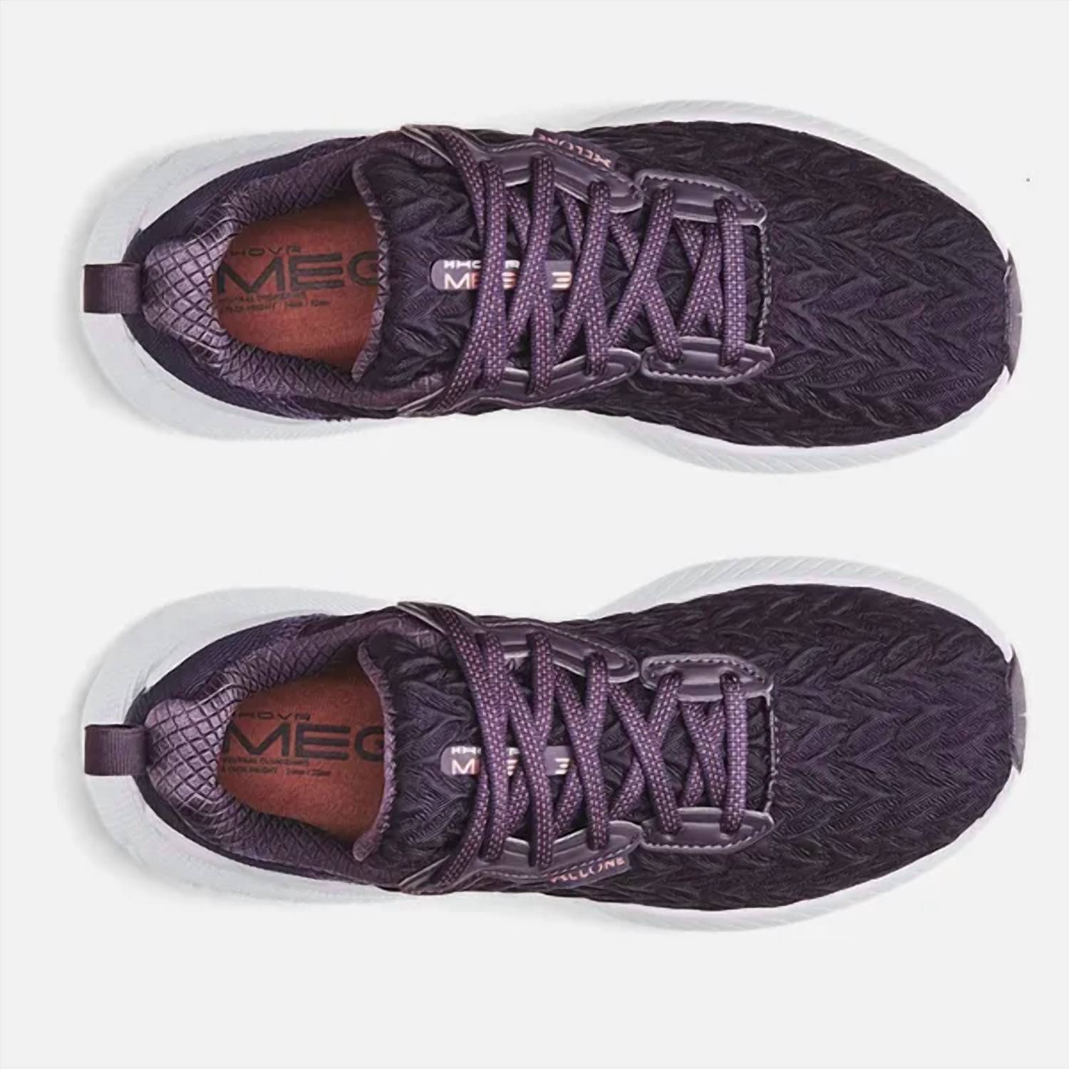 Cute, functional, and comfortable. These sneakers check all the boxes. Step into ultimate comfort with the Women's UA HOVR Mega 3 Clone Running Shoe by Under Armour in a stylish Tux Purple/White. These sneakers feature a UA Clone upper that expands and contracts, offering a seamless and precise fit with a round toe shape. Enhanced with a 3D-molded sockliner and responsive UA HOVR cushioning, they promise a soft and smooth ride, ideal for runners seeking ultra-plush cushioning. Offset at 8mm and weighing 11.5oz, they also boast an external TPU heel counter and carbon rubber pods for superior support and durability.