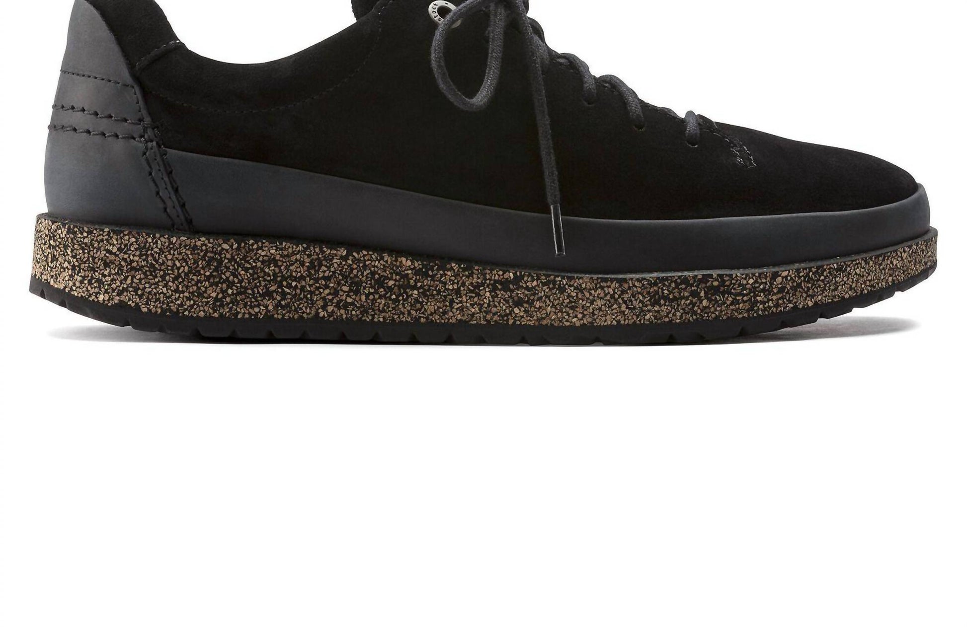 Cute, functional, and comfortable. These sneakers check all the boxes. Introducing the BIRKENSTOCK Women's Honnef Low Sneaker, a stylish and functional choice in black suede. Designed with a soft suede upper, it features a sporty lace-up style for a customizable fit and an injected rubber outsole offering excellent grip and durability. The shoe boasts the Original BIRKENSTOCK Deep Blue Footbed, crafted with a moisture-wicking microfiber liner, cork and jute layers for arch support, and a PU base for added shock absorption. Made in Portugal, this narrow-fit sneaker is perfect for active days around town or travel adventures.