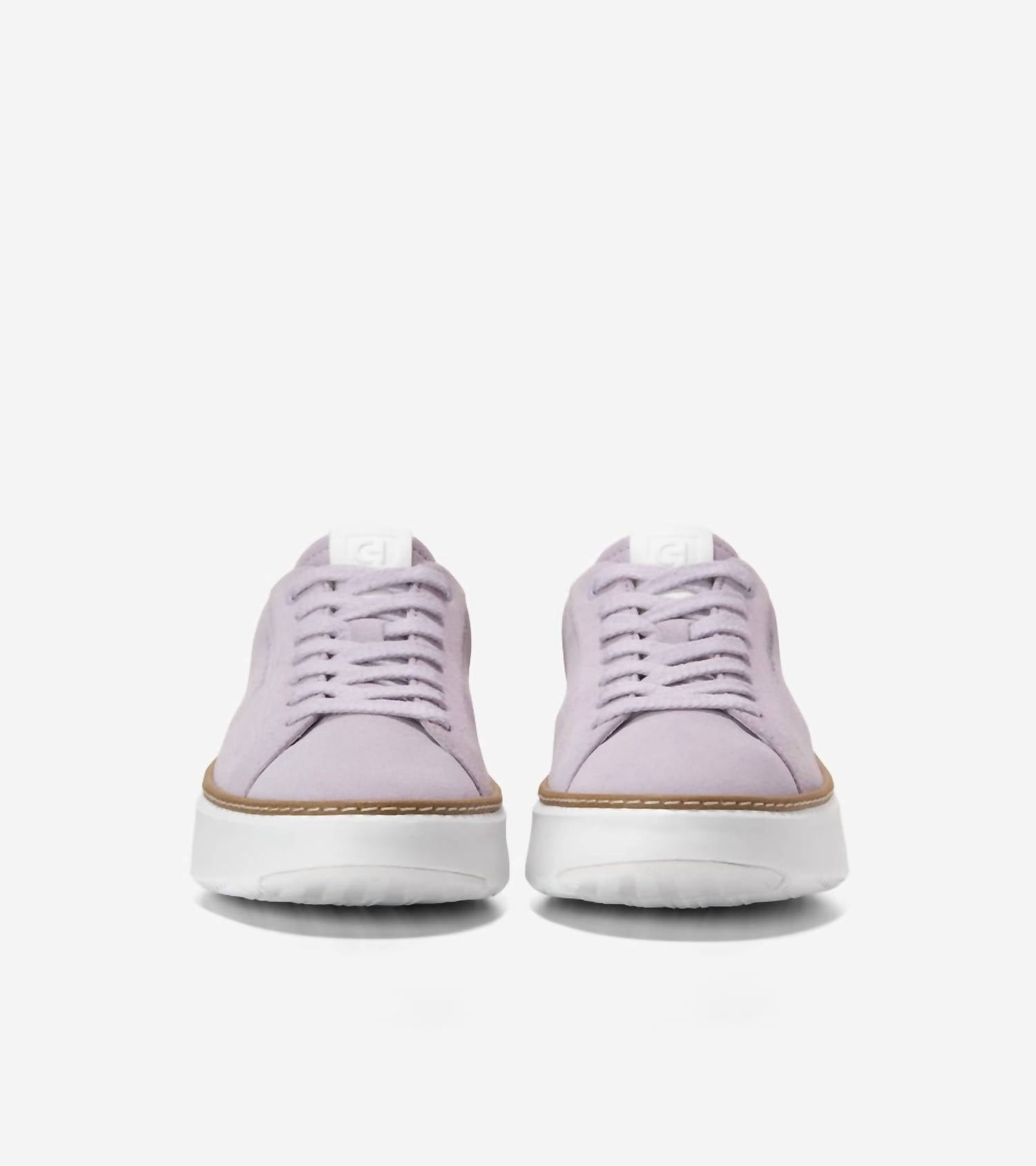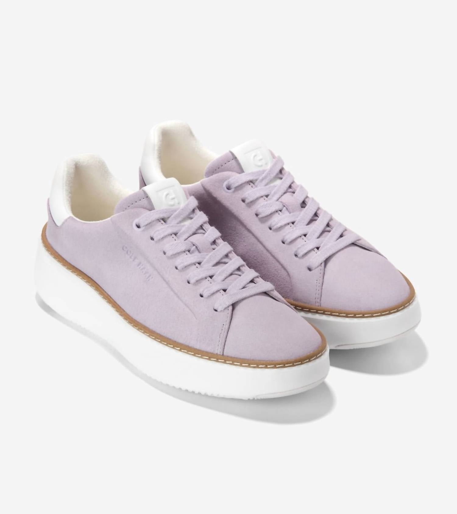 When fashion and function come together seamlessly. Introducing the Women's GrandPro Topspin Sneaker by Cole Haan, a stylish choice for travel and beyond. These sneakers feature a suede upper in Thistle Suede with Metallic Gold accents and a comfortable seven-eyelet lacing system. They boast a durable construction with high-traction rubber at toe and heel, an EVA midsole, and a GRANDFØAM cushioned footbed, ensuring comfort with every step. Designed for wide feet, it's recommended to size up by half for an optimal fit.