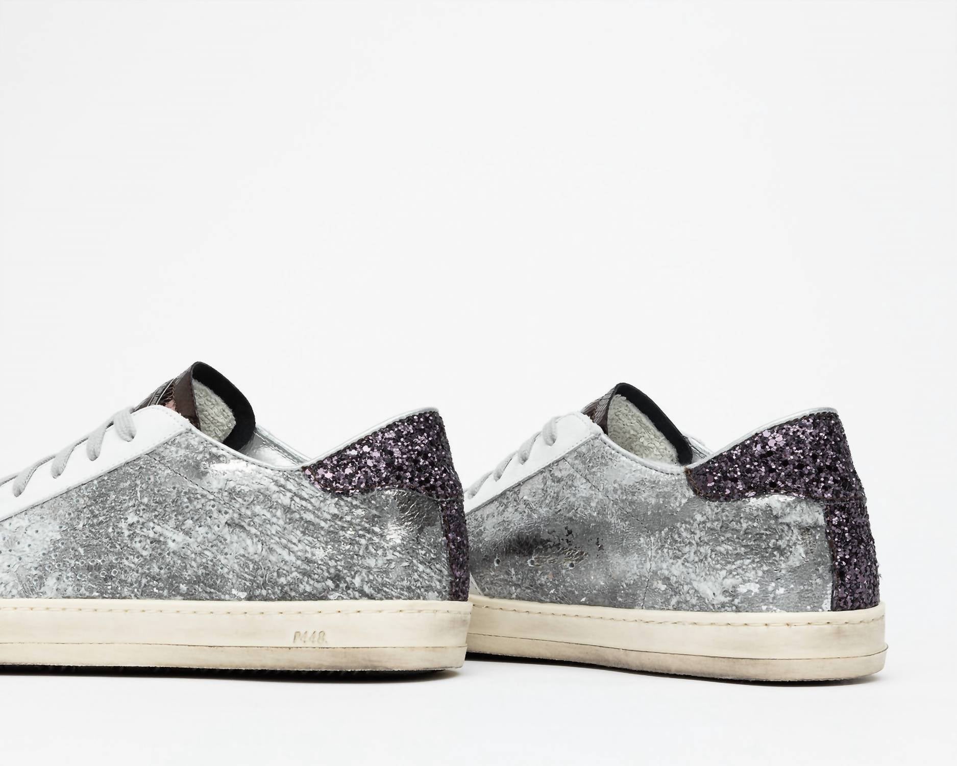 Cute, functional, and comfortable. These sneakers check all the boxes. Step out in style with the Women's Cola Sneakers by P448, designed for everyday wear. These shoes feature a grey distressed suede upper with metallic silver foil and a unique metallic cola snake-embossed leather tongue and toe. Accented with an ivory nubuck trim and plum glitter heel tab, they boast grey cotton laces and a P448 customized rubber cupsole for comfort. Made in Italy, these sneakers fit true to size and are ideal for adding a casually cool kick to your collection.