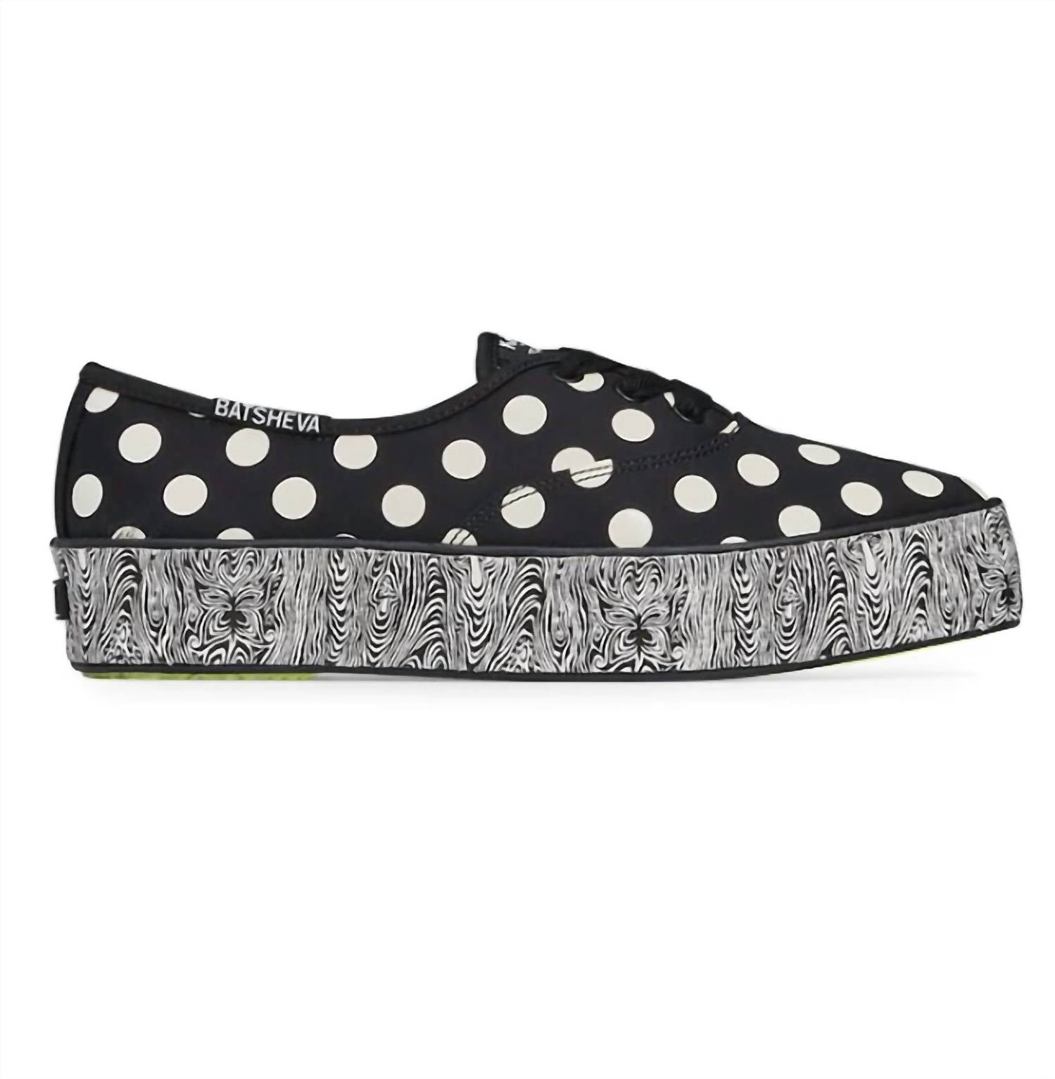 Get your daily steps in with these adorable sneakers. Polished pointed-toe platform sneaker. Bespoke prints with vibrant color and retro-inspired texture. Vibrant green mesh, embroidered polka dot pattern. Dot texture on rubber foxing. Combines the height of a heel, comfort of a sneaker, and chic aesthetic of a pointy pump.