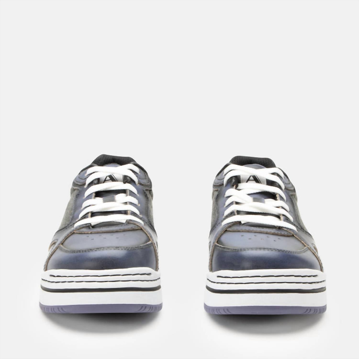 Get your daily steps in with these adorable sneakers. Introducing the Women's Alyster Sneakers by Alegria, a chic choice for fashion-forward individuals. With a sleek Blue Black leather and washed canvas upper, these lace-up sneakers are both stylish and practical. The round toe design and lightweight EVA rubber slip-resistant outsole offer comfort, with a low heel height of 1.5 inches providing support for your adventures. Perfect for those seeking fashionable footwear that doesn't compromise on functionality.