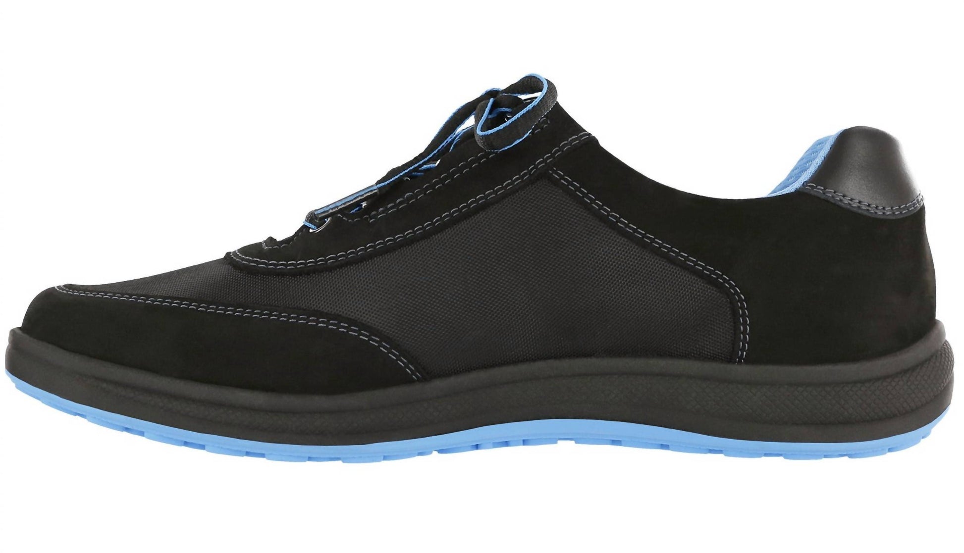 Step into ultimate comfort and style with the Women's Sporty Sneaker by SAS in classic black. Handcrafted with a genuine leather upper and breathable nylon, this versatile sneaker features SAS EZ Laces™ for an adaptable fit and a removable SAS Contoured Everbounce™ Foot Bed for personalized support. With TRIPAD® Technology and a dual-density sole, it delivers unmatched stability and shock absorption, perfect for keeping you active throughout the day. The modern 1.5-inch flat heel makes it an excellent choice for a summer athleisure look or fitness outings.