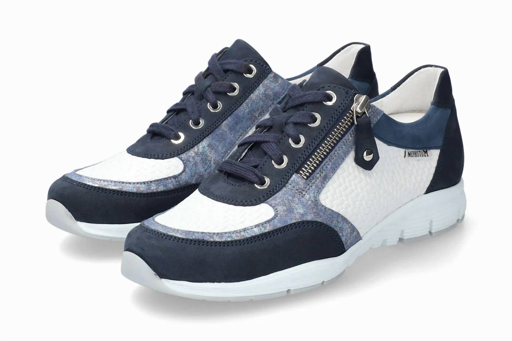 Get your daily steps in with these adorable sneakers. Introducing the Women's Ylona Zipper Sneaker by MEPHISTO, crafted in stylish Jeans Blue for the modern woman. These sneakers offer ultra-lightweight comfort with a full-grain leather composition and leather lining that ensures a healthy shoe environment. The convenient side zip closure complements traditional laces, making it easy to slip on. Featuring SOFT-AIR technology and a SHOCK-ABSORBER outsole, this sneaker guarantees an effortless walk with reduced impact. Available in standard width and designed with a round toe and flat heel under 1", these sneakers are ideal for all-day wear.