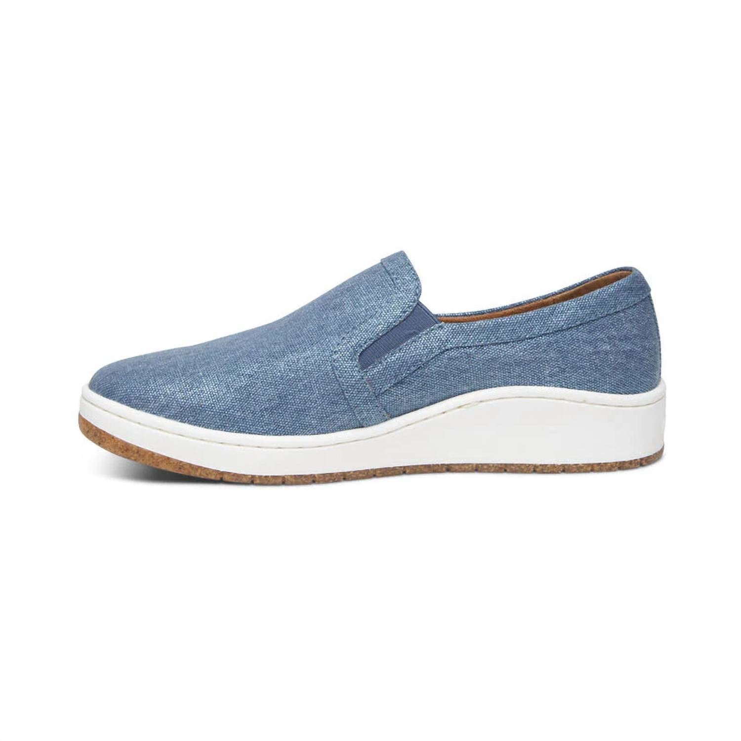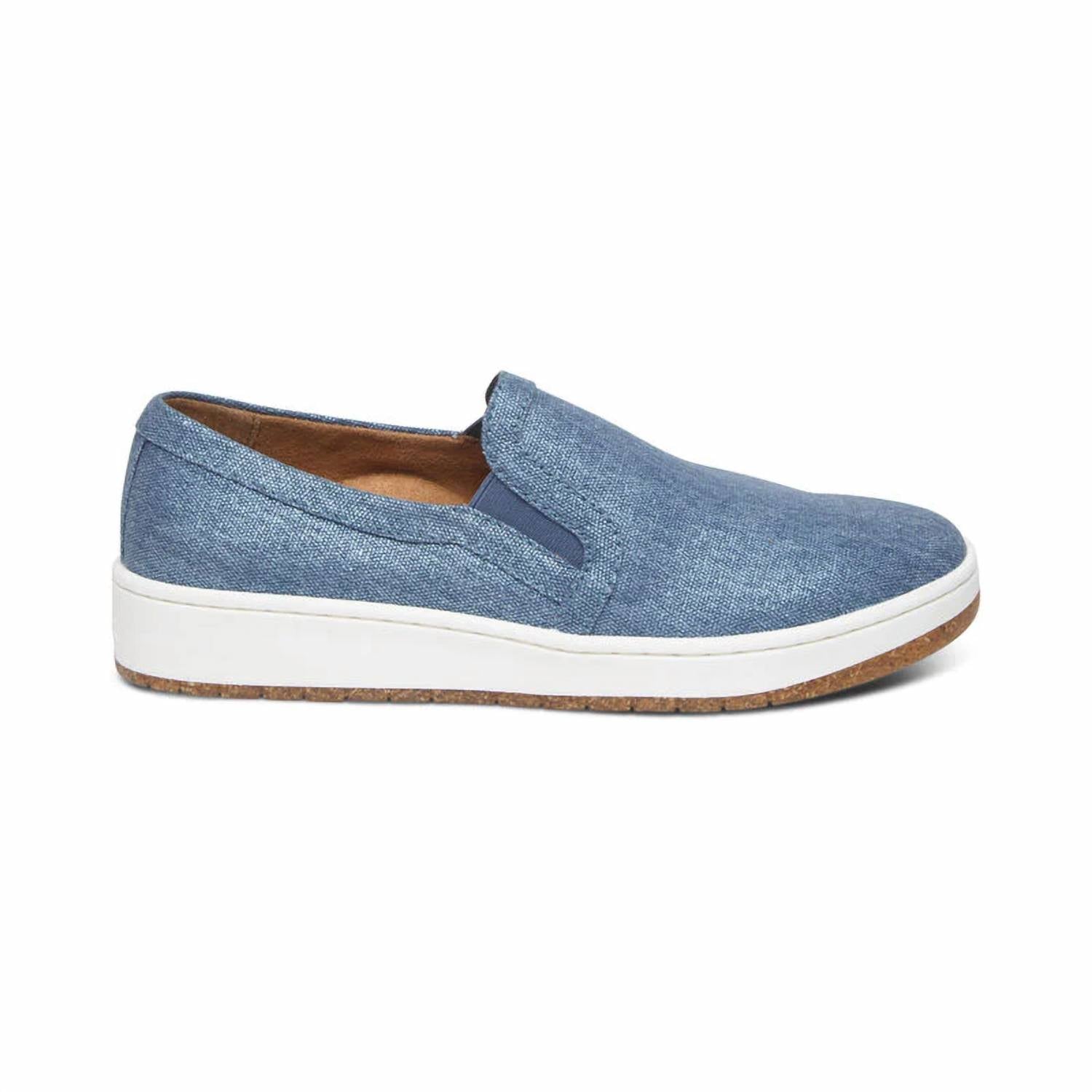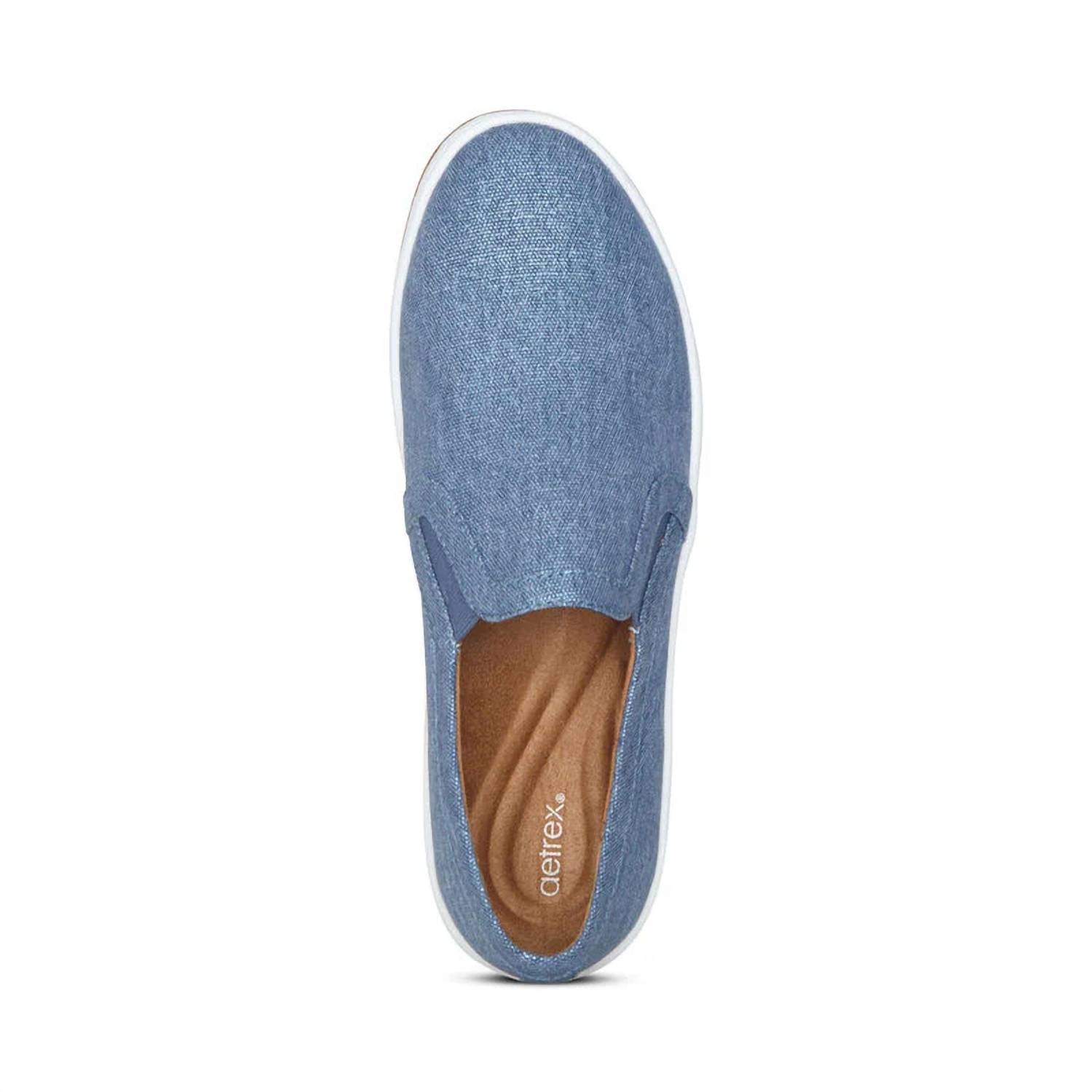 When fashion and function come together seamlessly. Slip into effortless style with the Women's Cameron Slip-on Sneaker by Aetrex, featuring a denim/taupe shimmery canvas upper that delivers both fashion and function. The midsole is constructed from rubber, while the outsole is a blend of cork and rubber for unmatched comfort and durability, complemented by a padded heel for extra cushioning. Its medial stretchy gore ensures easy on and off, along with a .75" flat heel to keep your steps light and balanced. Designed for travel and spring adventures, this minimalist sneaker accommodates with a medium width and removable insole, perfectly fitting any occasion.