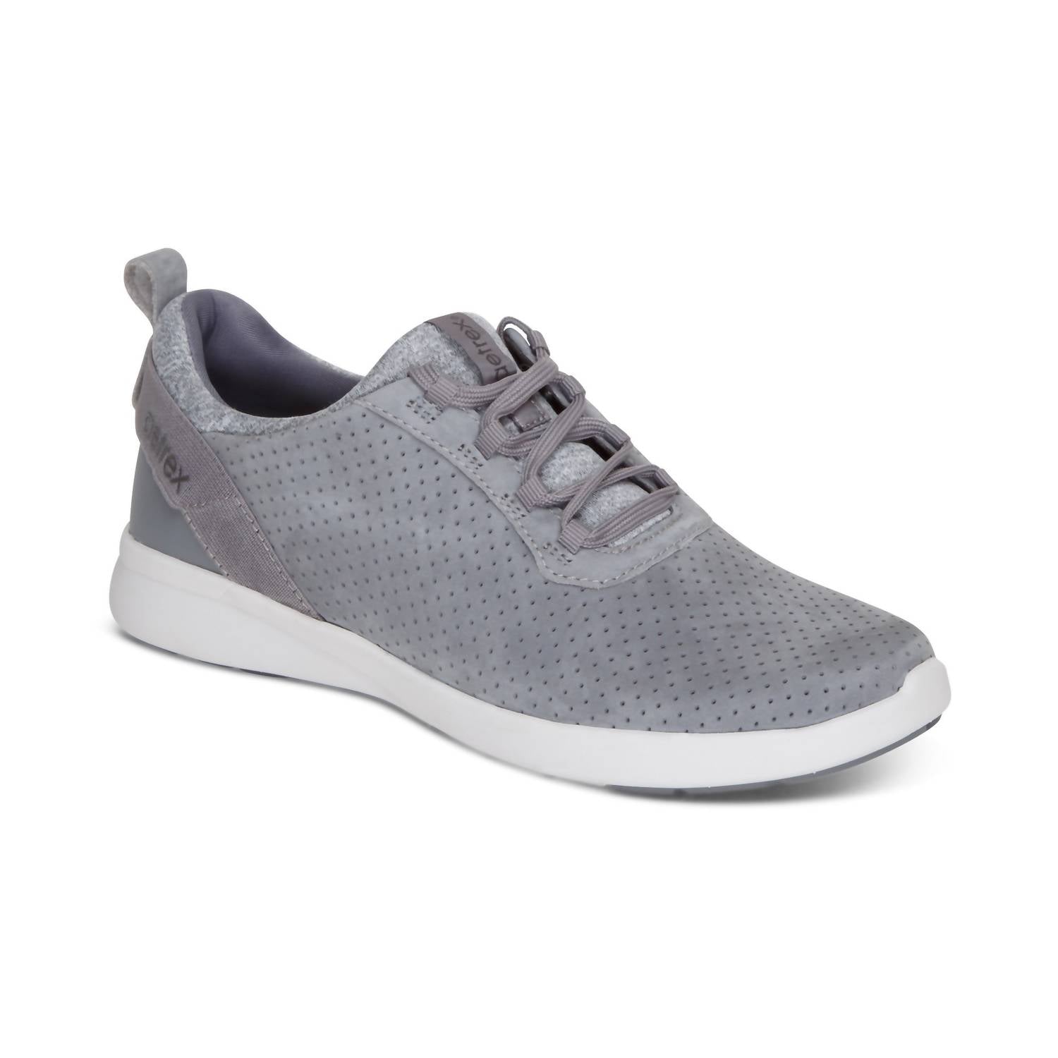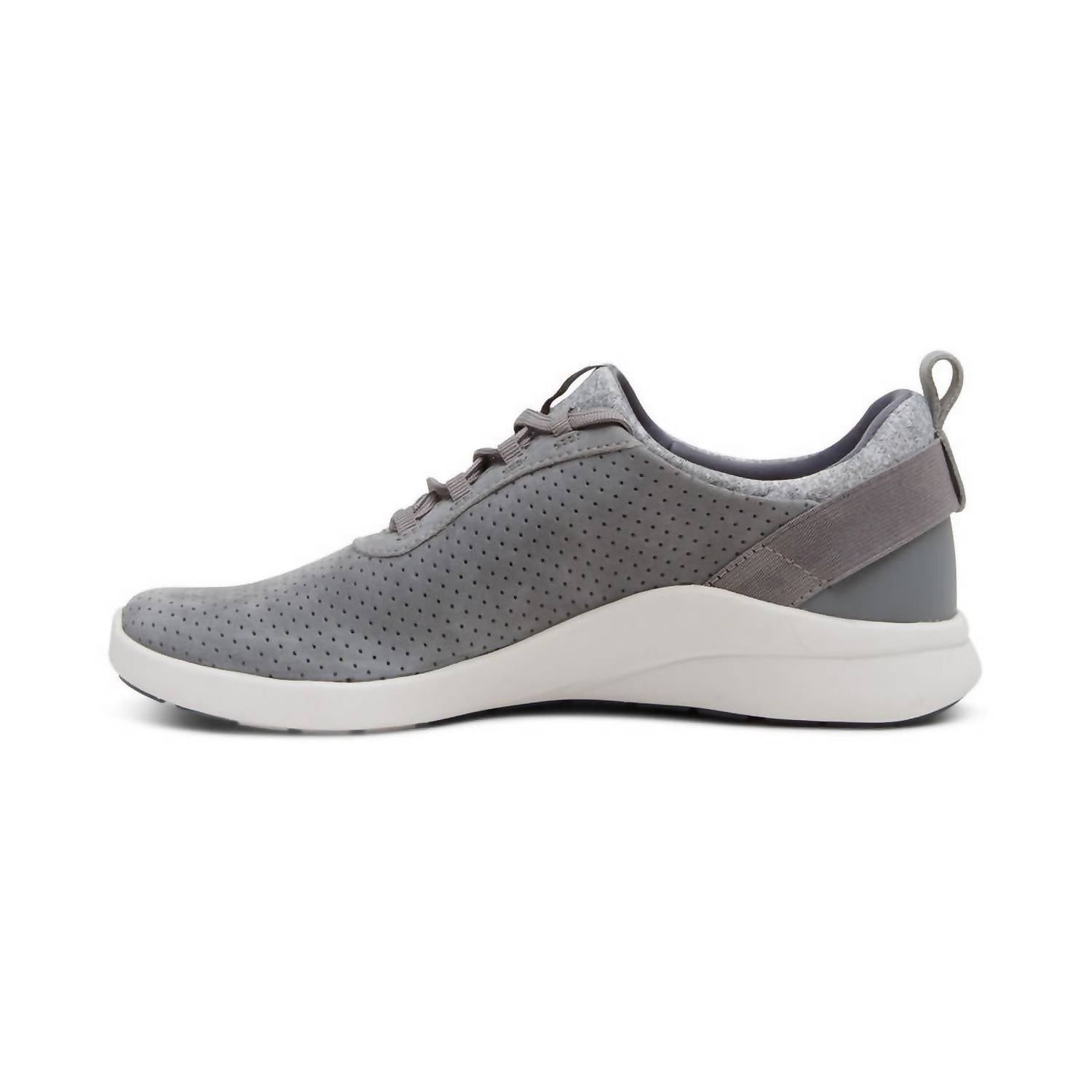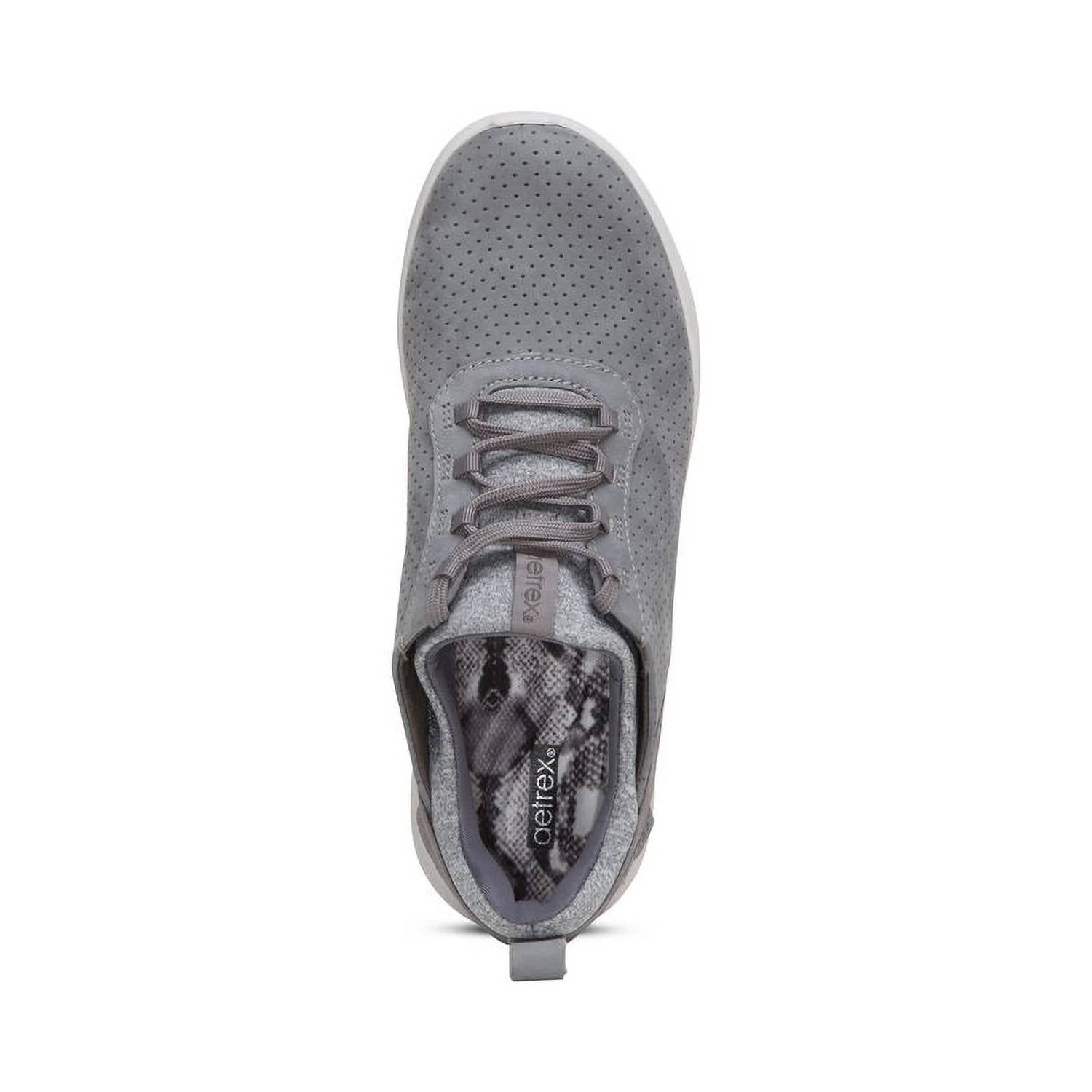Elevate your travel ensemble with the Women's Kora Lace Up Sneaker by Aetrex, expertly crafted from genuine leather in a stylish grey hue. Built for comfort, these sneakers feature a stretchy topline, adjustable laces, and a pull tab for easy wear. Engineered with Aetrex Orthotic System, the shoe includes arch support and UltraSky™ cushioning for superior relief and high energy return. With a removable insole, lightweight EVA midsole, and 0.65” flat heel, it's a perfect blend of streetwear trend and comfort. Ideal for spring adventures, these medium-width sneakers effortlessly combine style and support.