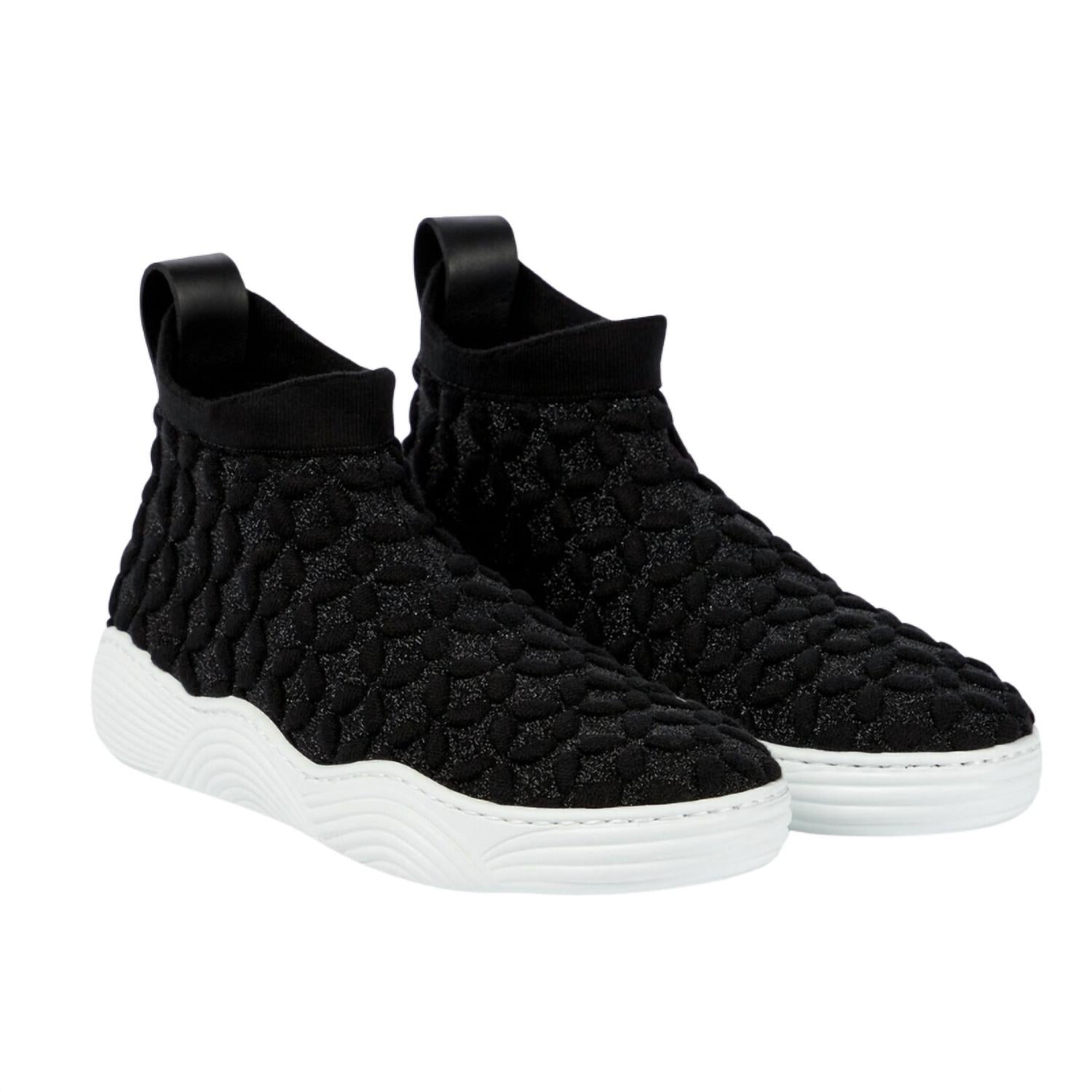 Step up your style game. Crafted in Italy. Boast a signature stretch-knit fabric adorned with the iconic Petale motif, enhanced by leather trim for added luxury. Round toe and rubber sole ensure comfort and durability, making them perfect for transitioning from day errands to evening adventures. Embrace the contemporary fall streetwear trend with these black and white sneakers, ideal for travel and leisurely outings.