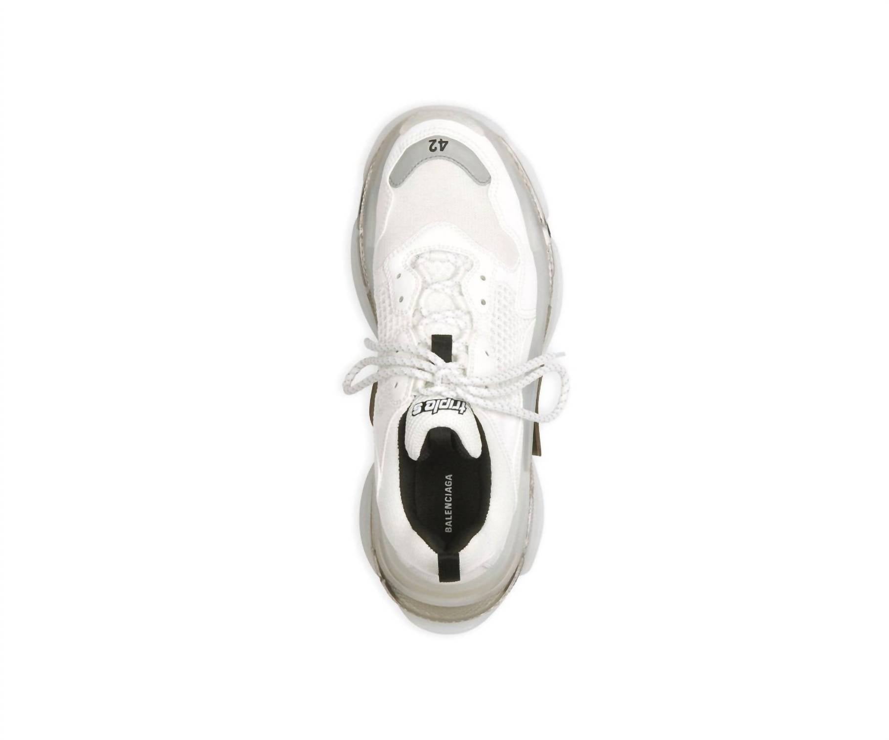 When fashion and function come together seamlessly. Introducing the Women's Triple S Sneakers by Balenciaga, a standout choice for the summer season, blending style with cutting-edge technology. With a complex 3-layered outsole featuring Clear Sole technology and a TPU injected air bubble, these sneakers offer enhanced comfort and a lighter feel. Made in China from a nylon blend composition of 60% polyurethane, 28% polyester, and 12% nylon, they feature an athletic lacing system, embossed and embroidered logos, and bicolor laces with an additional pair included. Keep them pristine with a simple wipe from a soft, dry cloth.