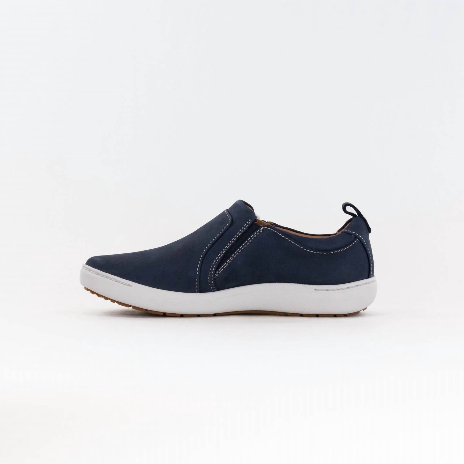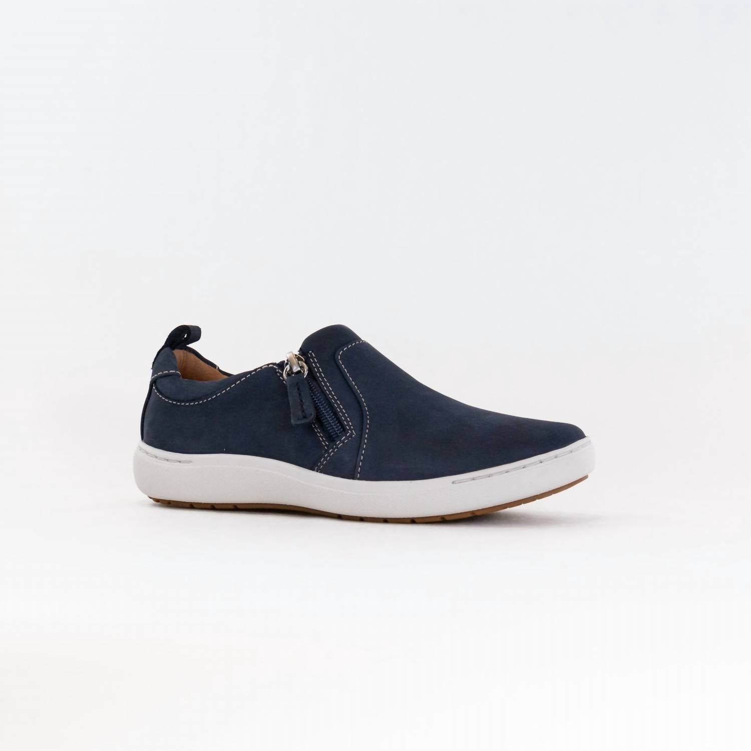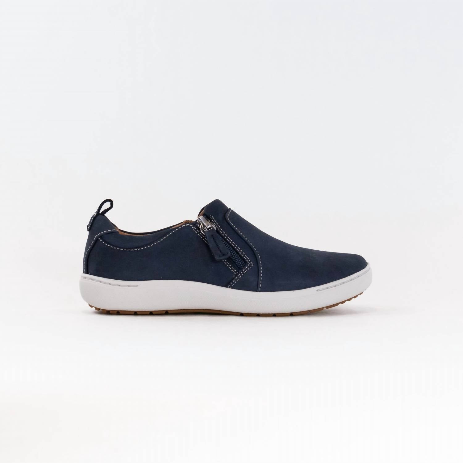 Discover the Women's Nalle Lilac Shoe by Clarks, a stylish addition to your fall wardrobe. Crafted with a durable stone nubuck upper and a breathable leather lining, this casual shoe offers exceptional comfort. It features an easy-access zip for convenience and a molded, recycled-content Contour Cushion footbed that supports each step, combined with a lightweight EVA midsole for shock absorption. The shoe boasts a high-grip, part-recycled rubber sole with a flat heel height of 20mm, perfect for busy days.