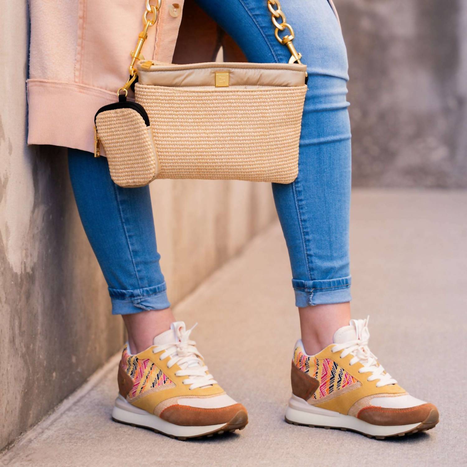 Cute, functional, and comfortable. These sneakers check all the boxes. Elevate your summer wardrobe with Gioseppo's Women's Morrill Raffia Wedge Leather Shoes, a perfect blend of style and comfort. These sneakers are crafted with a unique mix of leather, linen, and woven rattan, and feature a 2" wedge heel for added height. They ensure comfort with a padded insole and EVA midsole while offering stability with a heel stabilizer. Ideal for narrow feet, these shoes are a stylish travel companion, available in the color Mostaza with a round toe design.