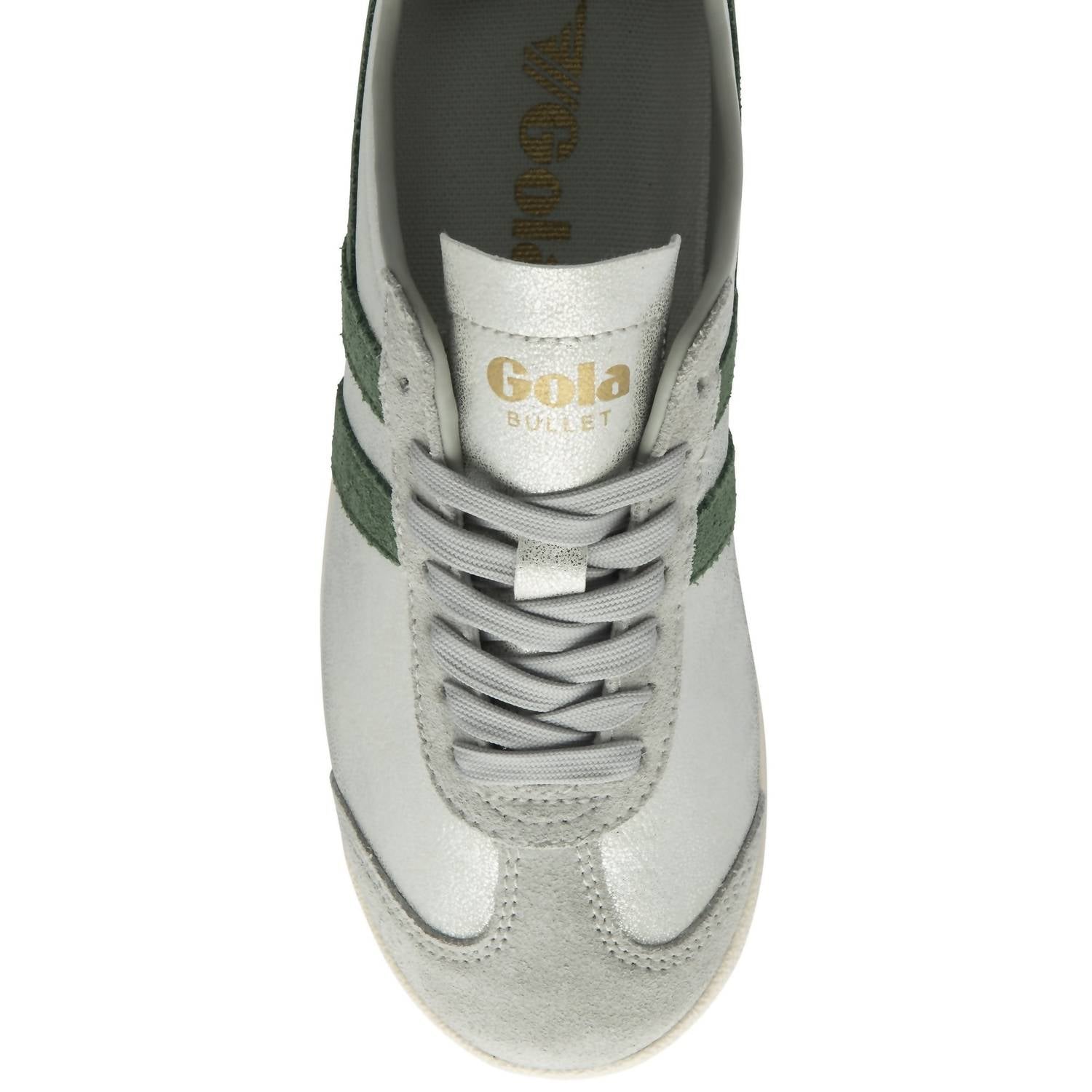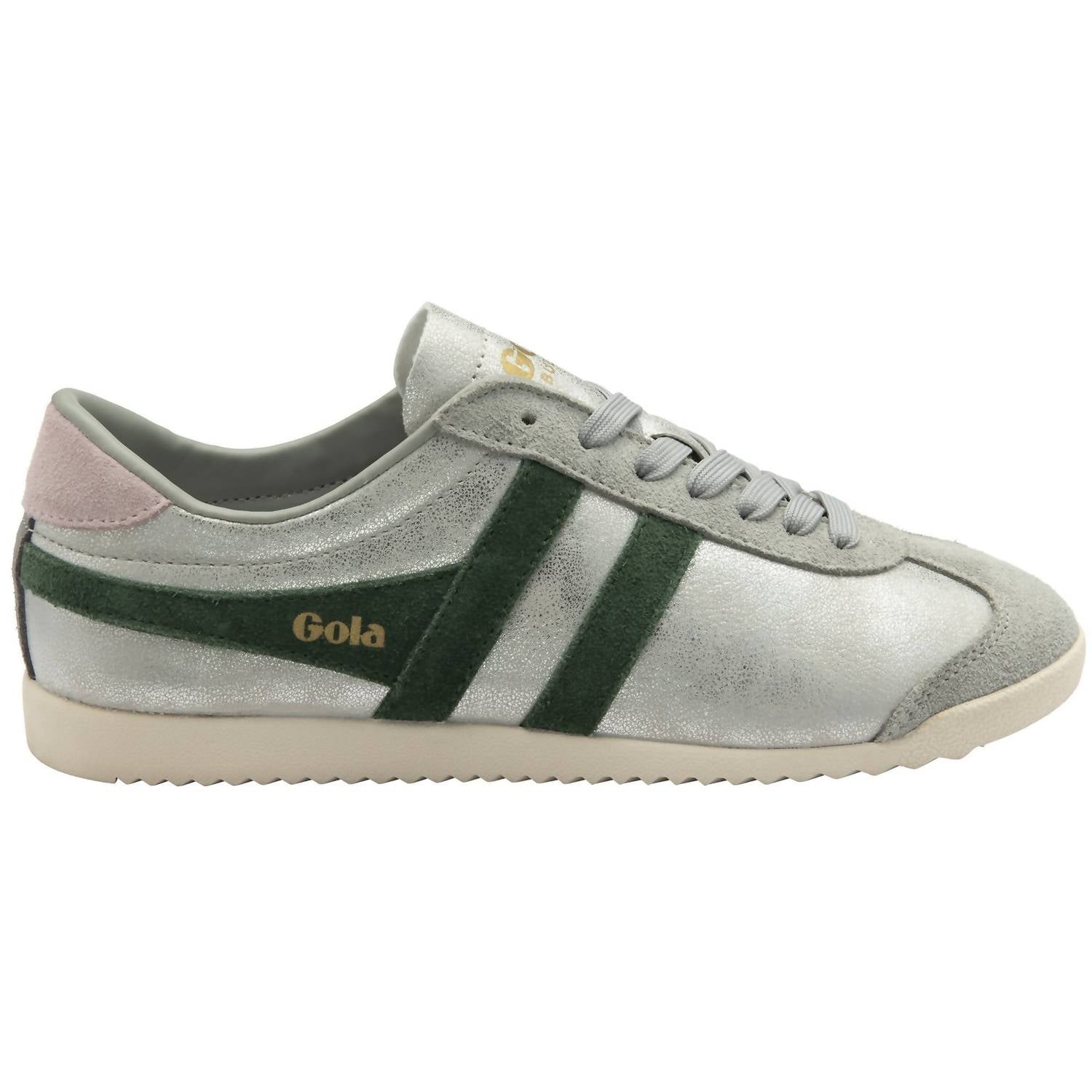 Get your daily steps in with these adorable sneakers. Step into the timeless elegance of the Women's Bullet Blaze Sneakers by Gola, crafted for the fashion-forward woman who appreciates retro flair. This sneaker showcases a metallic silver upper with a classic lace-up design, complemented by a round toe and flat heel for all-day comfort. Originally designed in 1976, its low-profile and sleek style makes it perfect for enhancing your streetwear wardrobe, adding a chic edge to any summer vacation outfit. Embrace the iconic Gola branding and evergreen wingflash details, adding a sophisticated touch to your collection.