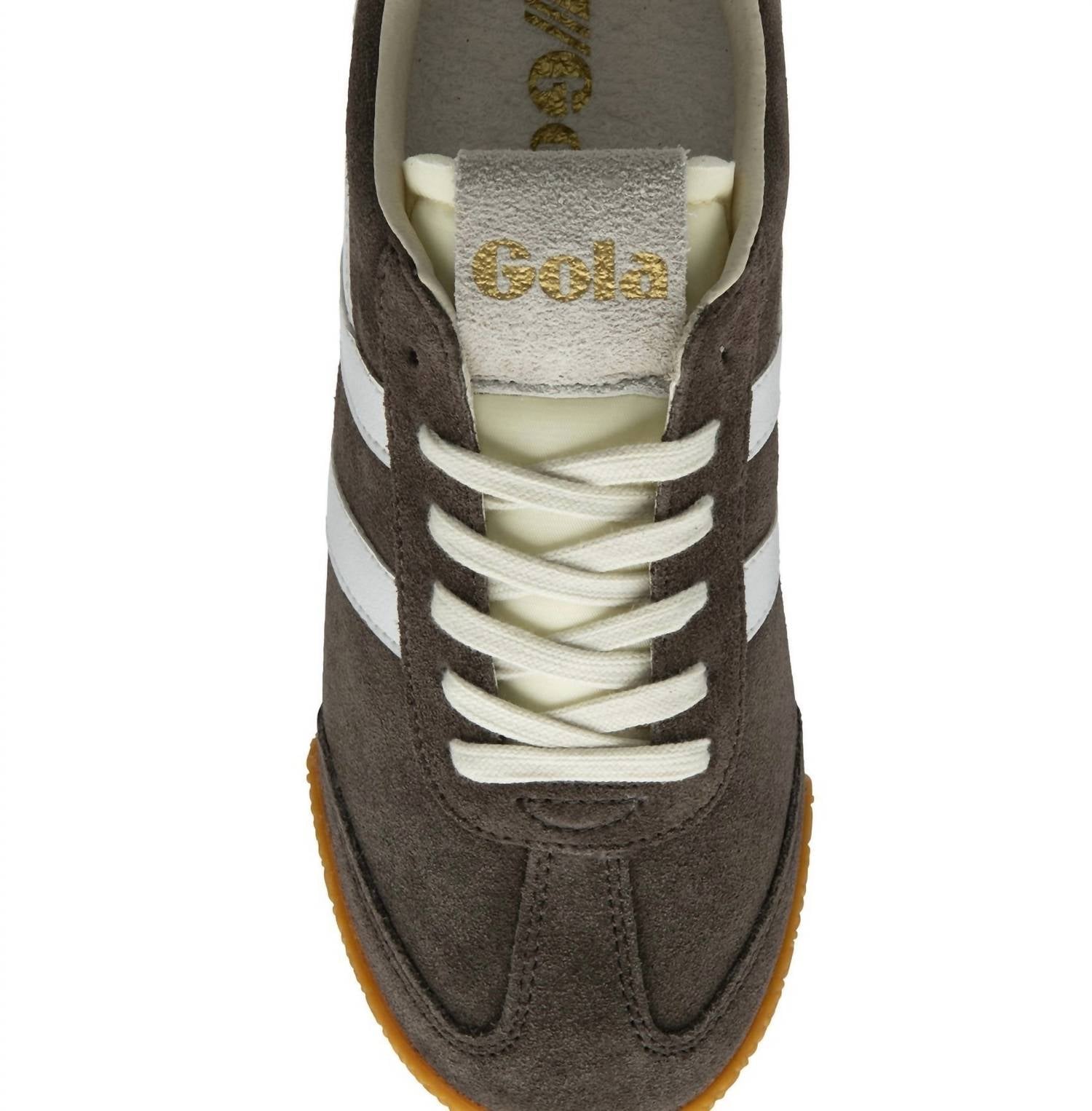 When fashion and function come together seamlessly. Step into a perfect blend of vintage and modern with the Women's Elan Trainer Sneaker by Gola in Mocha White. This sneaker features a suede upper with a gum outsole and lace-up closure, offering a nostalgic nod to classic gym styles. Designed with a round toe and flat heel, it provides both comfort and style, making it an ideal choice for vacation wear. A new take on Gola’s flagship Harrier style, the Elan includes an additional heel tab for an appealing color pop.