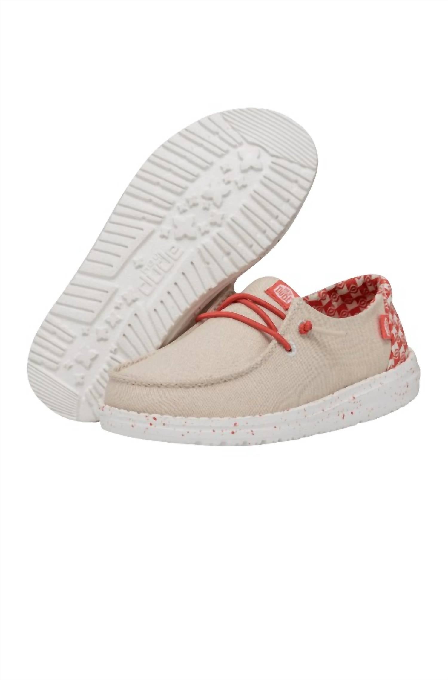 Get your daily steps in with these adorable sneakers. Introducing the Wendy Youth Batik Geo Slip-on Shoes by HEY DUDE, a perfect blend of style and comfort for little kids. Designed with a textile upper and a lightweight outsole, these sneakers offer a cozy fit with their removable foam insoles. The elastic laces and easy-on system ensure hassle-free wear, making them travel-ready for any adventure. With a round toe shape and a flat heel, these tan and coral shoes are ideal for minimalist spring outings, including Easter celebrations.