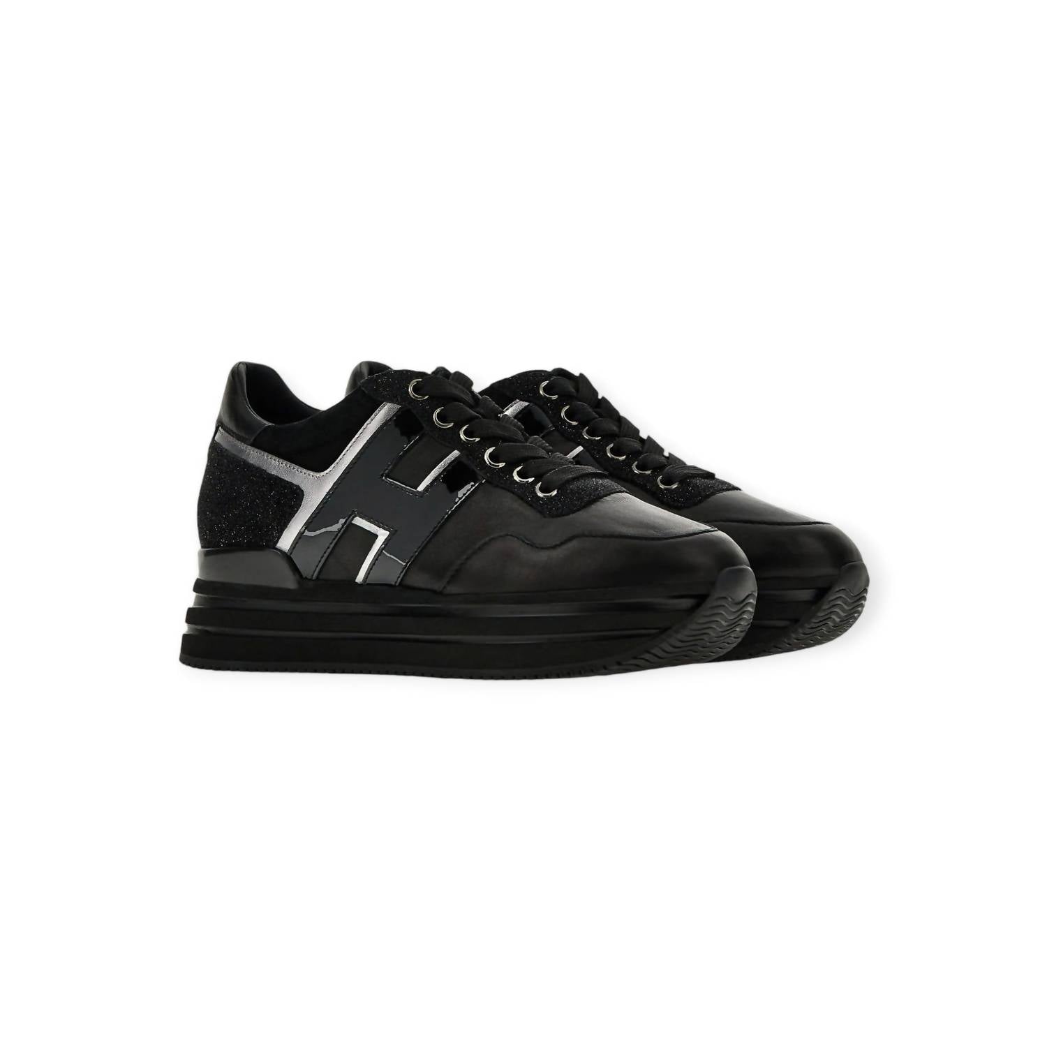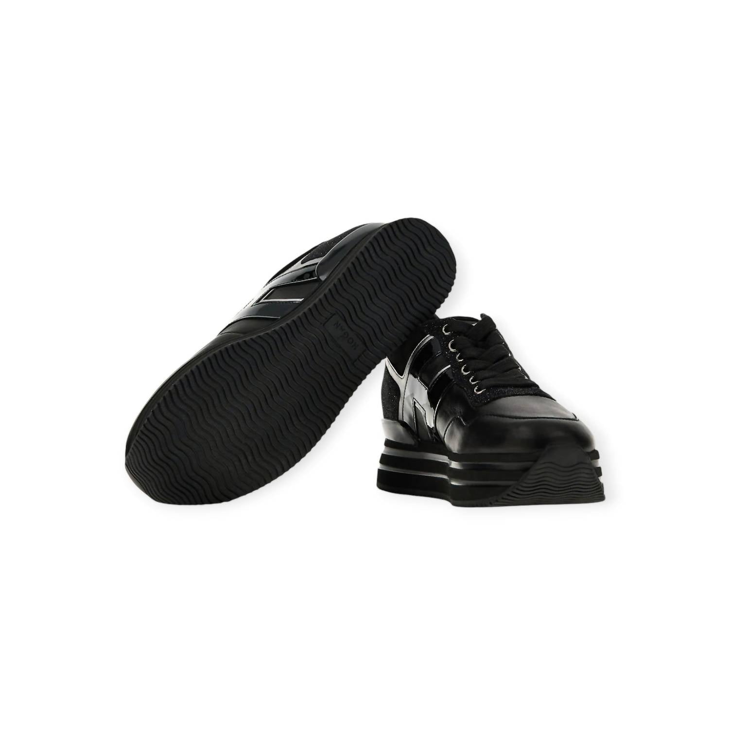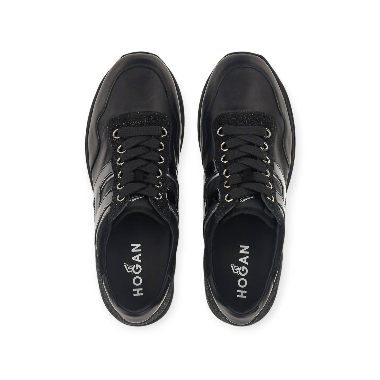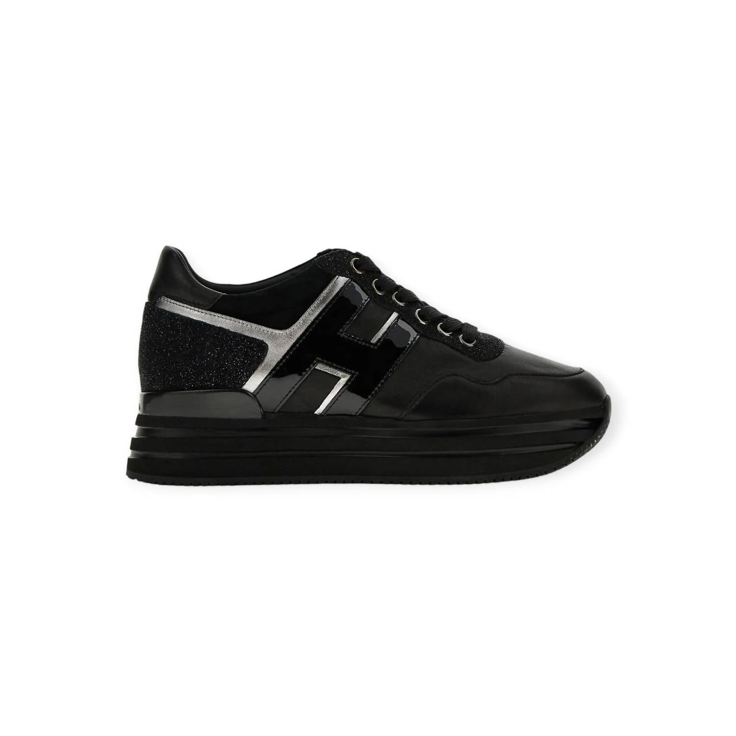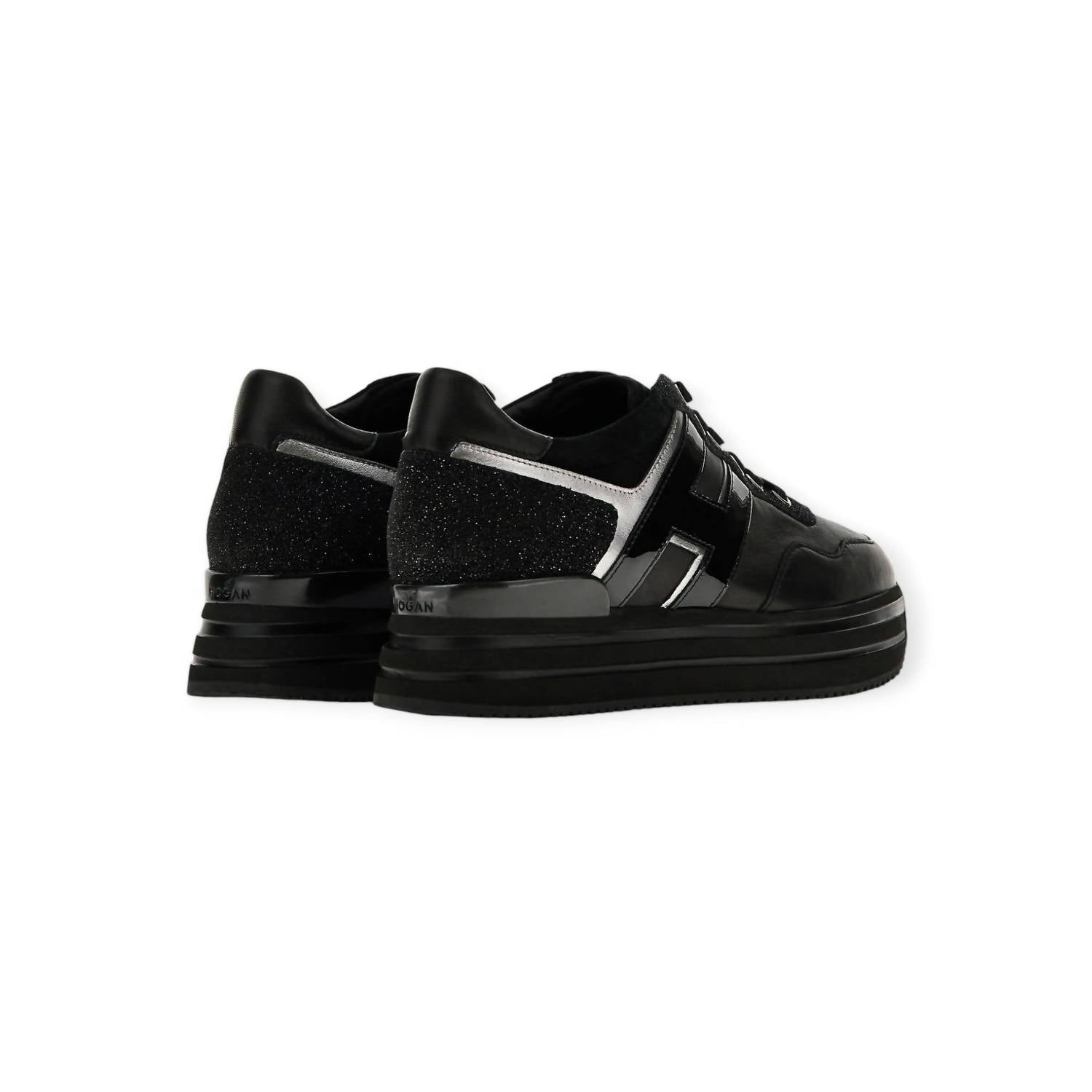 Cute, functional, and comfortable. These sneakers check all the boxes. Step up your style game with Hogan's Women's Midi H222 Sneakers, designed for the modern traveler. Crafted in Italy, these sneakers feature a luxe patent leather upper with glitter inserts, complemented by metallic detailing and a distinct patent leather H on the side. The ultralight EVA platform outsole, with a total height of 2.2 inches, adds a touch of glam to your casual streetwear look. Enjoy additional versatility with a removable insole, maintenance and care cards, and extra laces, making them perfect for any fall occasion, including Thanksgiving.