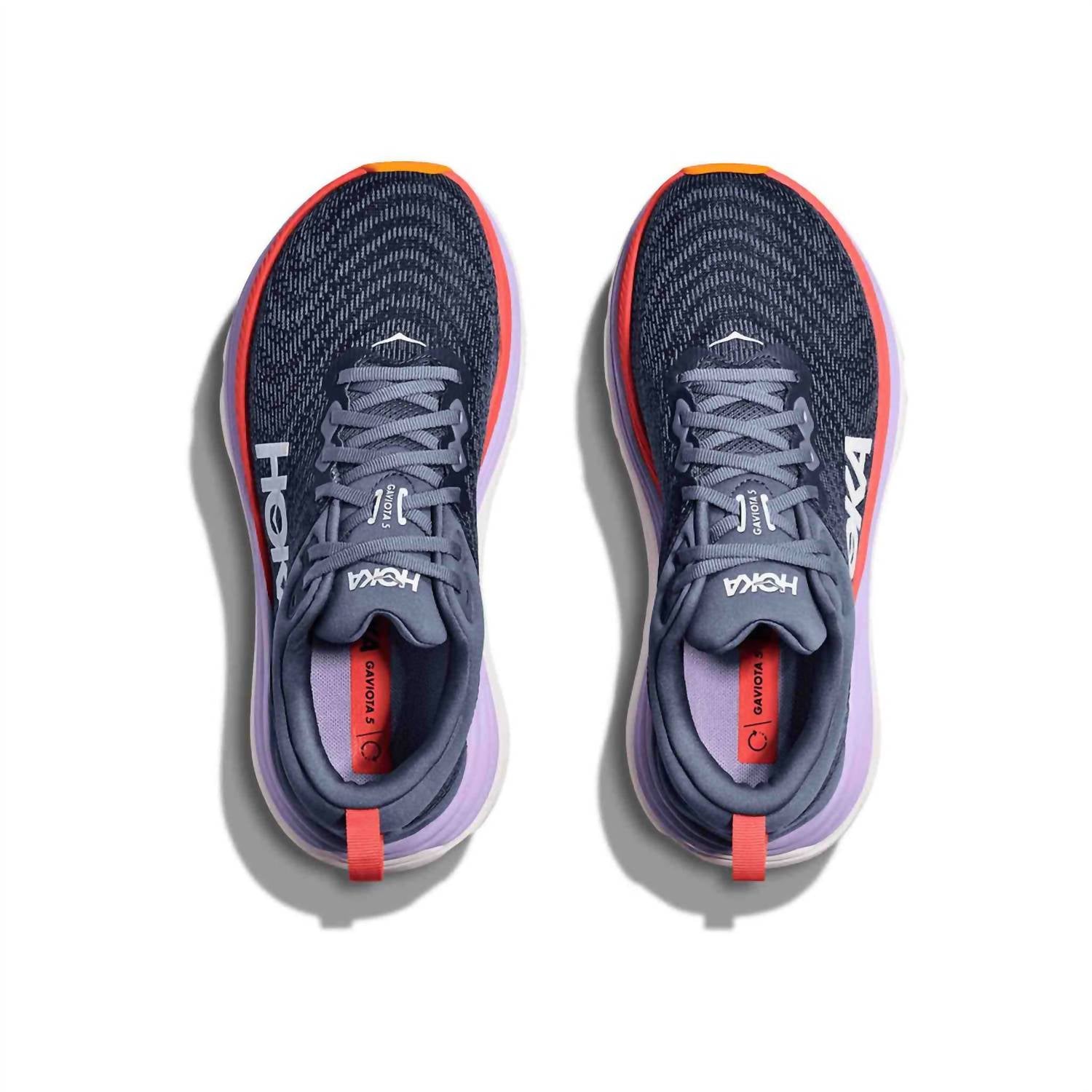 When fashion and function come together seamlessly. Introducing the HOKA Women's Gaviota 5 Sneakers in a striking Anchor Grapefruit color, crafted to perfection for fitness enthusiasts and road runners. These sneakers feature a plush, accommodating fit with an upper crafted from creel jacquard mesh, combining HOKA's stabilizing H-Frameâ„¢ with a broad midsole and outsole for unparalleled cushioning and stability. Equipped with an early stage MetaRockerâ„¢ for efficient movement, the shoe embraces sustainable elements with 100% recycled polyester midfoot brace ghillies. Ideal for athleisure trends, they are perfect for spring workouts or Thanksgiving runs, offering a platform heel style made from durable rubber materials.