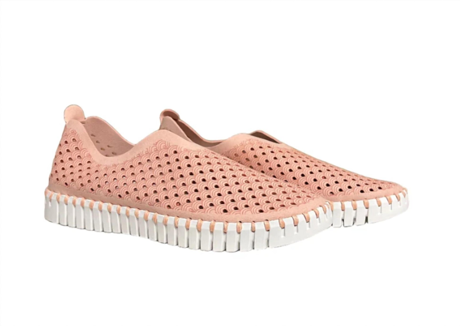 When fashion and function come together seamlessly. Introducing the Women's Slip On by Lines of Denmark, a chic choice for your spring wardrobe. This adobe rose sneaker features scalloped embossing with teardrop perforations, perfect for a streetwear look. Crafted with a round toe and low, flat heel (1 1/4"-2"), it offers all-day comfort ideal for vacation occasions. Enjoy the flexibility of the whipstitched rubber sole, providing ease with every step.